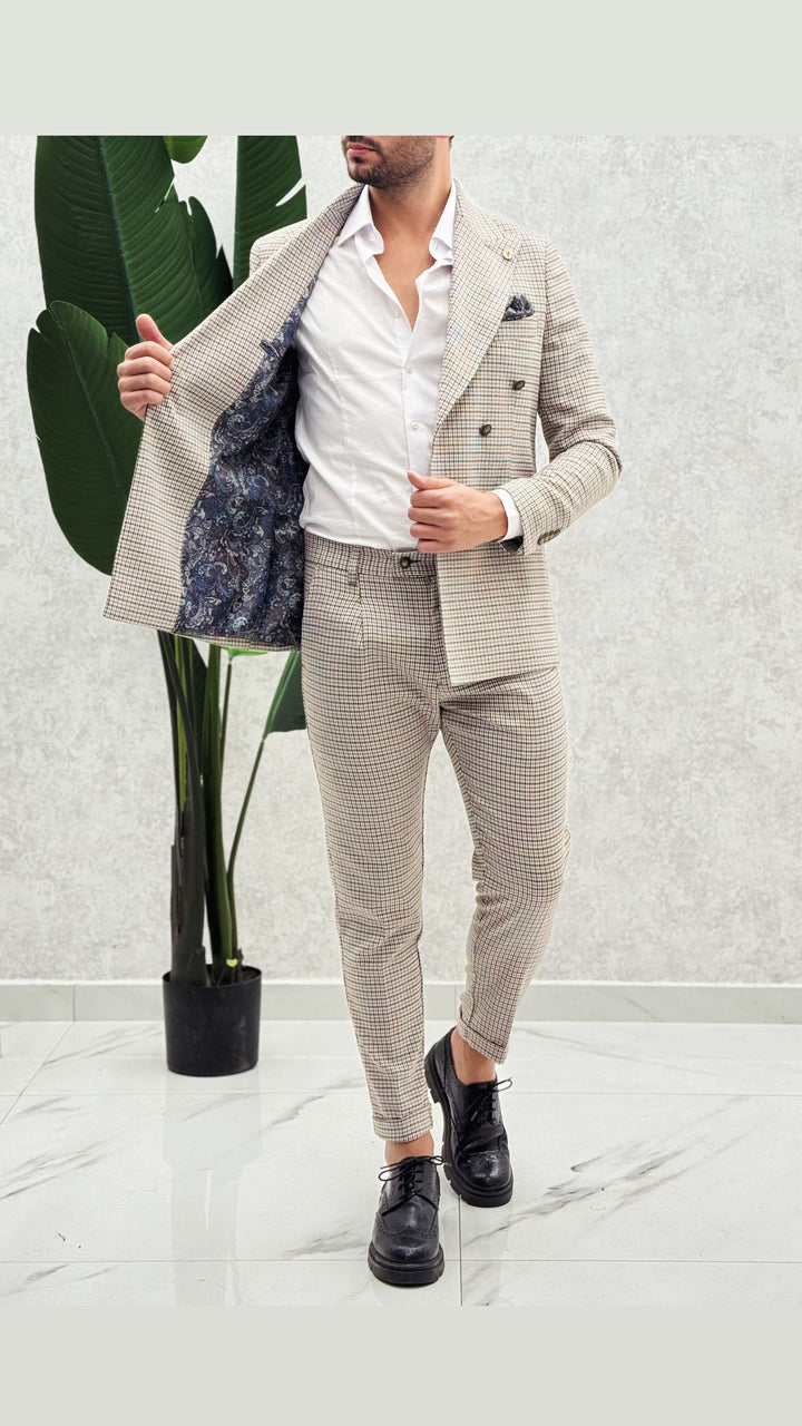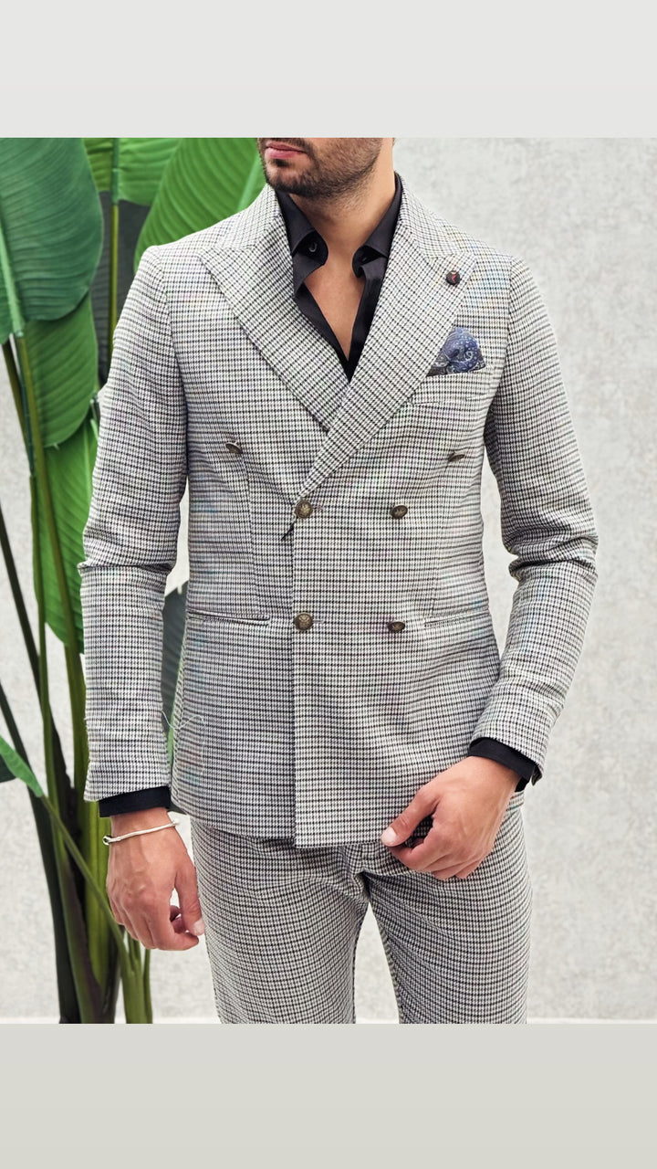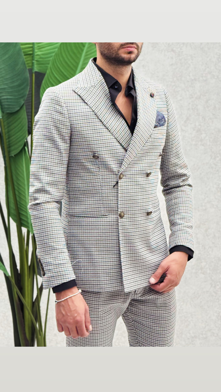 Abito a fantasia con giacca doppiopetto, fodera a fantasia al suo interno , bottone a gioiello, tasca a filo, pochette compresa nel suo taschino, bottone con dettaglio a contrasto sui polsi e fodera a fantasia; pantalone semi vita alta , bottone laterale e tasche a filo con bottone sul retro. Vestibilità slim, il modello 1.76 per 73kg indossa 46