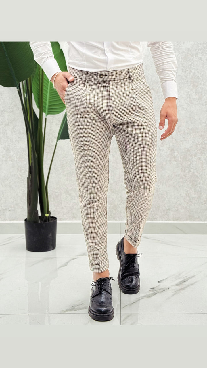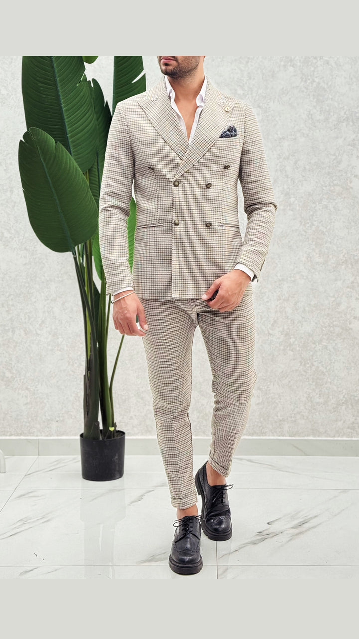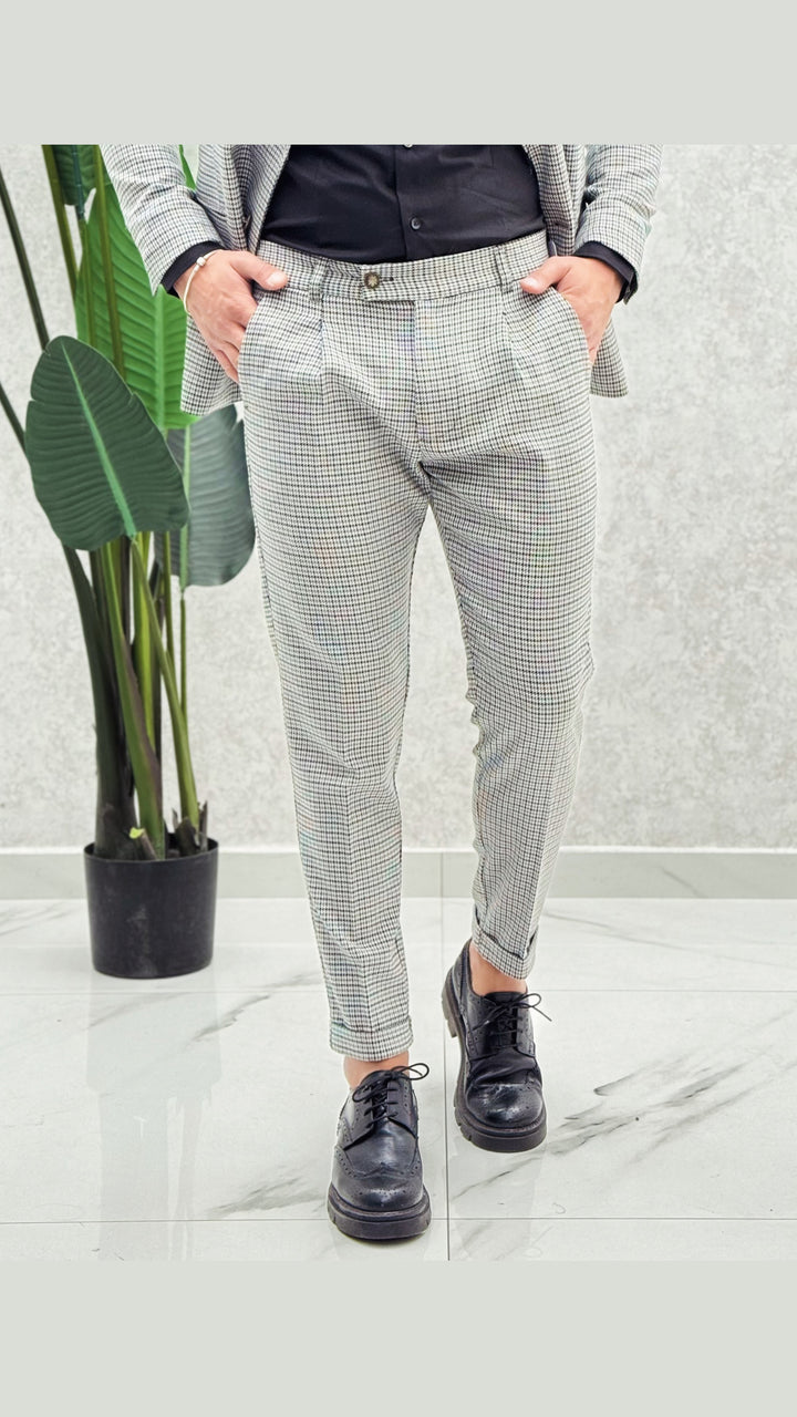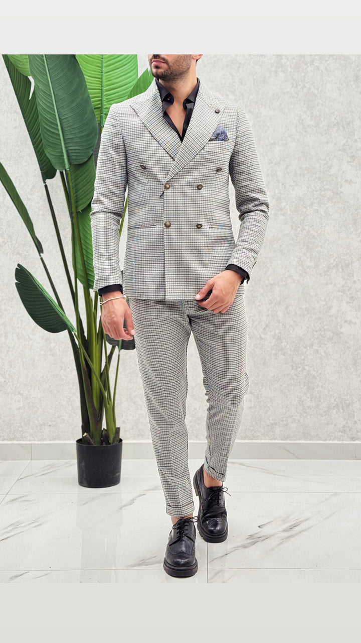 Abito a fantasia con giacca doppiopetto, fodera a fantasia al suo interno , bottone a gioiello, tasca a filo, pochette compresa nel suo taschino, bottone con dettaglio a contrasto sui polsi e fodera a fantasia; pantalone semi vita alta , bottone laterale e tasche a filo con bottone sul retro. Vestibilità slim, il modello 1.76 per 73kg indossa 46