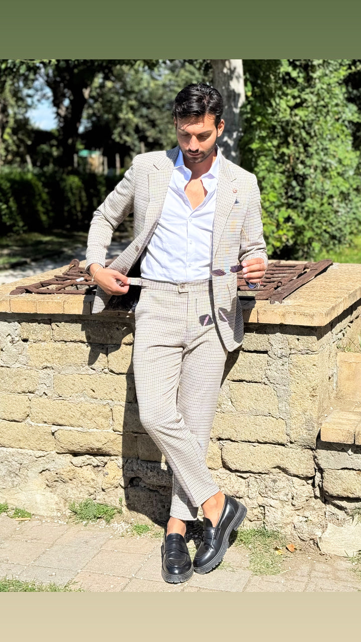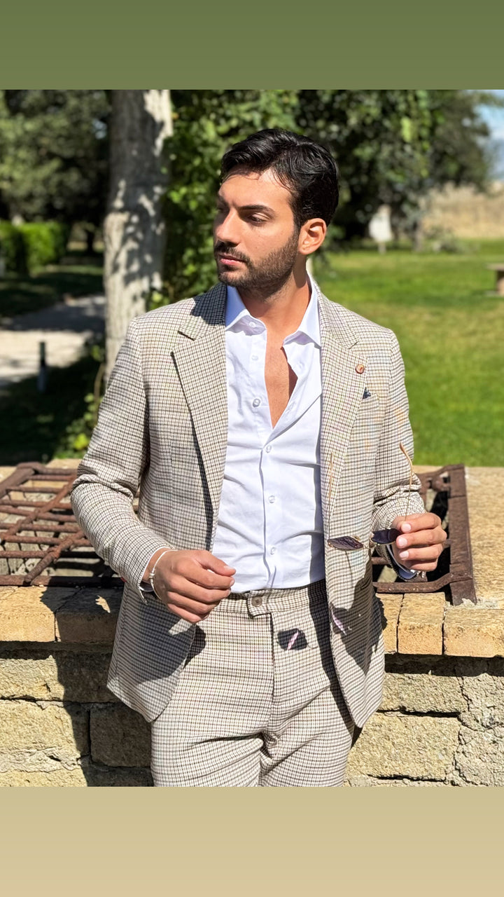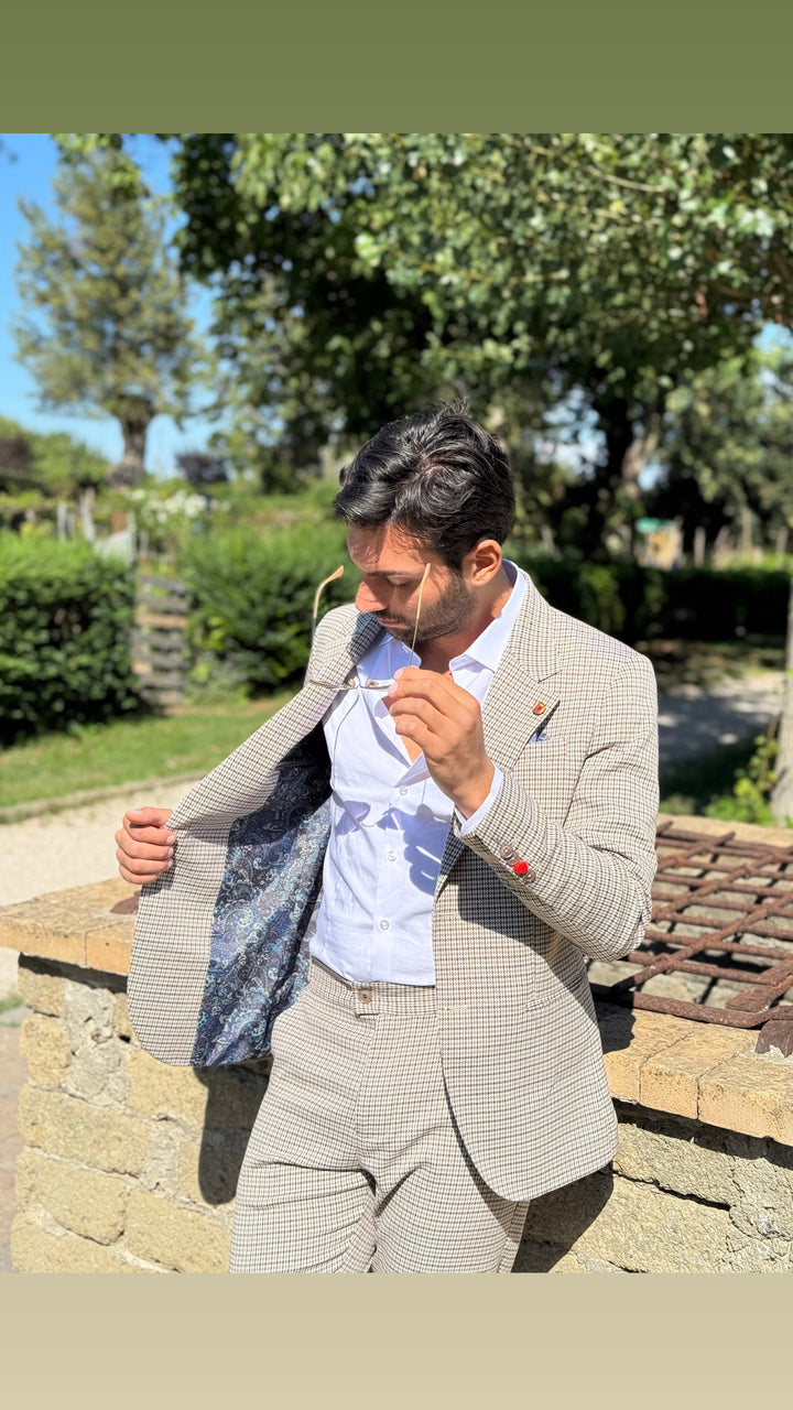 Abito a fantasia con giacca monopetto, fodera a fantasia al suo interno , bottone in tinta, tasca a filo, pochette compresa nel suo taschino, bottone con dettaglio a contrasto sui polsi e fodera a fantasia; pantalone semi vita alta con clip laterali, bottone laterale e tasche a filo con bottone sul retro. Vestibilità slim, il modello 1.76 per 73kg indossa 46