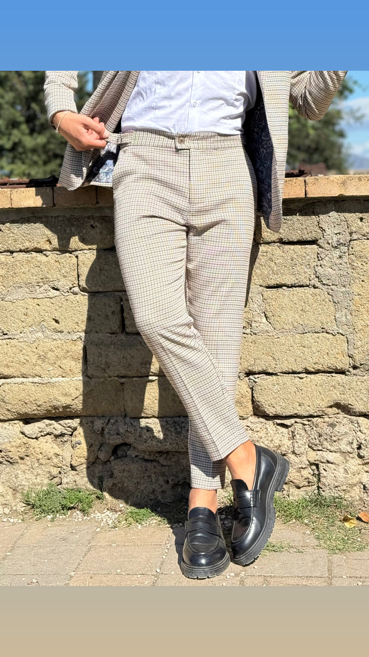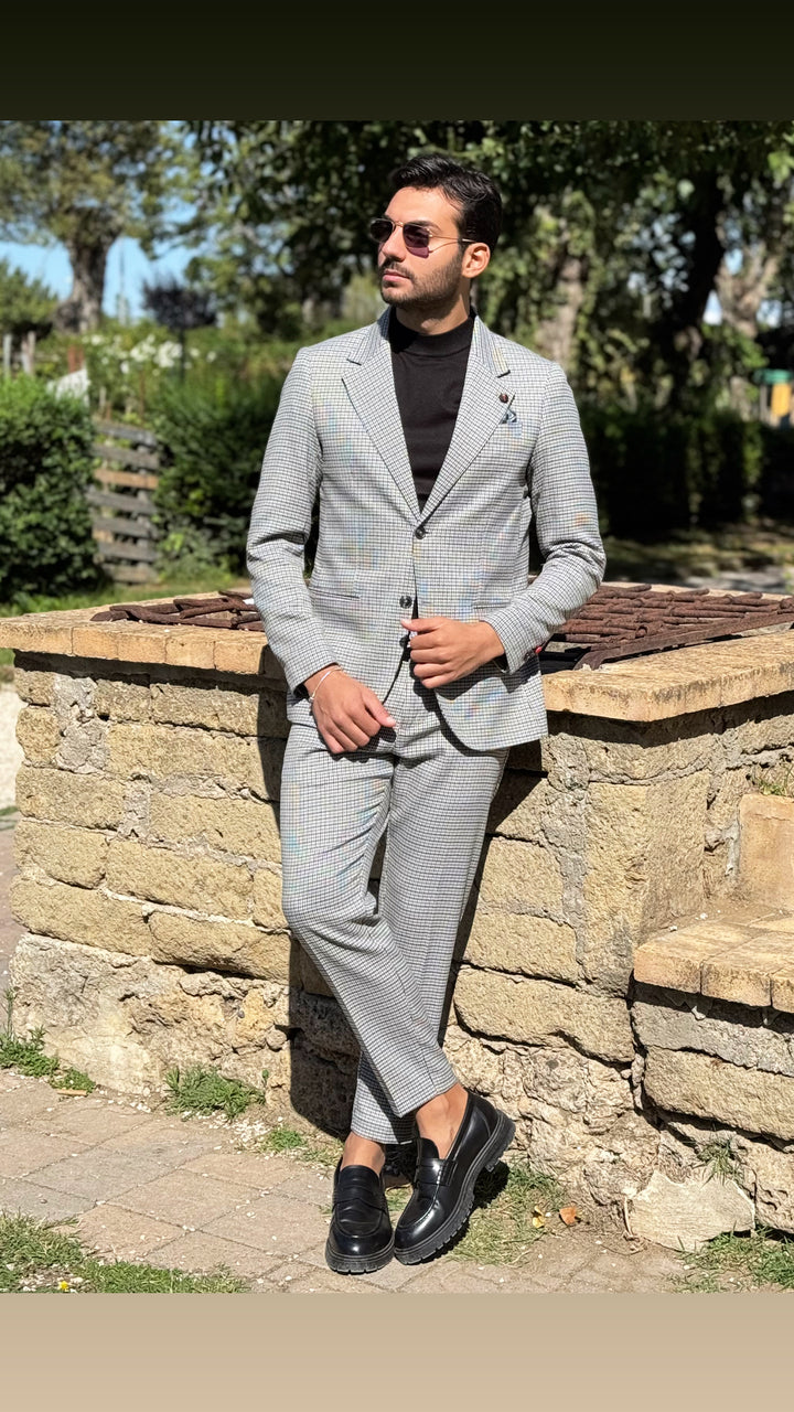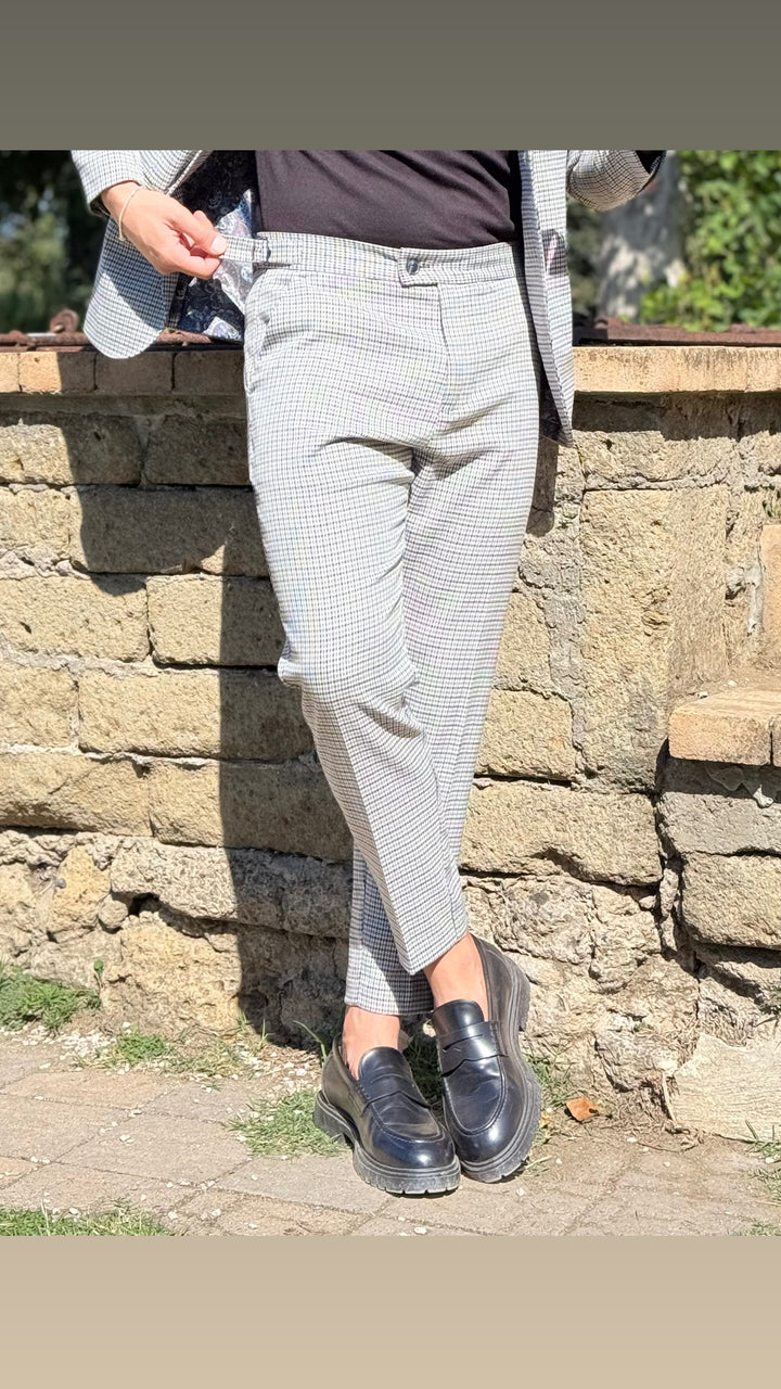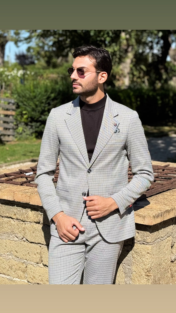 Abito a fantasia con giacca monopetto, fodera a fantasia al suo interno , bottone in tinta, tasca a filo, pochette compresa nel suo taschino, bottone con dettaglio a contrasto sui polsi e fodera a fantasia; pantalone semi vita alta con clip laterali, bottone laterale e tasche a filo con bottone sul retro. Vestibilità slim, il modello 1.76 per 73kg indossa 46