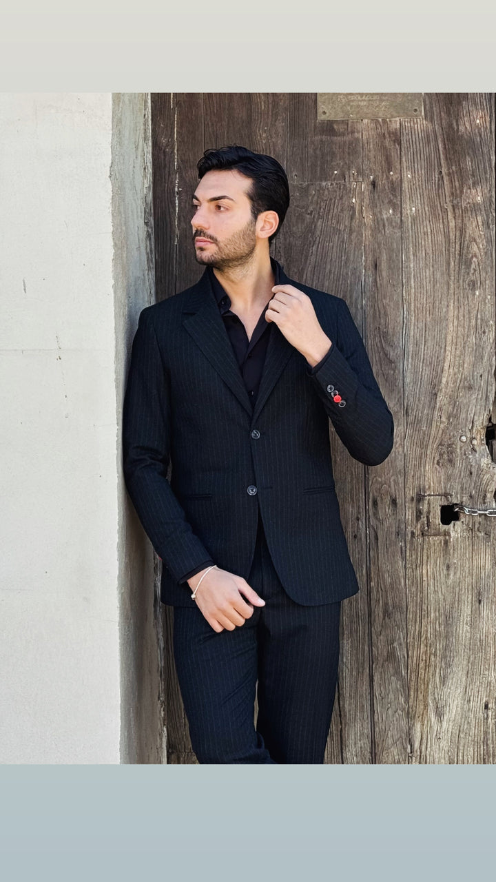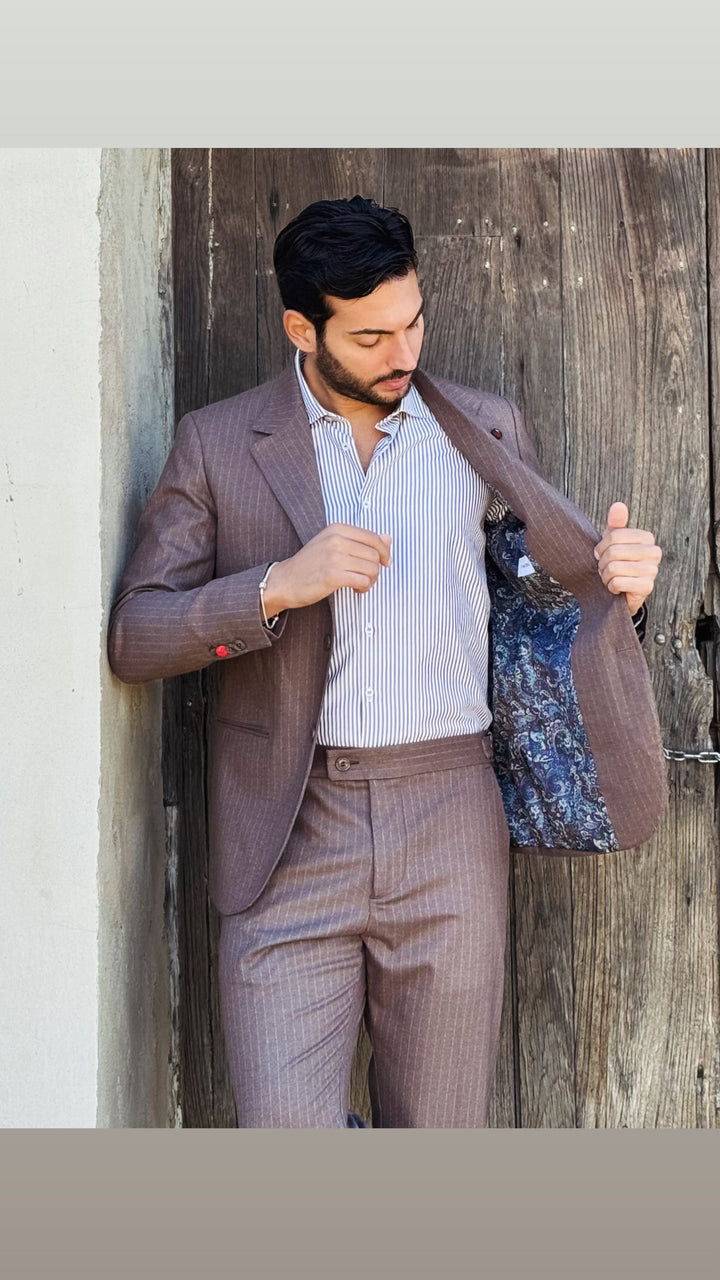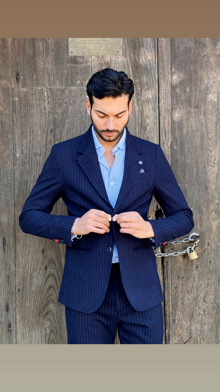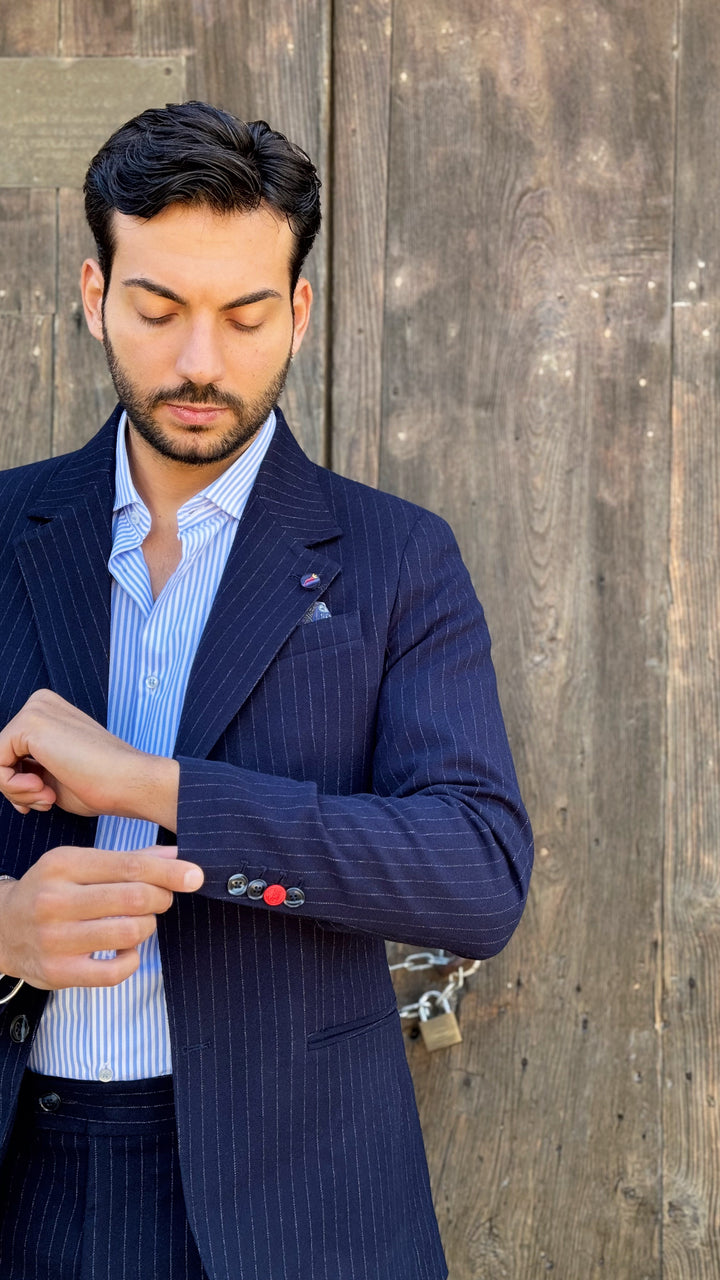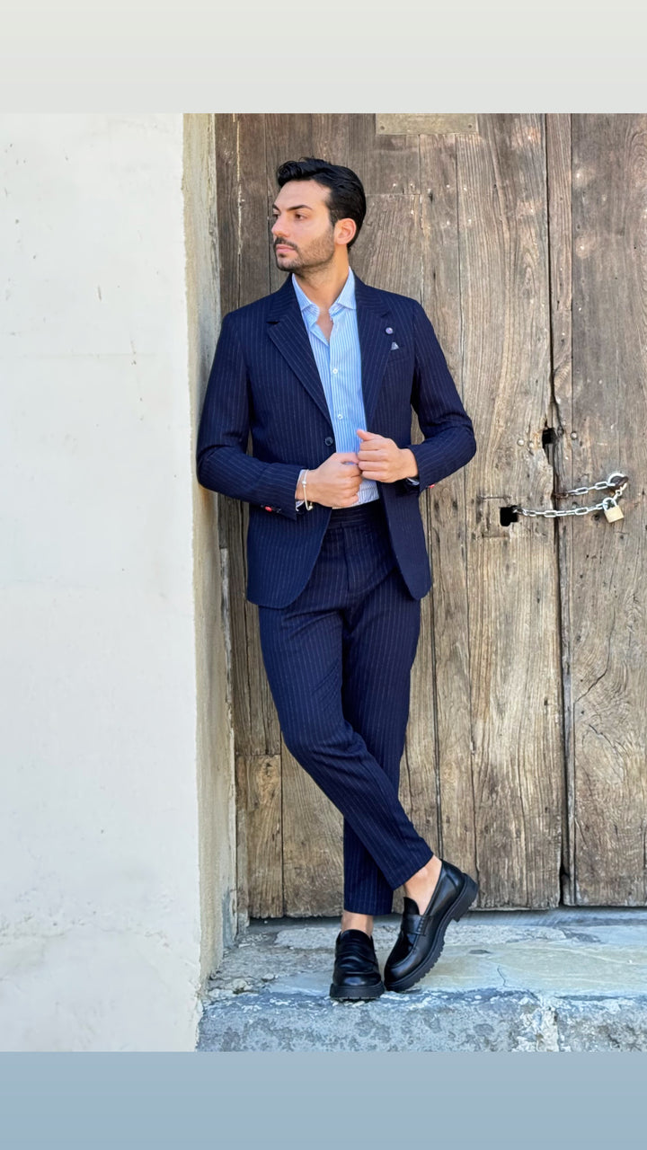 Abito gessato con giacca monopetto, fodera a fantasia al suo interno , bottone in tinta, tasca a filo, pochette compresa nel suo taschino, bottone con dettaglio a contrasto sui polsi e fodera a fantasia; pantalone semi vita alta con clip laterali, bottone laterale e tasche a filo con bottone sul retro. Vestibilità slim, il modello 1.76 per 73kg indossa 46