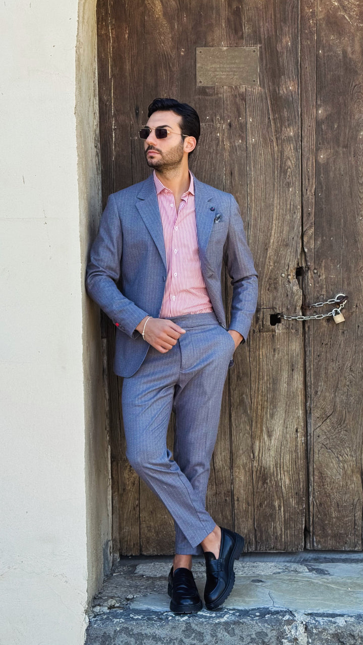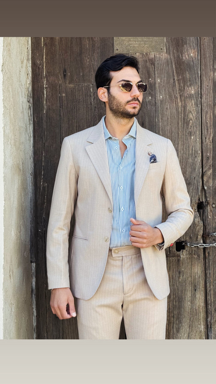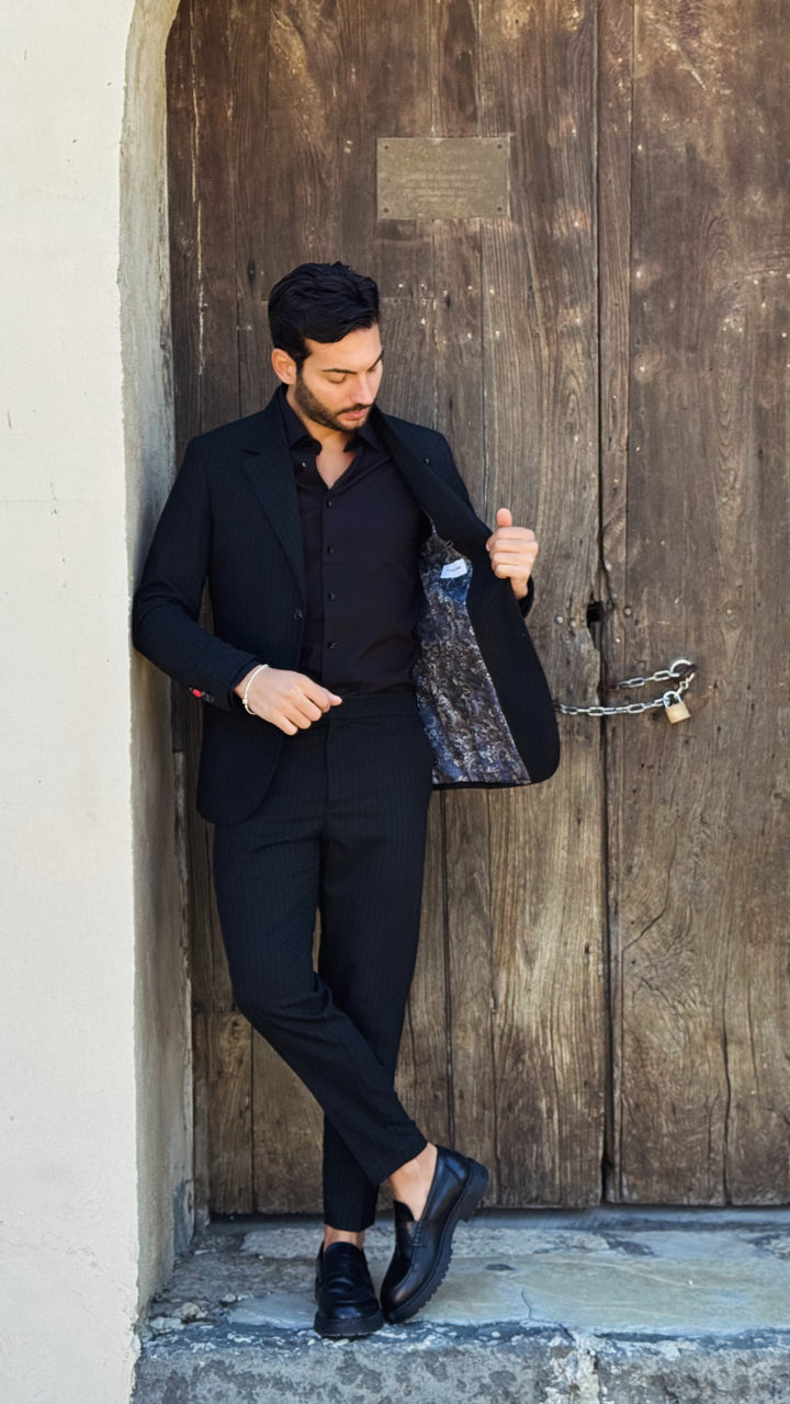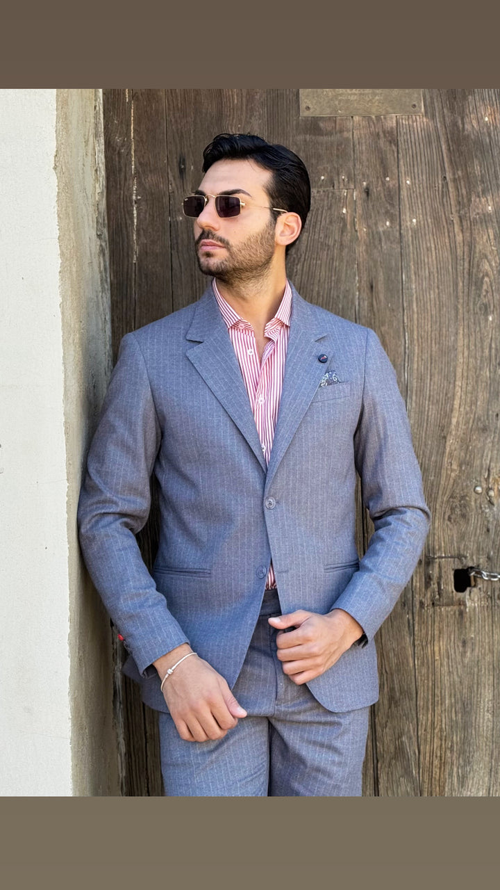 Abito gessato con giacca monopetto, fodera a fantasia al suo interno , bottone in tinta, tasca a filo, pochette compresa nel suo taschino, bottone con dettaglio a contrasto sui polsi e fodera a fantasia; pantalone semi vita alta con clip laterali, bottone laterale e tasche a filo con bottone sul retro. Vestibilità slim, il modello 1.76 per 73kg indossa 46