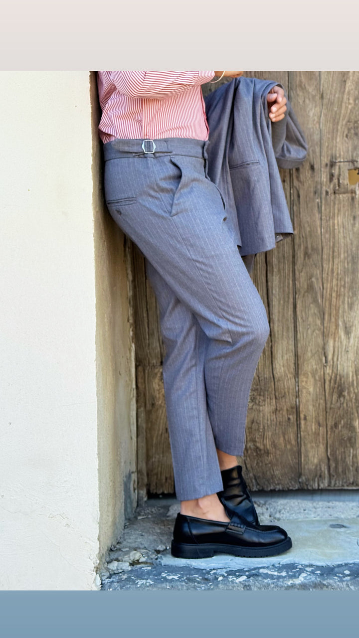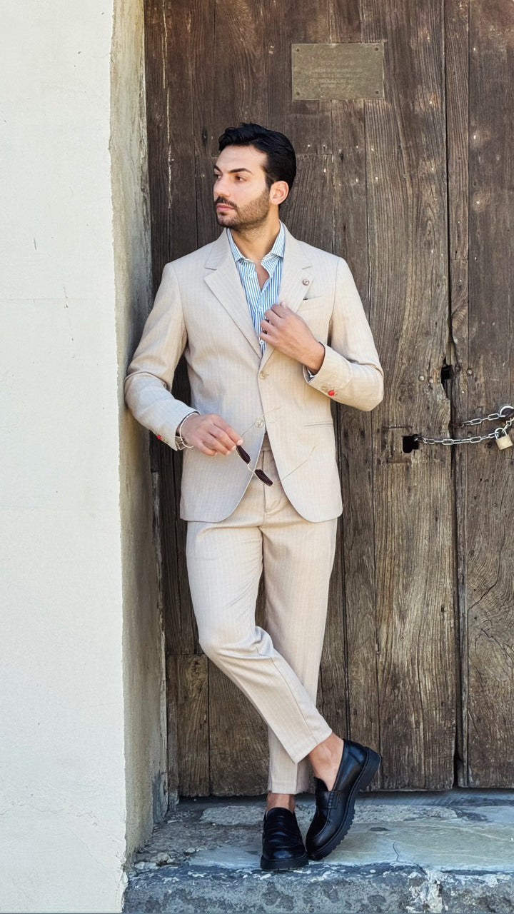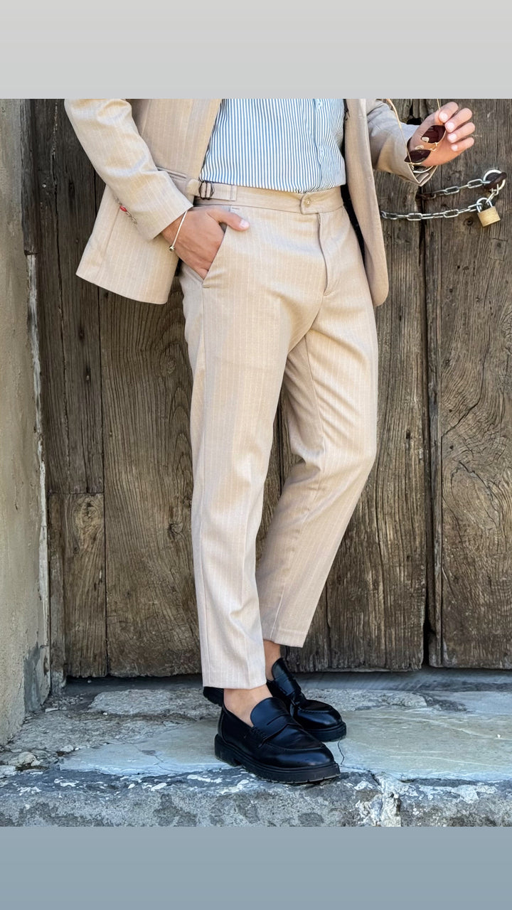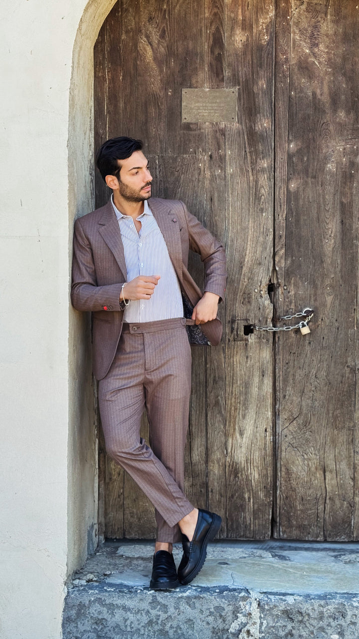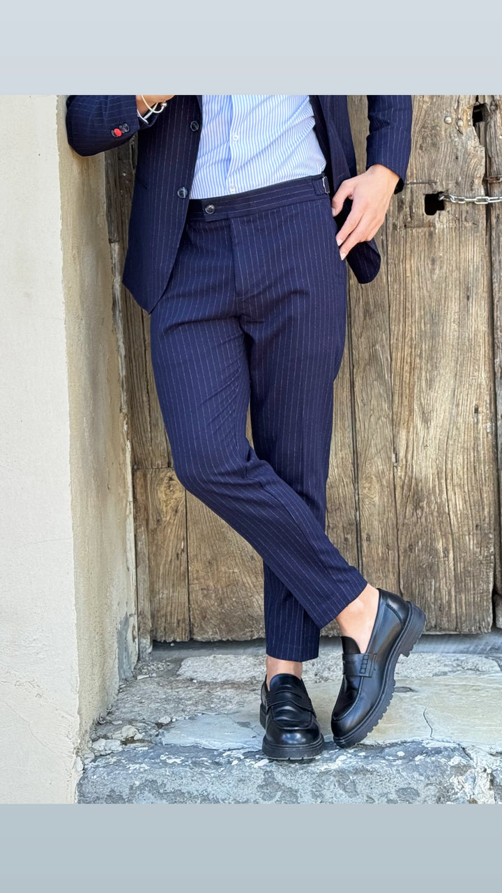 Abito gessato con giacca monopetto, fodera a fantasia al suo interno , bottone in tinta, tasca a filo, pochette compresa nel suo taschino, bottone con dettaglio a contrasto sui polsi e fodera a fantasia; pantalone semi vita alta con clip laterali, bottone laterale e tasche a filo con bottone sul retro. Vestibilità slim, il modello 1.76 per 73kg indossa 46
