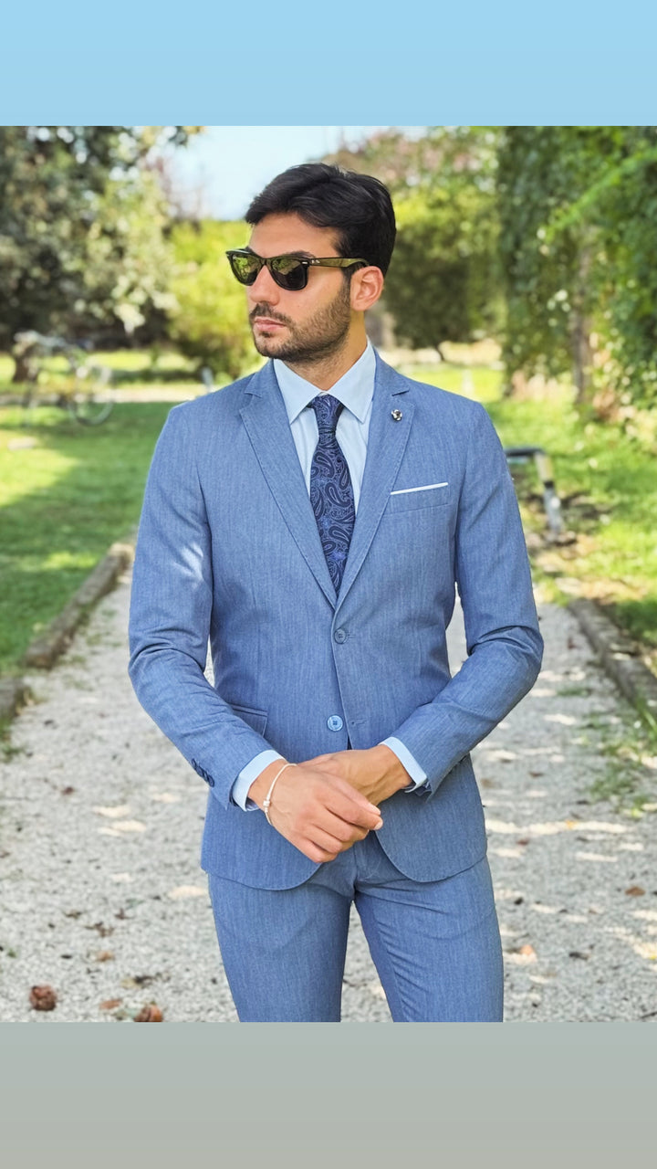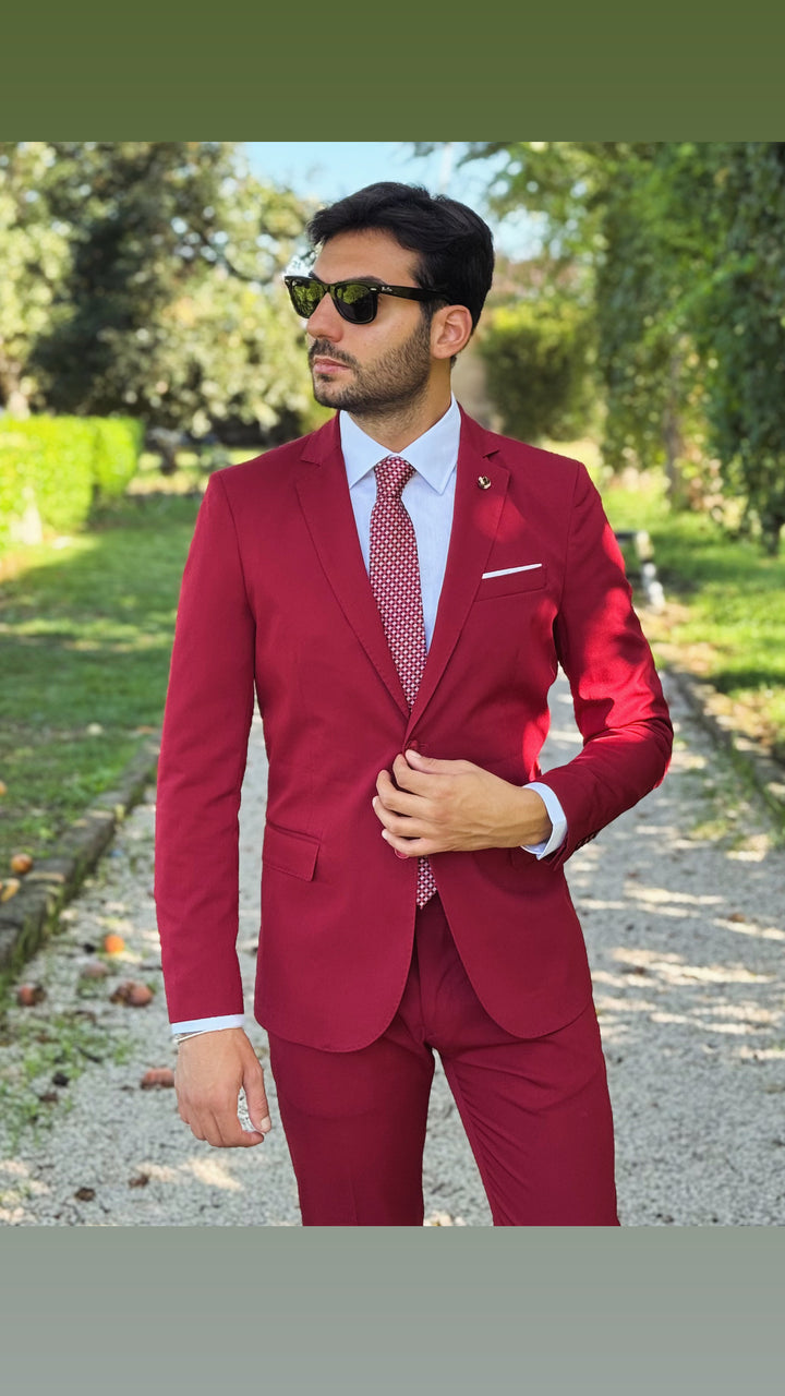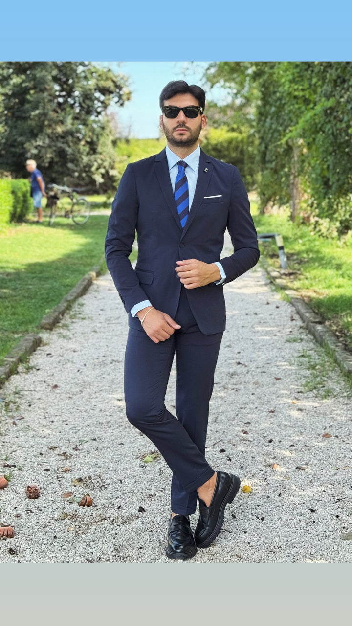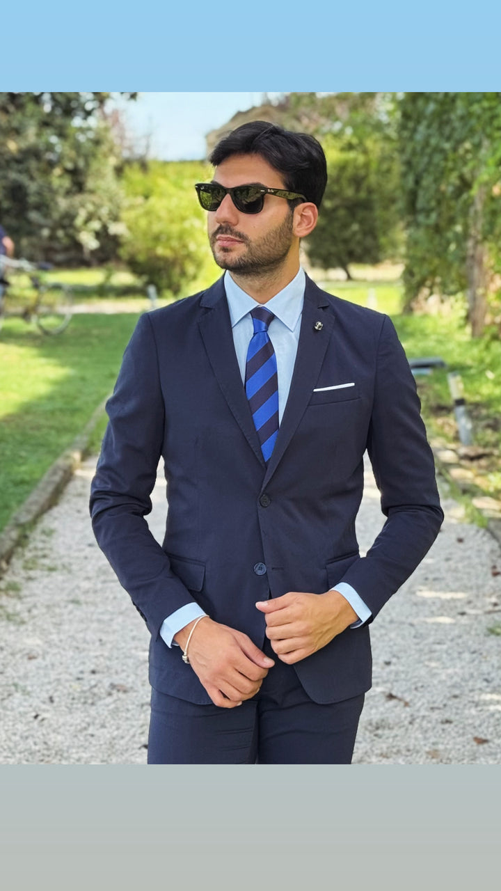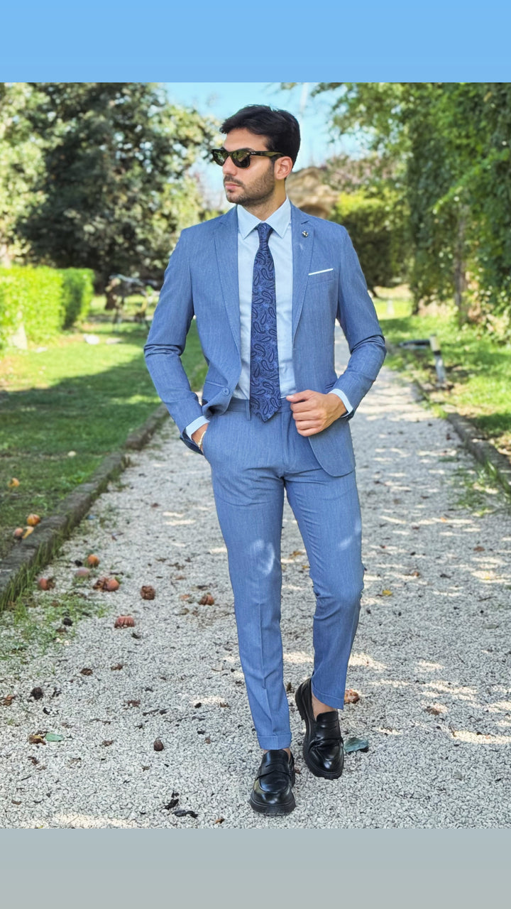 Abito sartoriale con giacca monopetto, bottoni in tinta, taschino a filo con finta pochette; pantalone Capri con risvoltino cucito sul fondo, tasca America. Vestibilità slim, il modello 1,76 per 73kg indossa 46