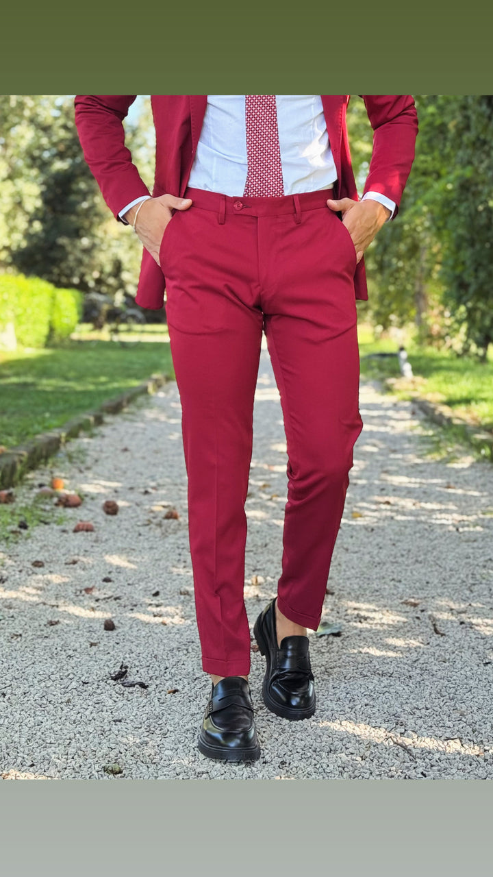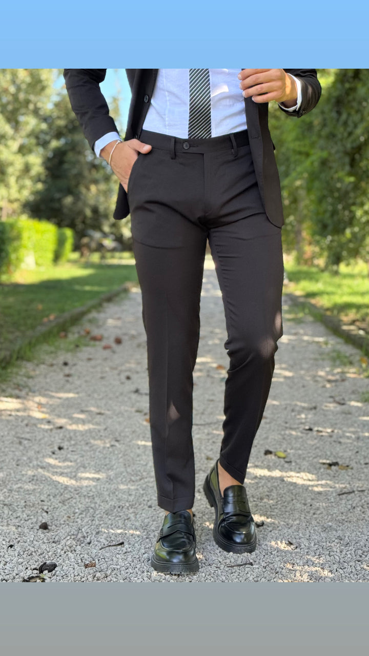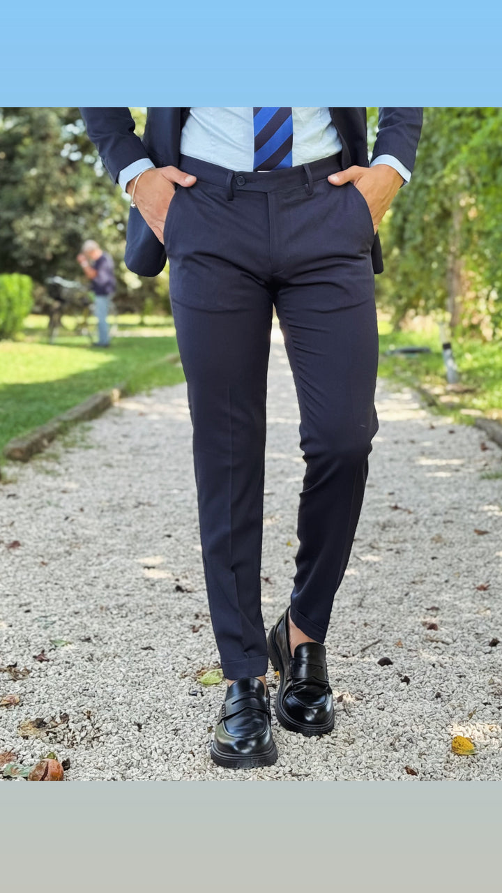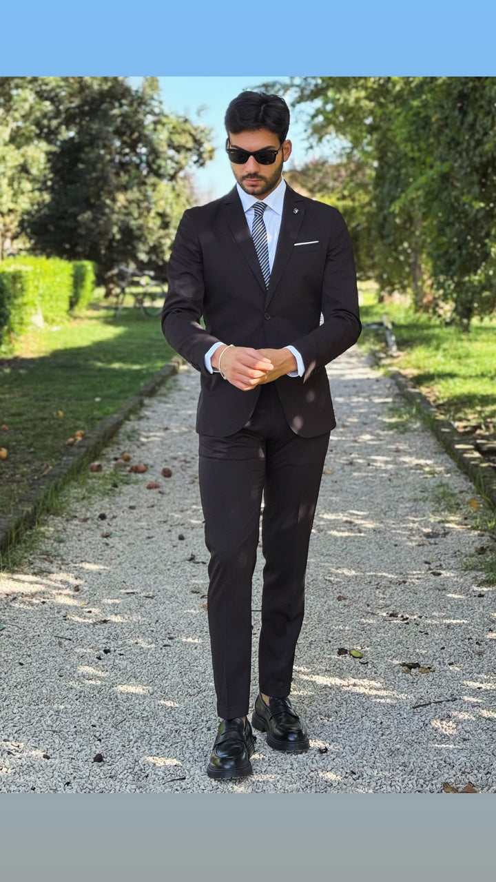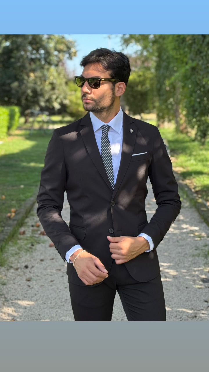 Abito sartoriale con giacca monopetto, bottoni in tinta, taschino a filo con finta pochette; pantalone Capri con risvoltino cucito sul fondo, tasca America. Vestibilità slim, il modello 1,76 per 73kg indossa 46