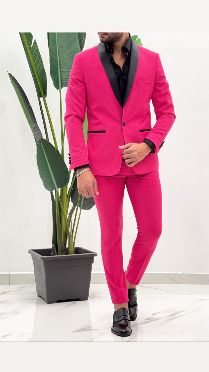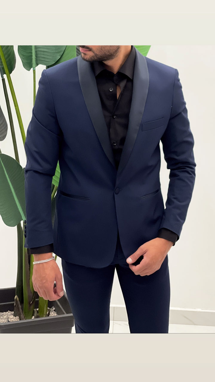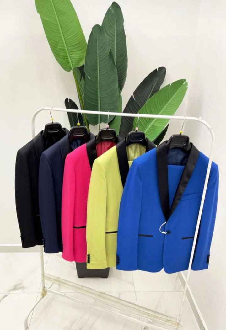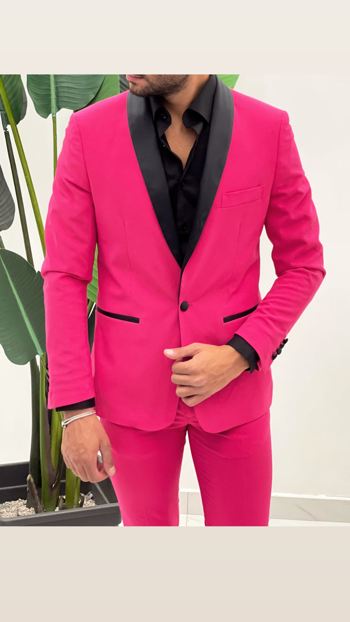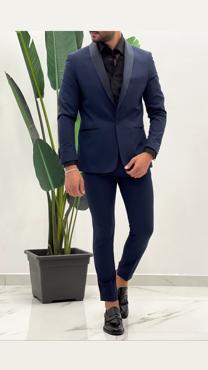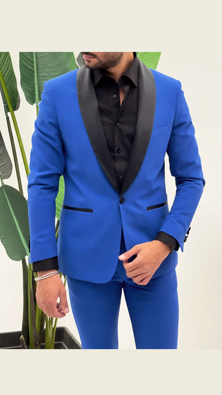 Abito Smoking, disponibile in 5 colori, giacca monopetto con bottone in contrasto nero, pantalone vestibilità slim, modello 1,73 x 71 indossa 46