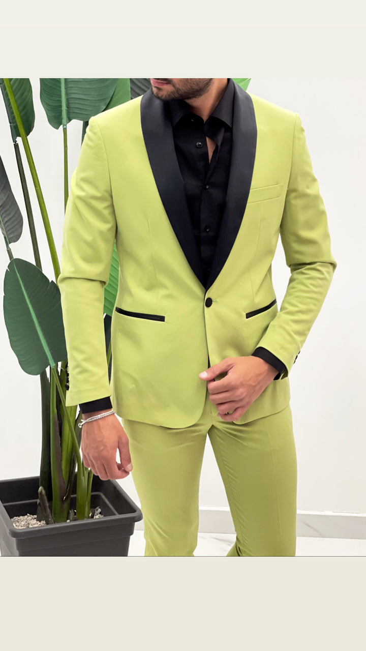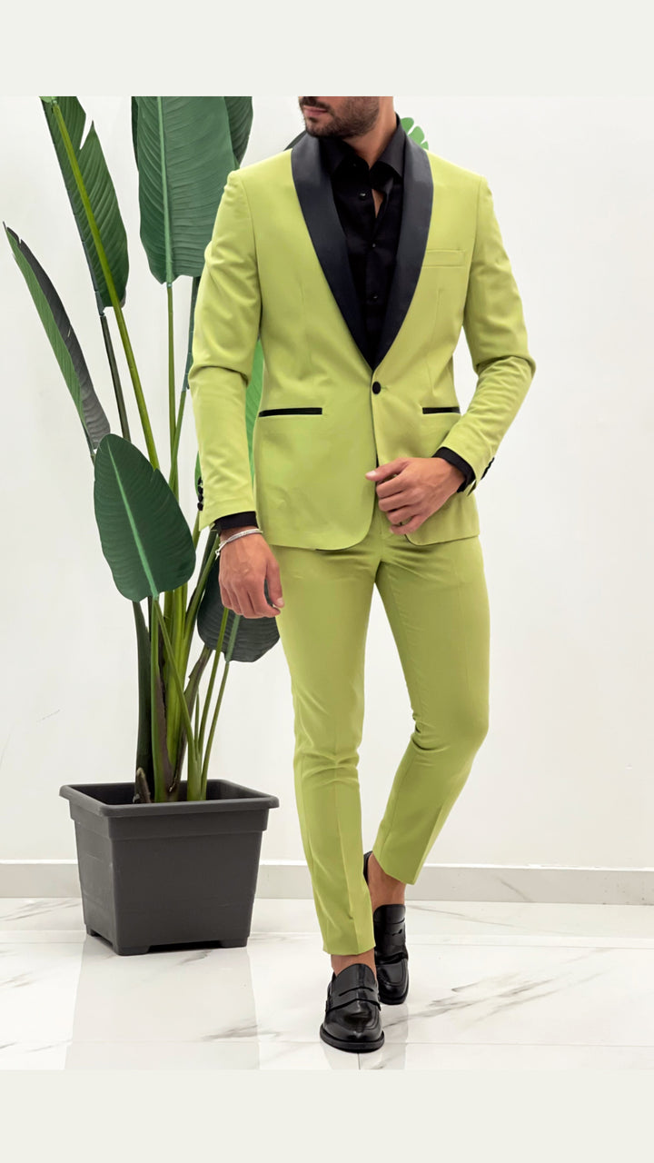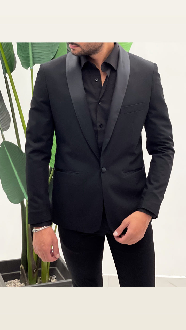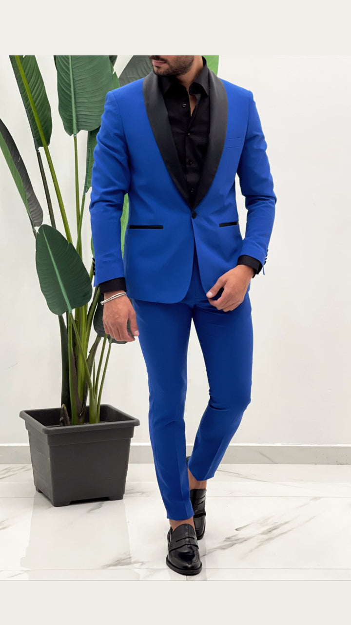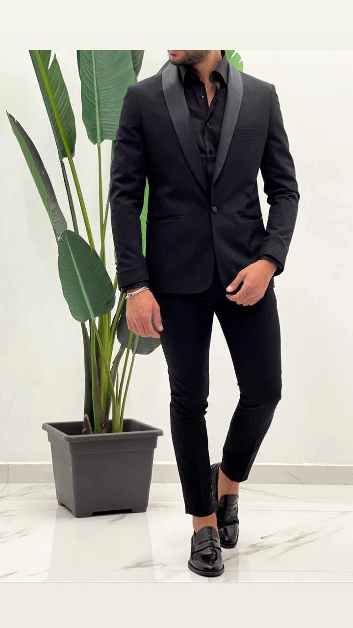 Abito Smoking, disponibile in 5 colori, giacca monopetto con bottone in contrasto nero, pantalone vestibilità slim, modello 1,73 x 71 indossa 46