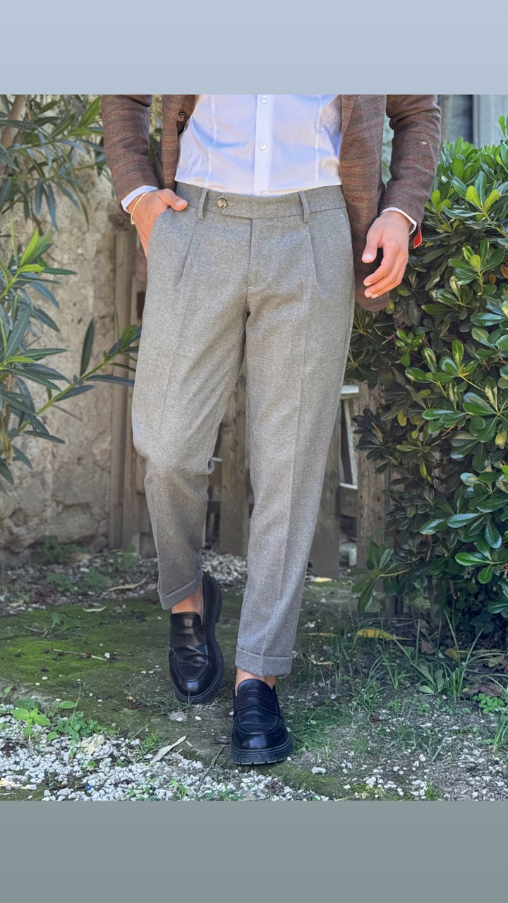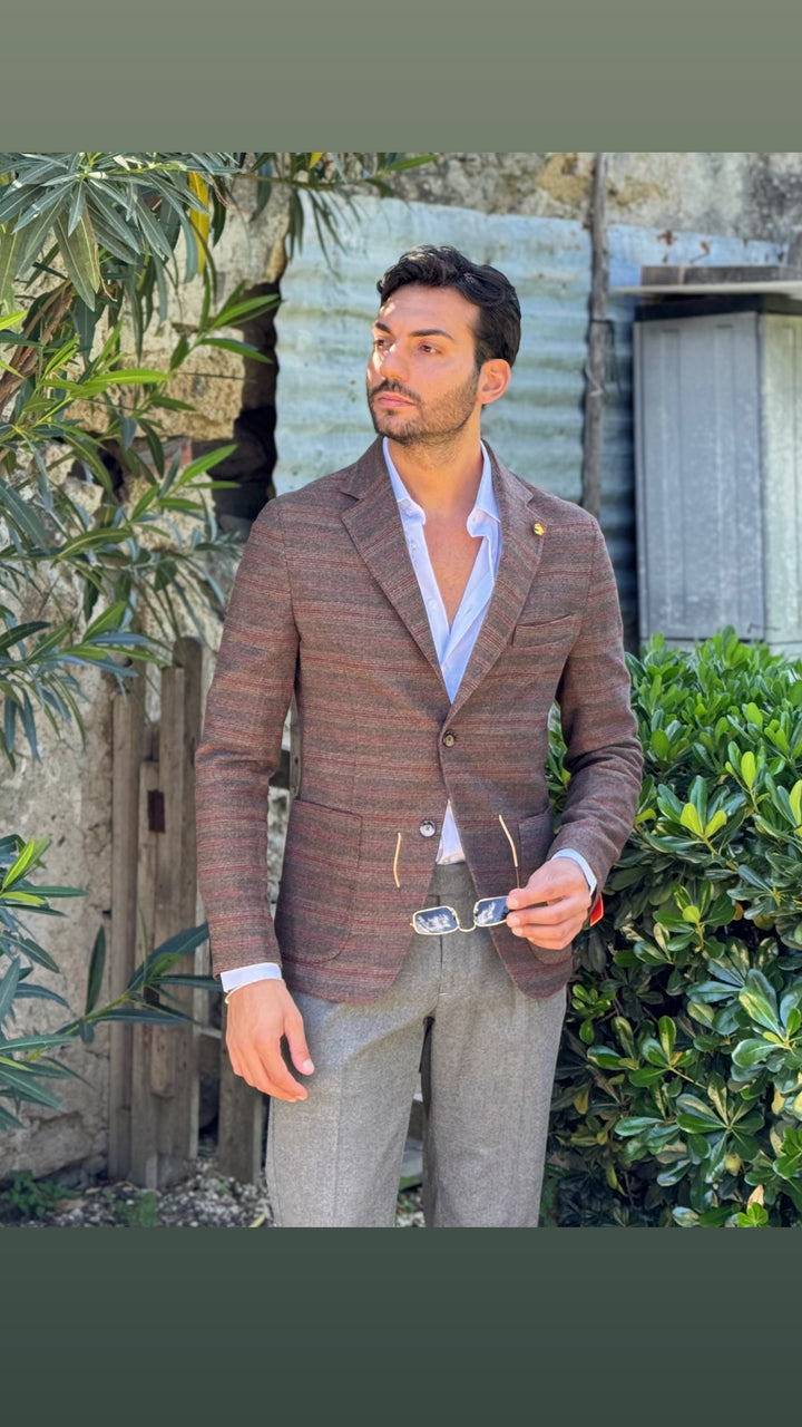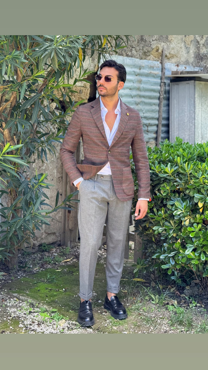 Abito spezzato con giacca monopetto, trama scozzese, tasca a toppa, con la sua vestibilità regolare abbinata al suo pantalone grigio con bottone laterale e risvoltino sul fondo. Il modello 1,76 per 73kg indossa 46