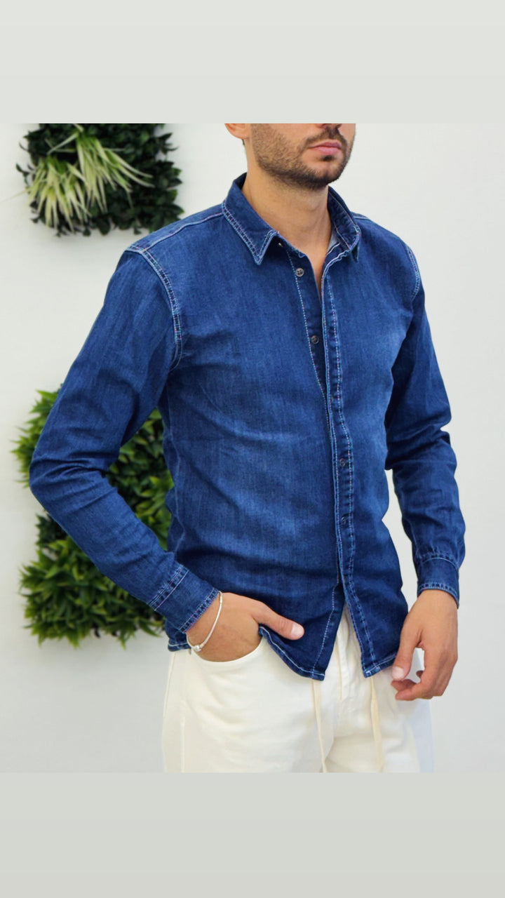 Camicia classica in tessuto jeans, vestibilità slim. Il modello 1.76 per 73kg indossa M