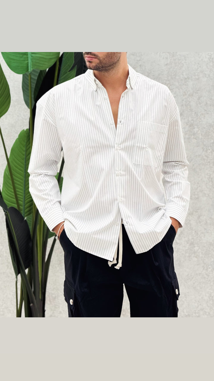 Camicia over a righe con taschino a toppa sul davanti. Il modello 1,76 per 73kg indossa la I taglia.