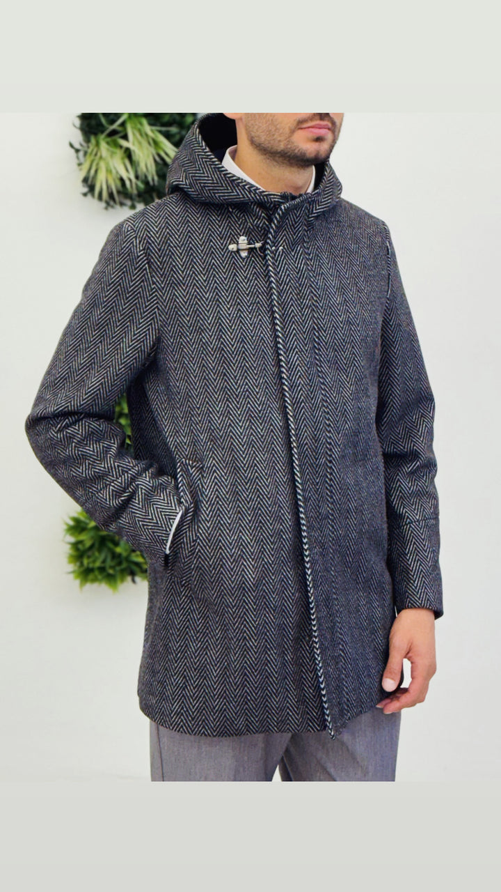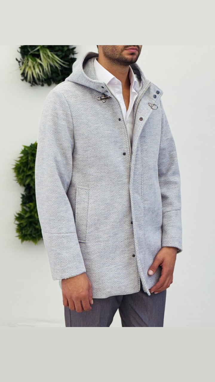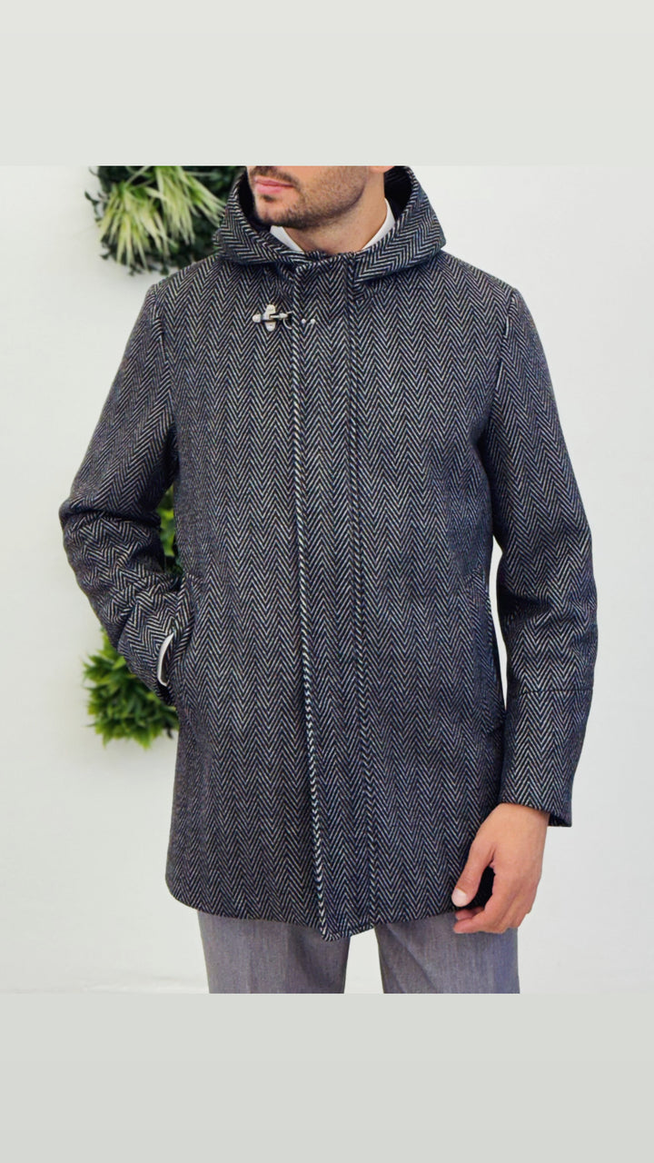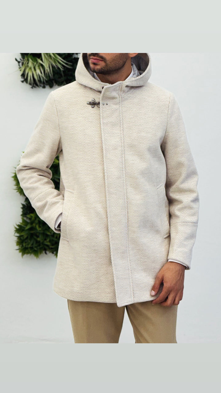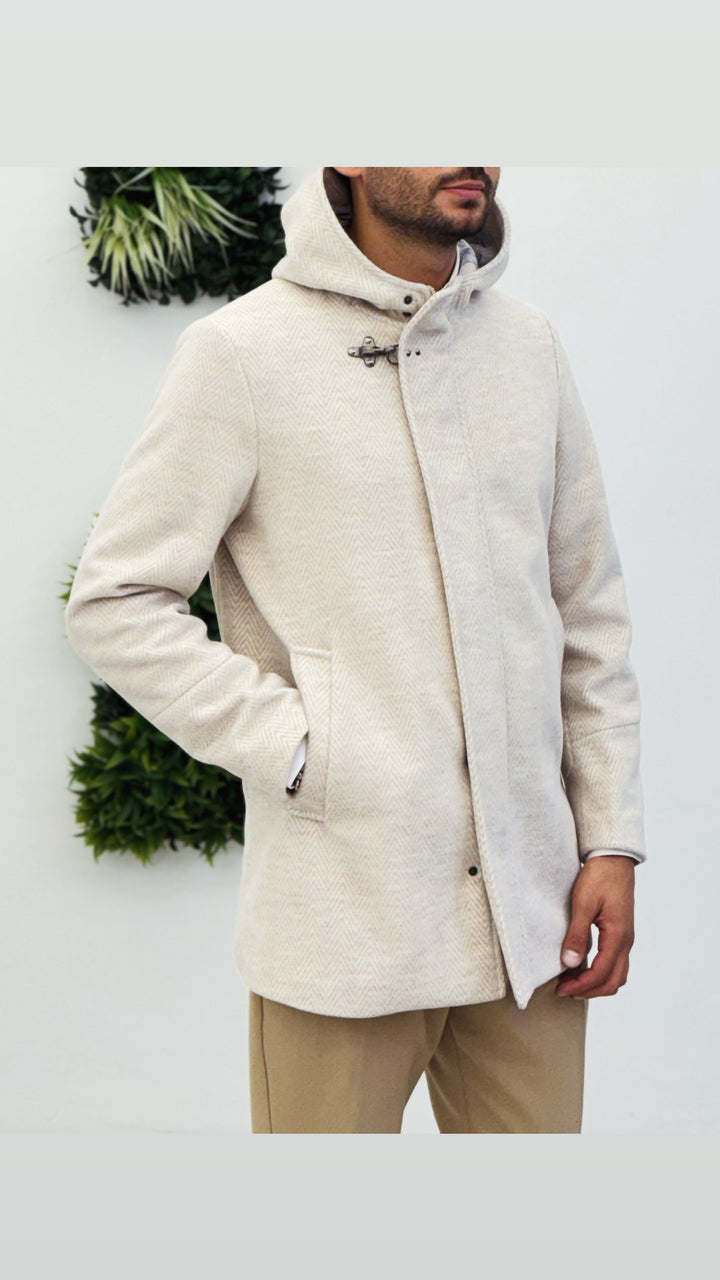 Cappotto con cappuccio con chiusura zip, bottoni a scomparsa e gancio in metallo. Vestibilità regolare, il modello 1.76 per 73kg indossa 46