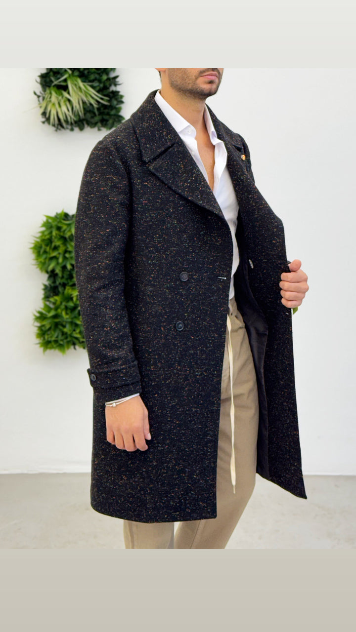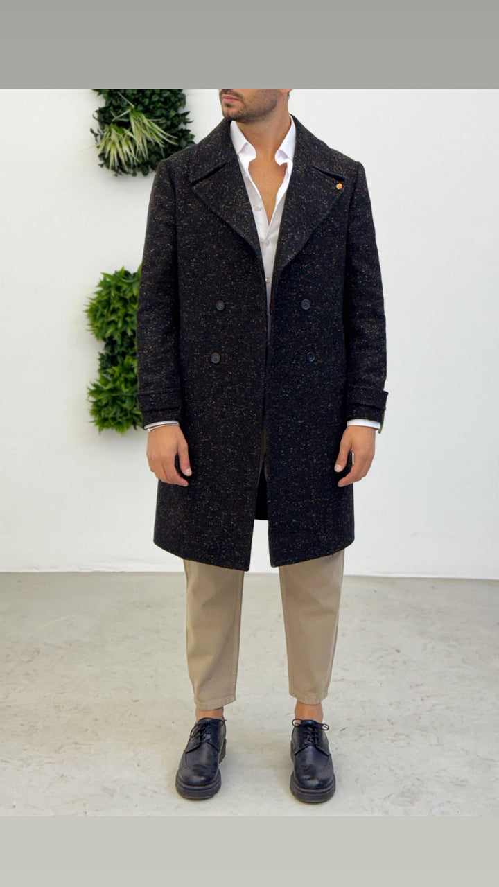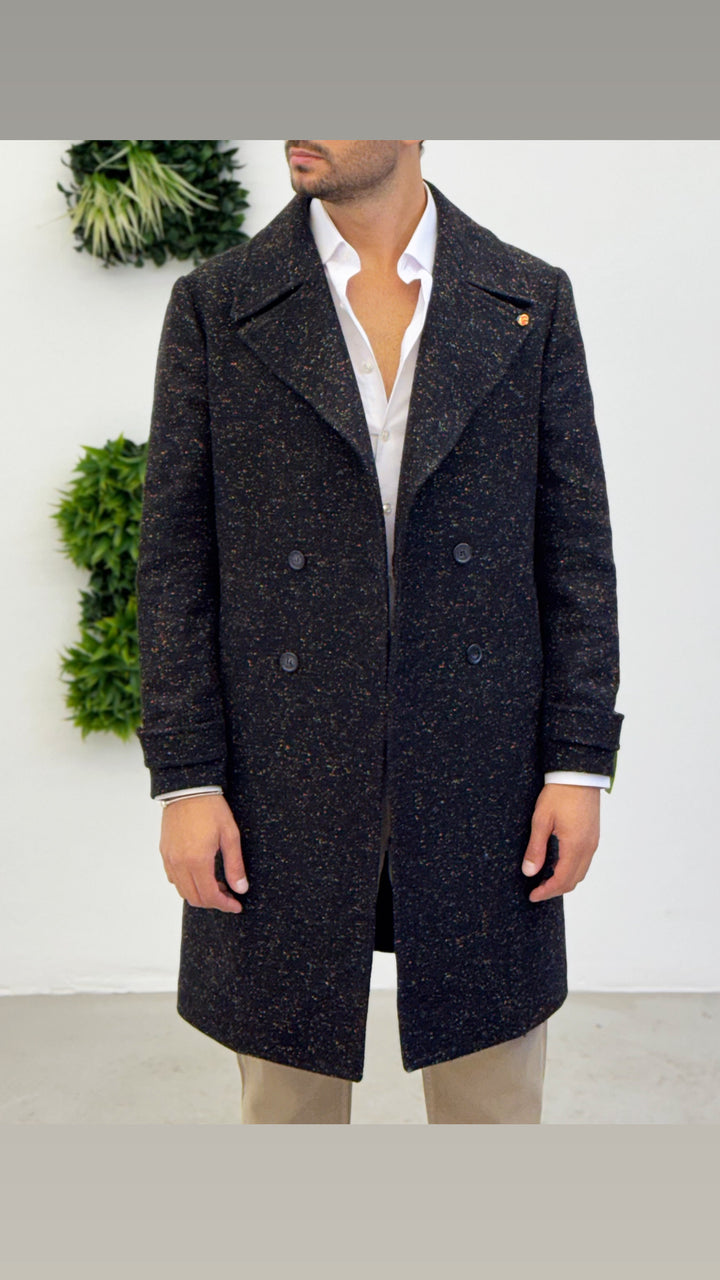Cappotto doppiopetto con fantasia puntellata a contrasto, vestibilità regolare, il modello 1.76 per 73kg indossa 46