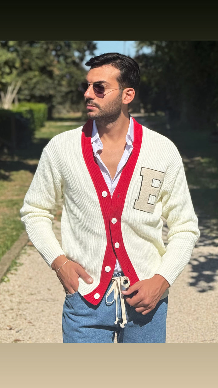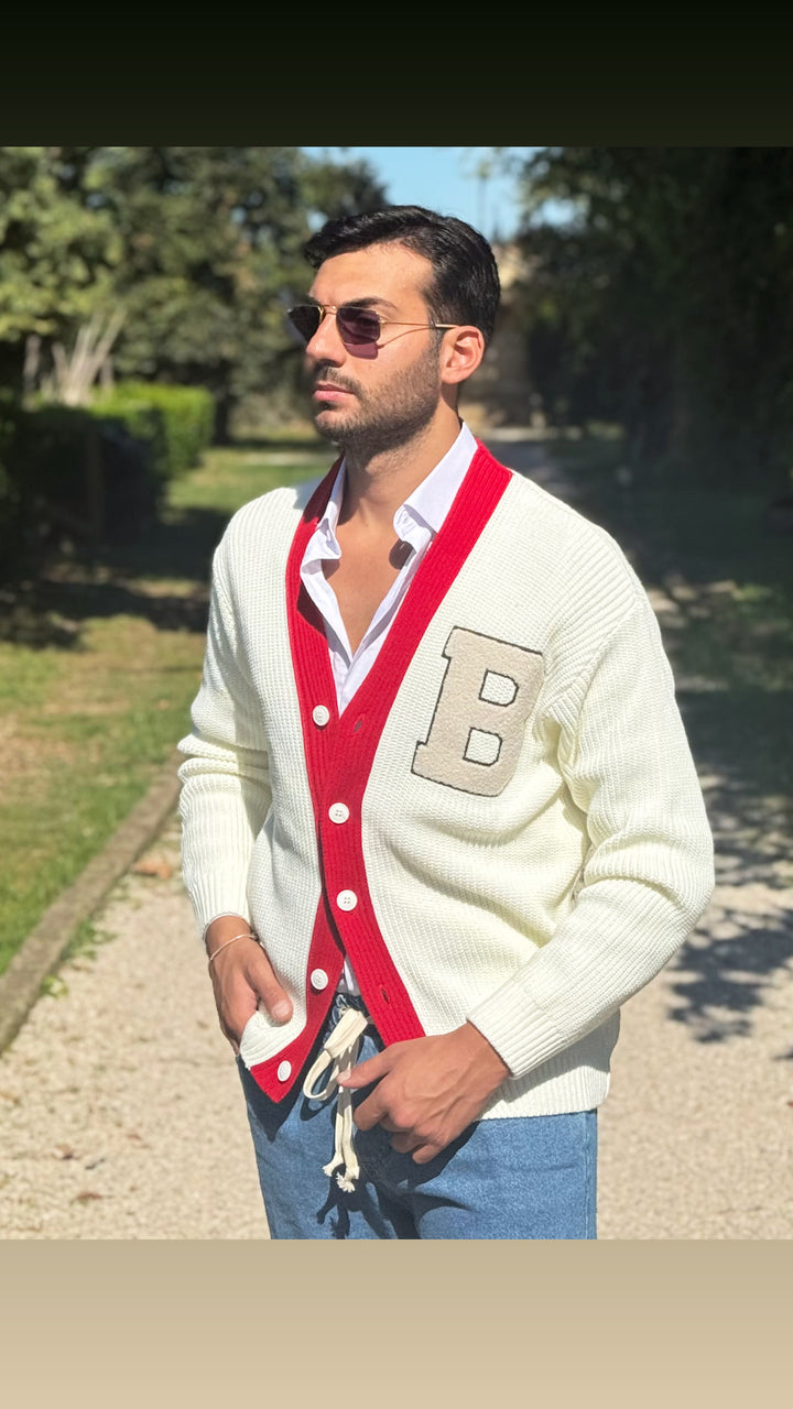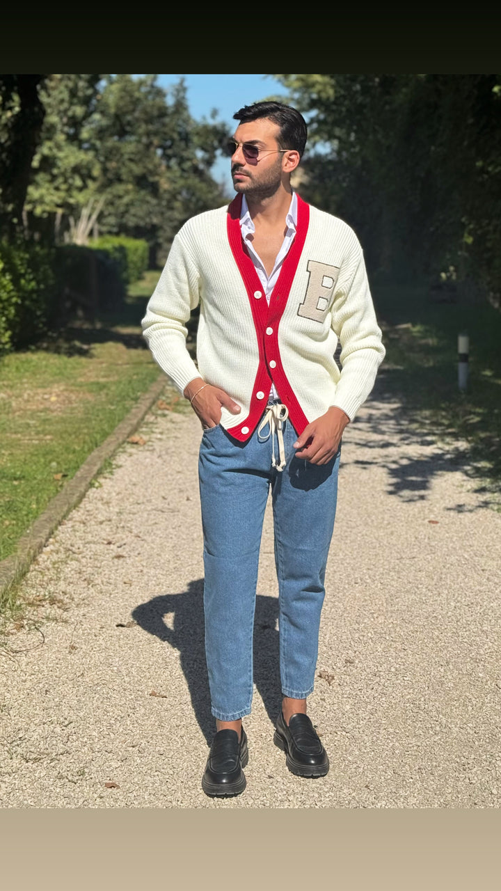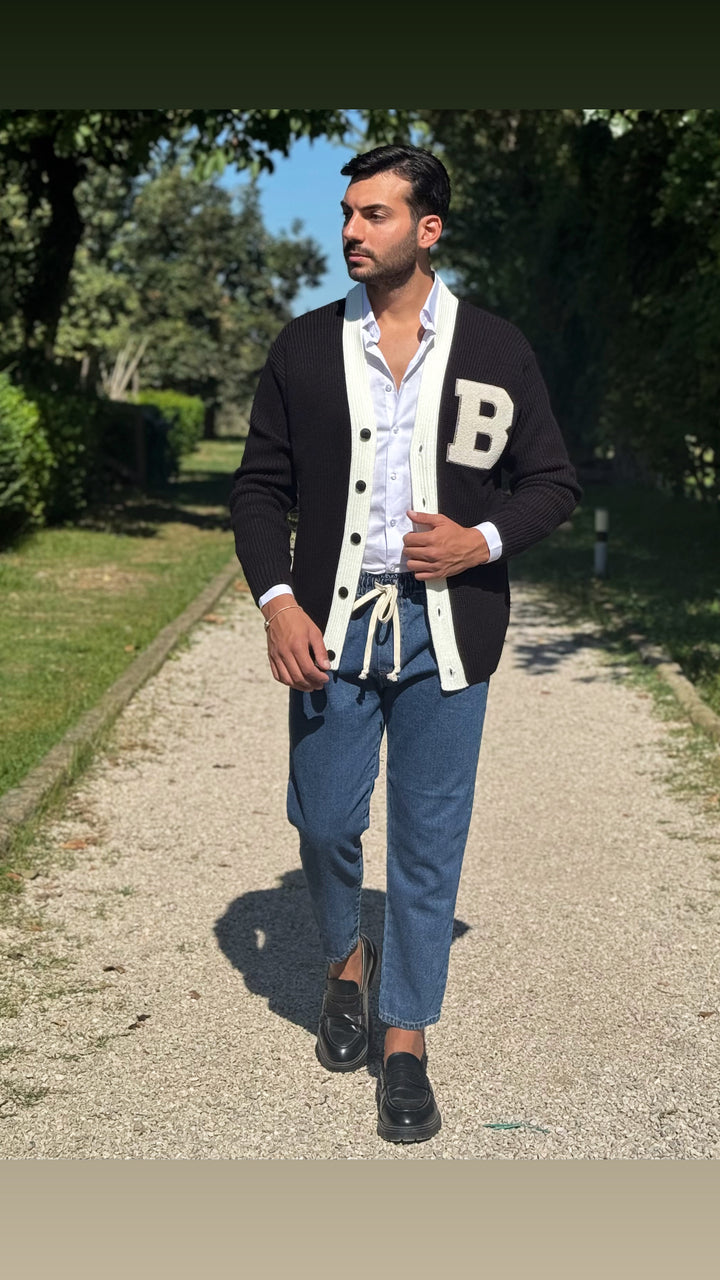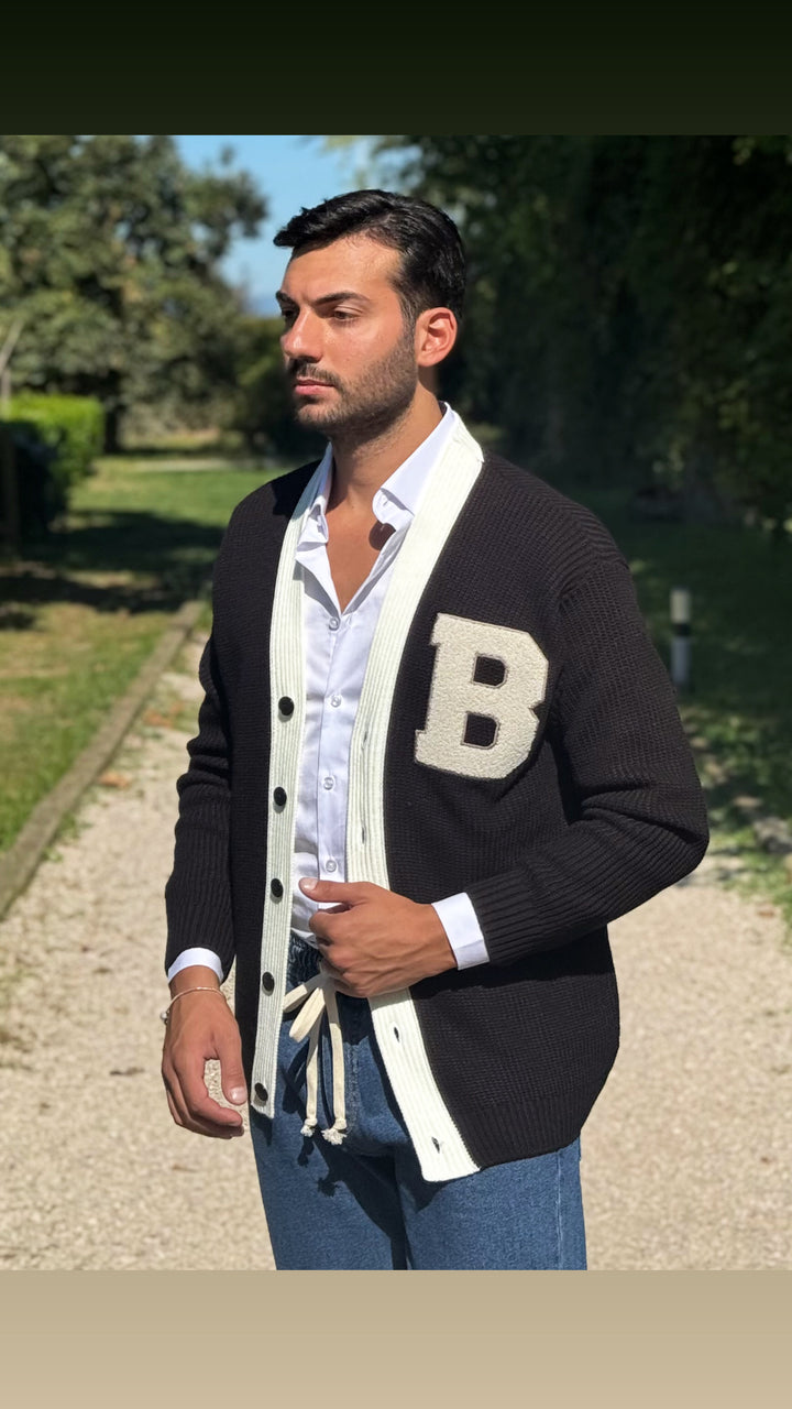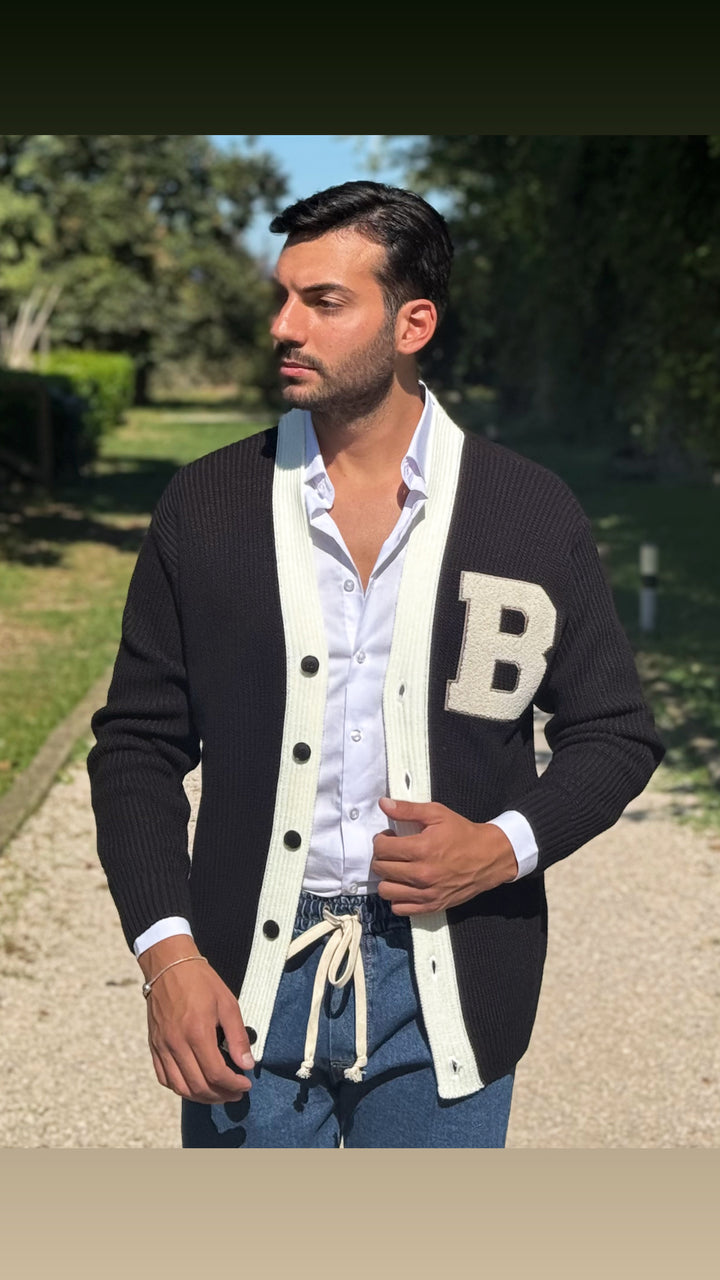 Cardigan modello scialla, con dettagli sul petto e colori a contrasto, vestibilità regolare. Il modello 1,76 per 73kg indossa M