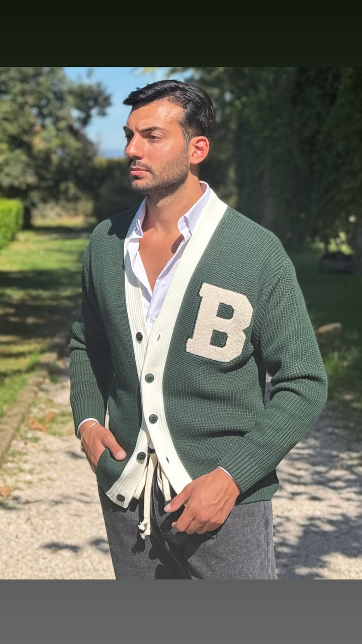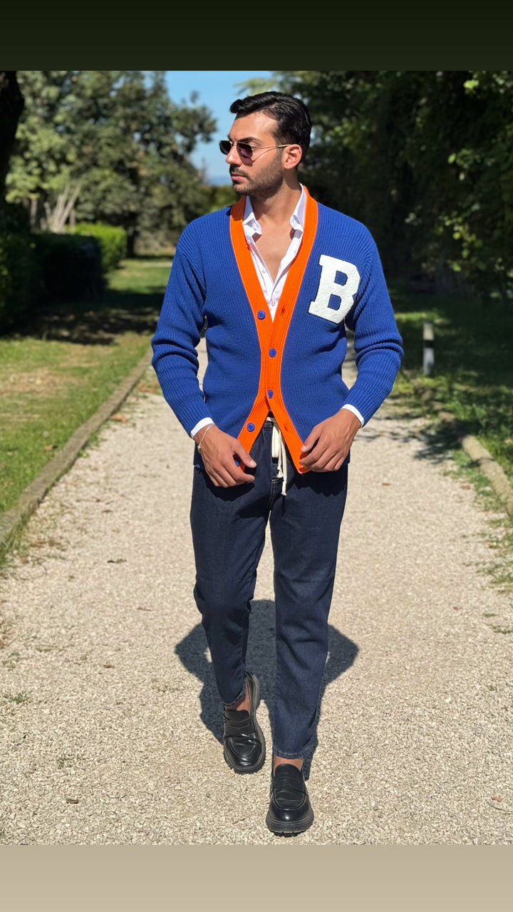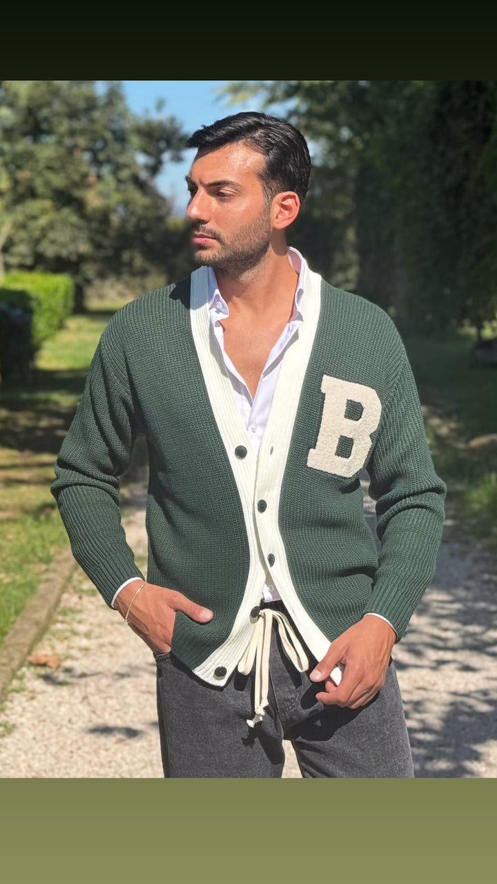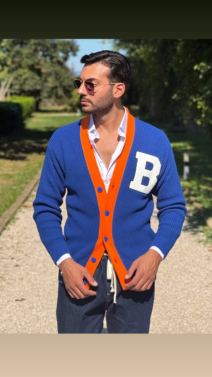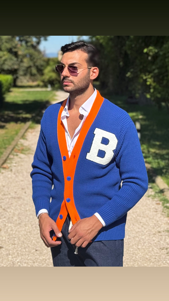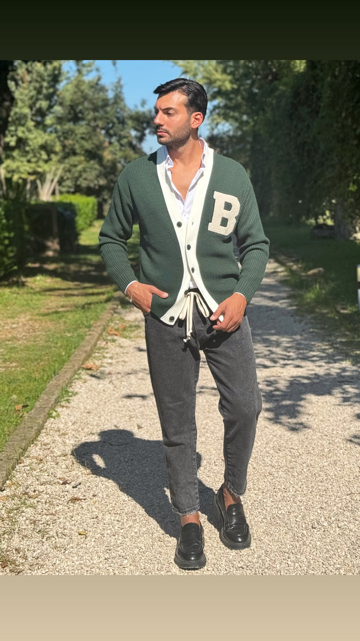 Cardigan modello scialla, con dettagli sul petto e colori a contrasto, vestibilità regolare. Il modello 1,76 per 73kg indossa M