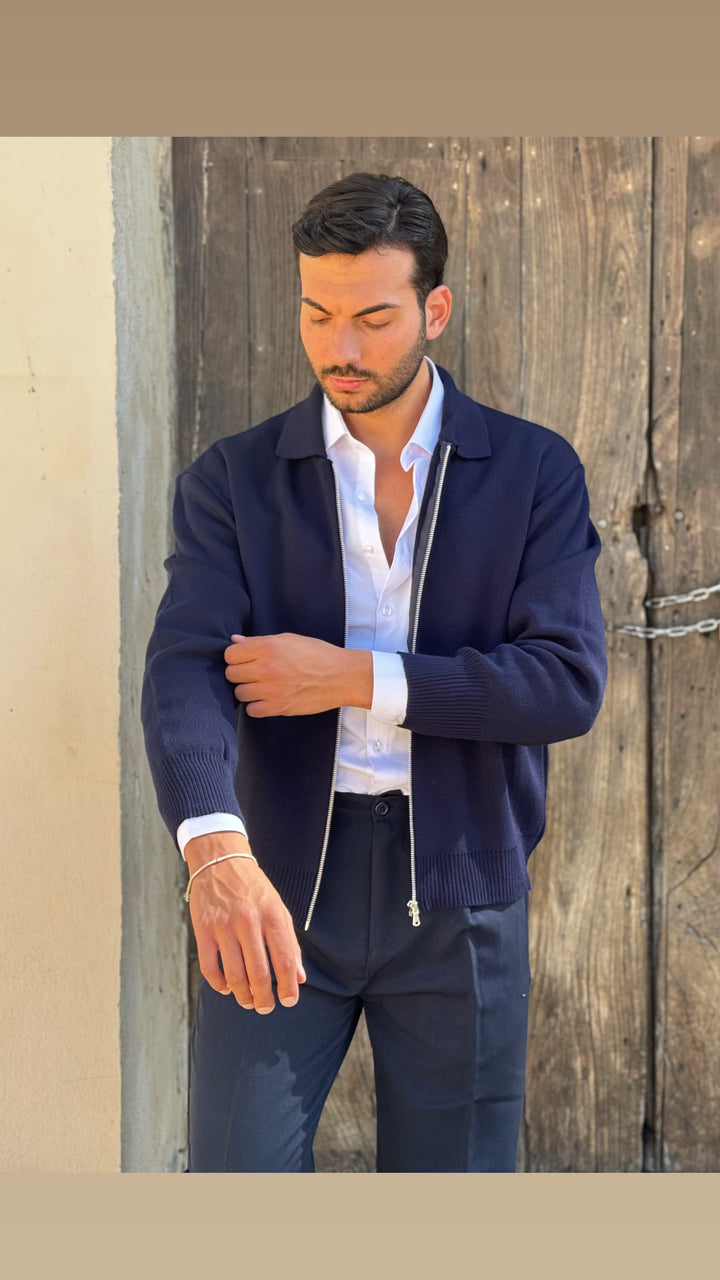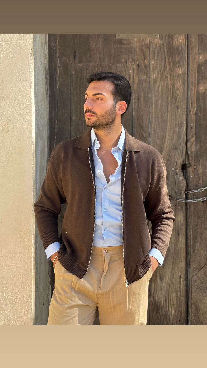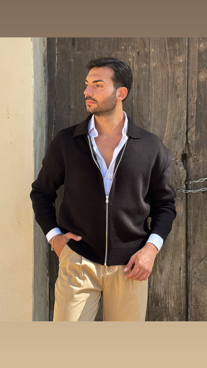 Cardigan con collo a camicia e chiusura con zip in metallo, ottimo per completare i vostri outfit per questo inverno. Vestibilità slim, il modello 1,76 per 73kg indossa M