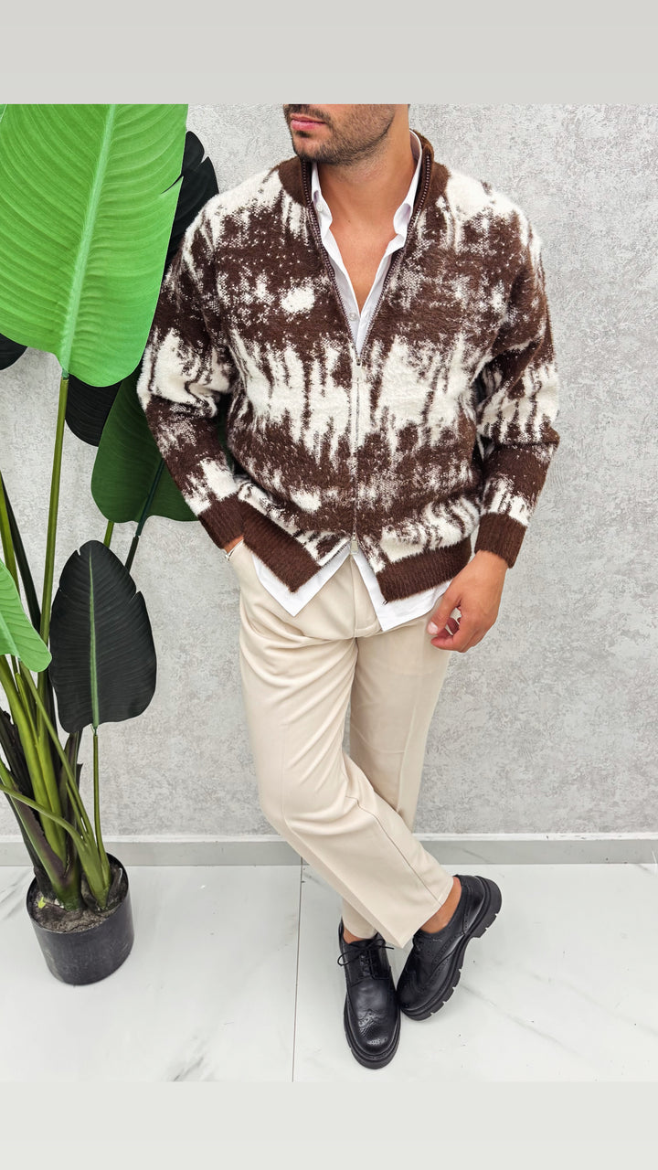 Cardigan in tessuto lana, effetto pelliccioso con fantasia a contrasto, chiusura a zip, vestibilità regolare. Il modello 1.76 per 73kg indossa M