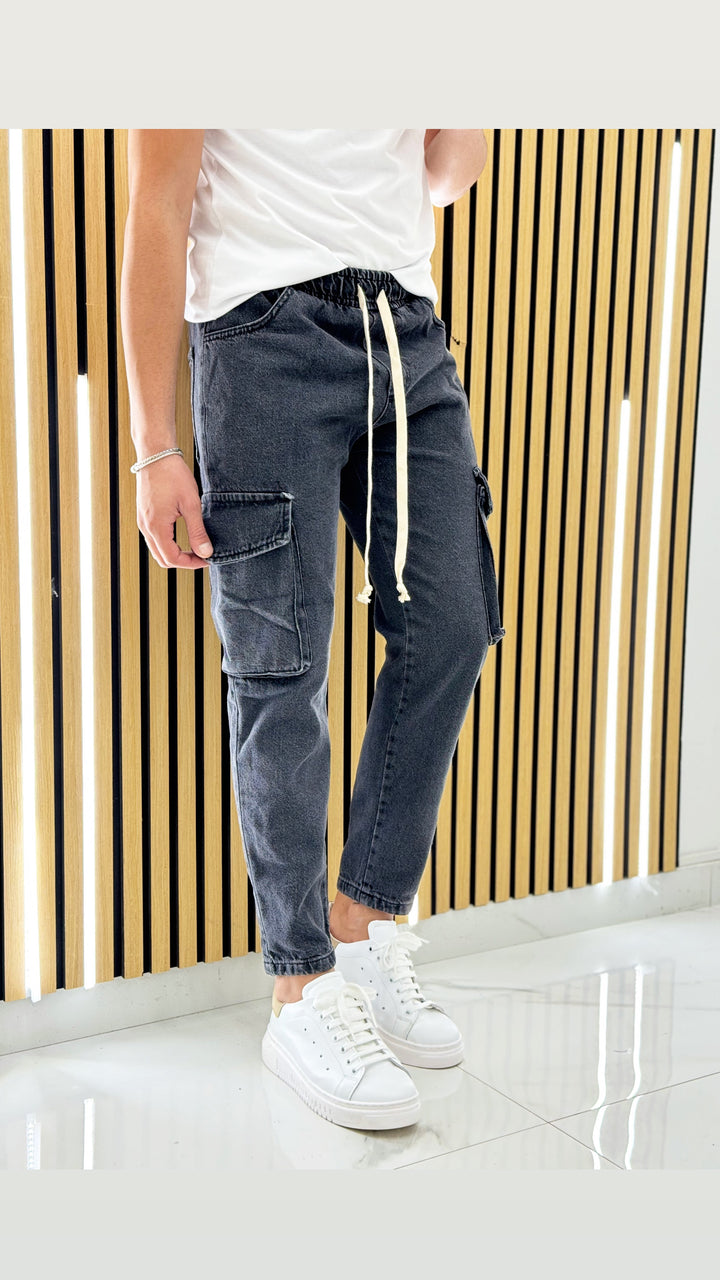 Cargo tessuto jeans con elastico in vita e laccetto, vestibilità regolare. Il modello 1,76 per 73kg indossa M