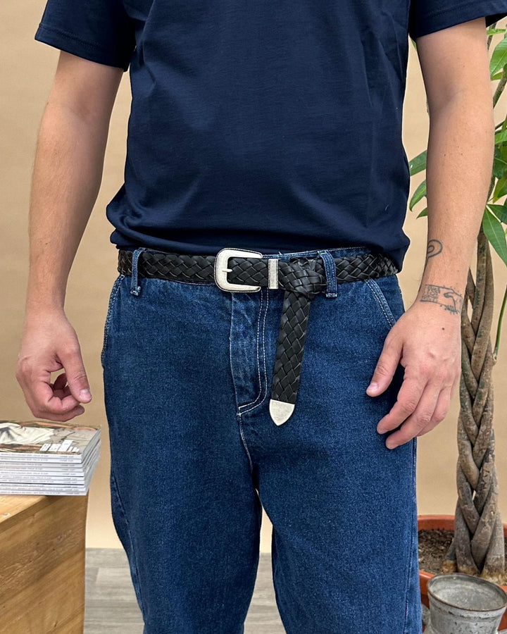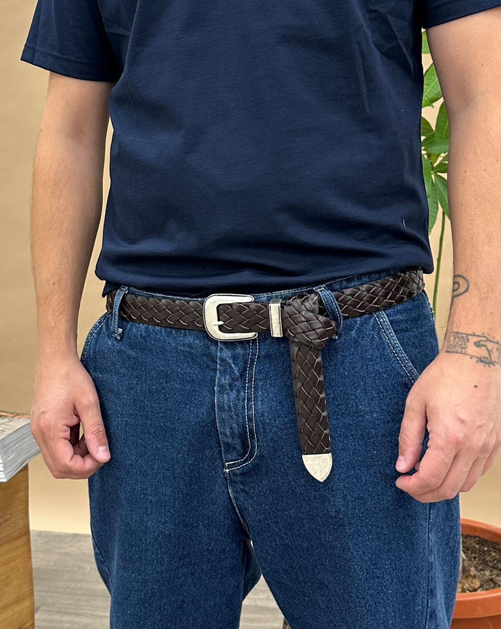 Cintura in pelle intrecciata, morbida nel tatto e gestibile nel allacciarla; cinturino e fibbia finale in acciaio con dettagli. Disponibile in diverse misure.