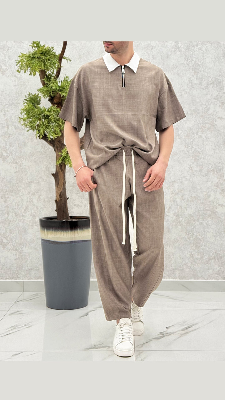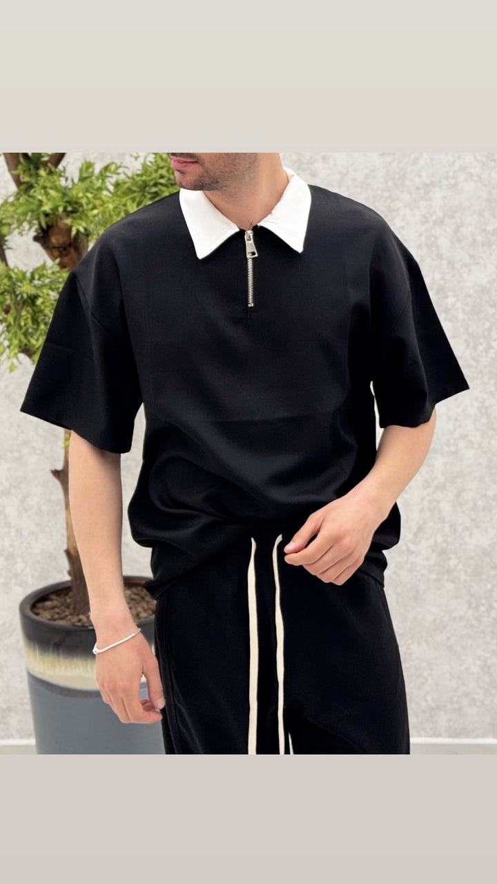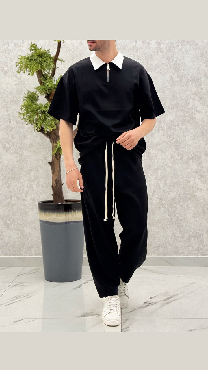 Coordinato composto da polo con zip e colletto a contrasto, pantalaccio fondo ampio con elastico e lacci in vita. Vestibilità regolare, il modello 1,76 per 73kg indossa M