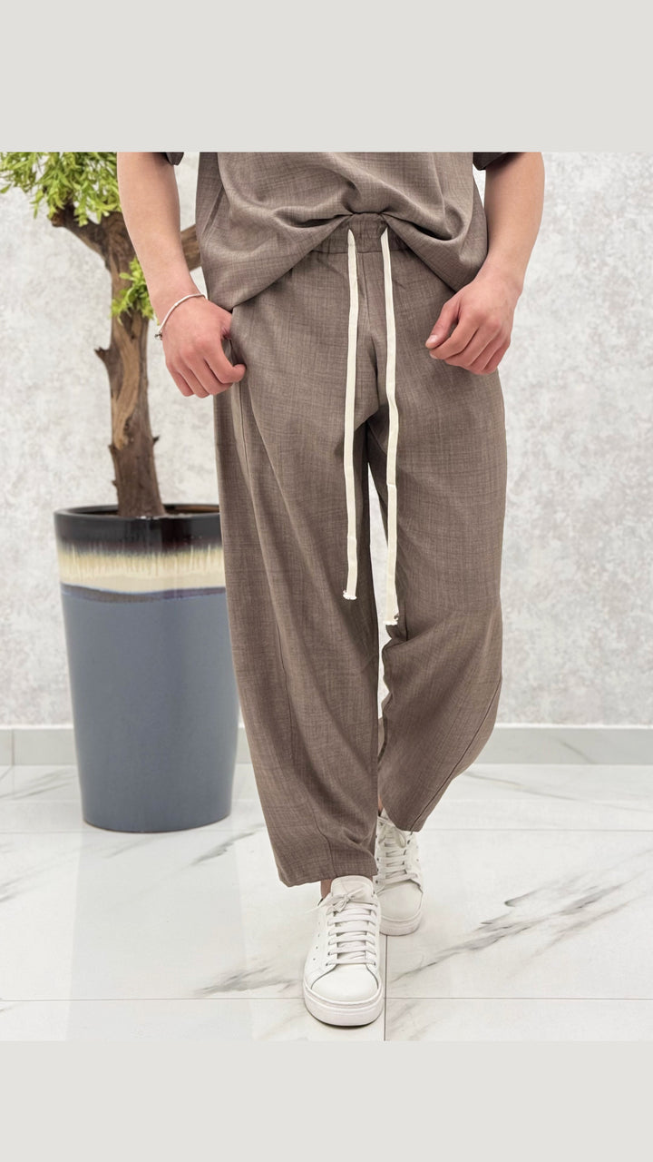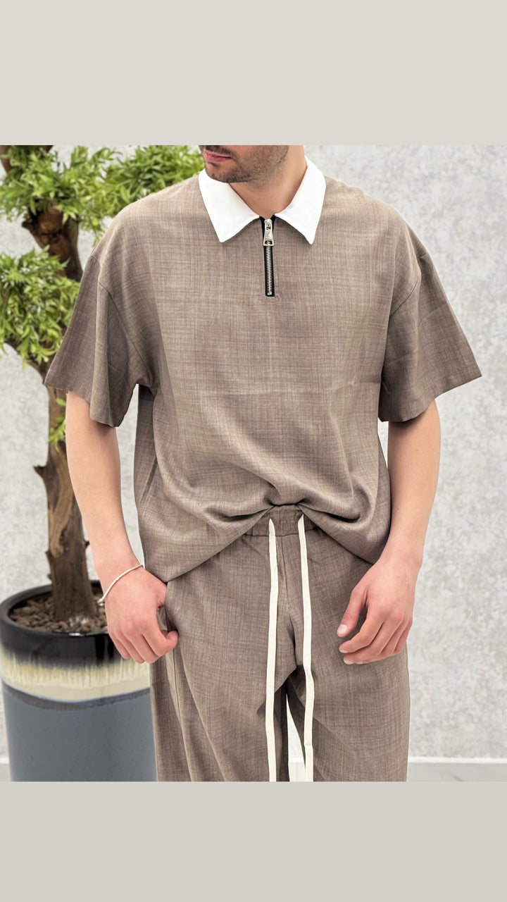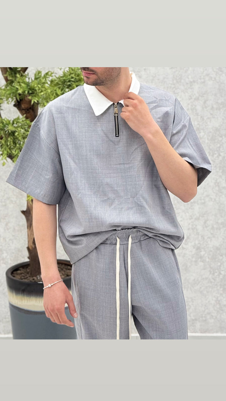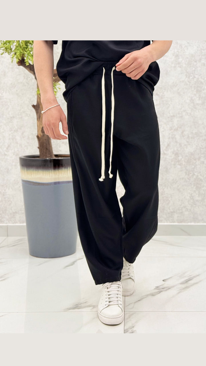Coordinato composto da polo con zip e colletto a contrasto, pantalaccio fondo ampio con elastico e lacci in vita. Vestibilità regolare, il modello 1,76 per 73kg indossa M