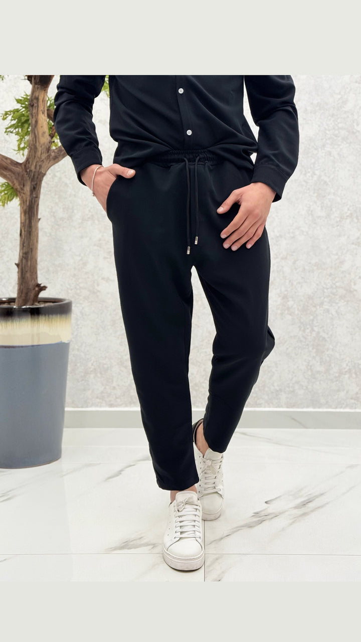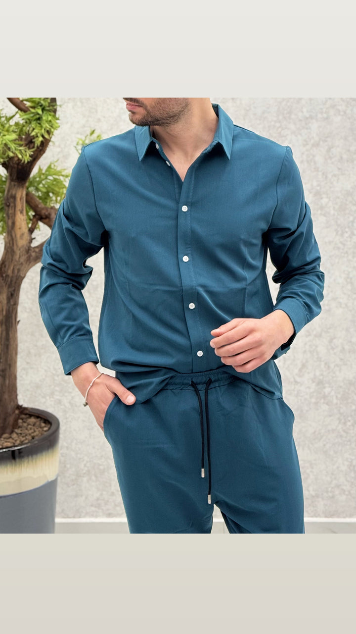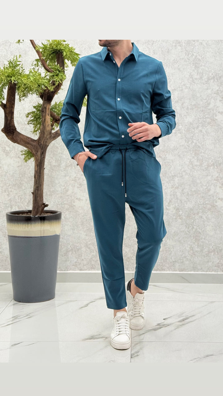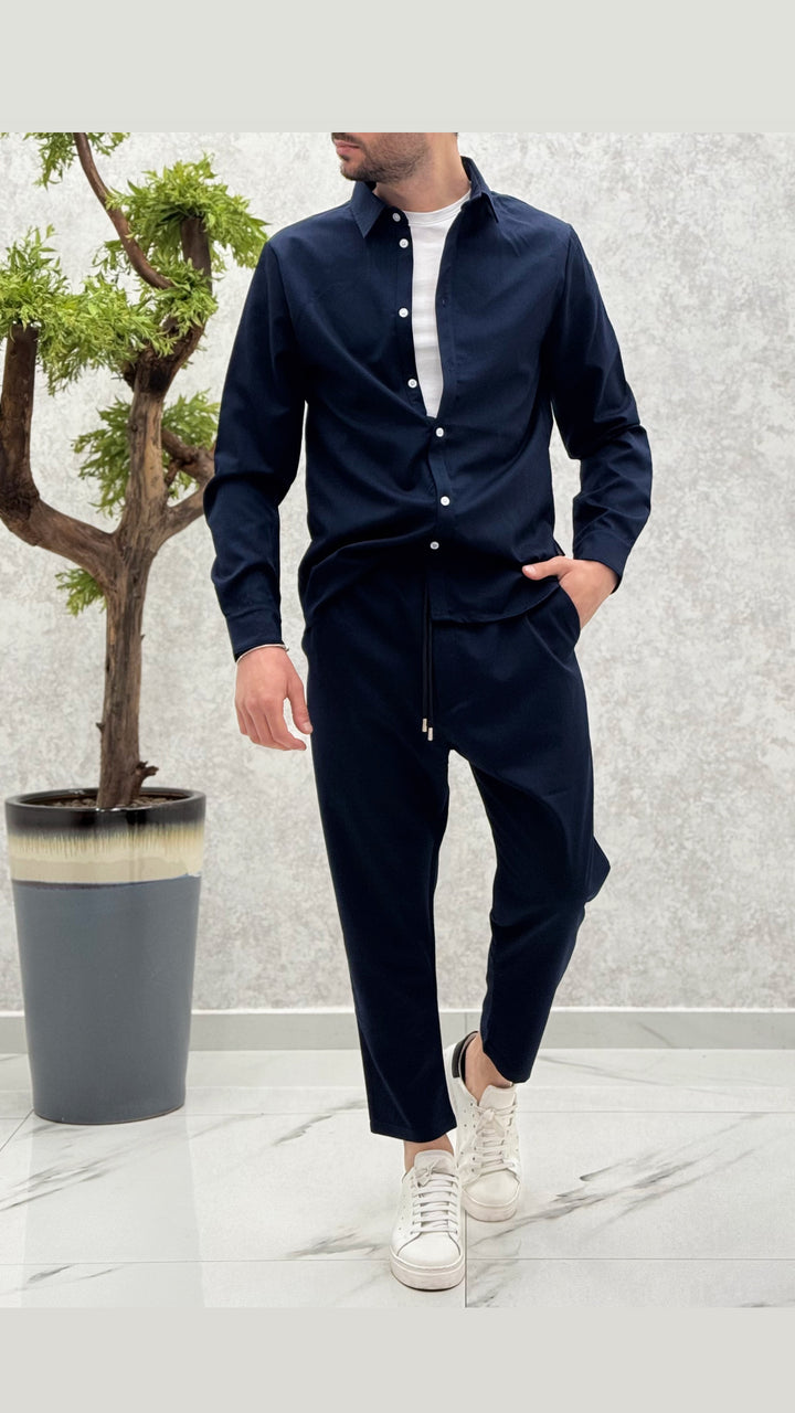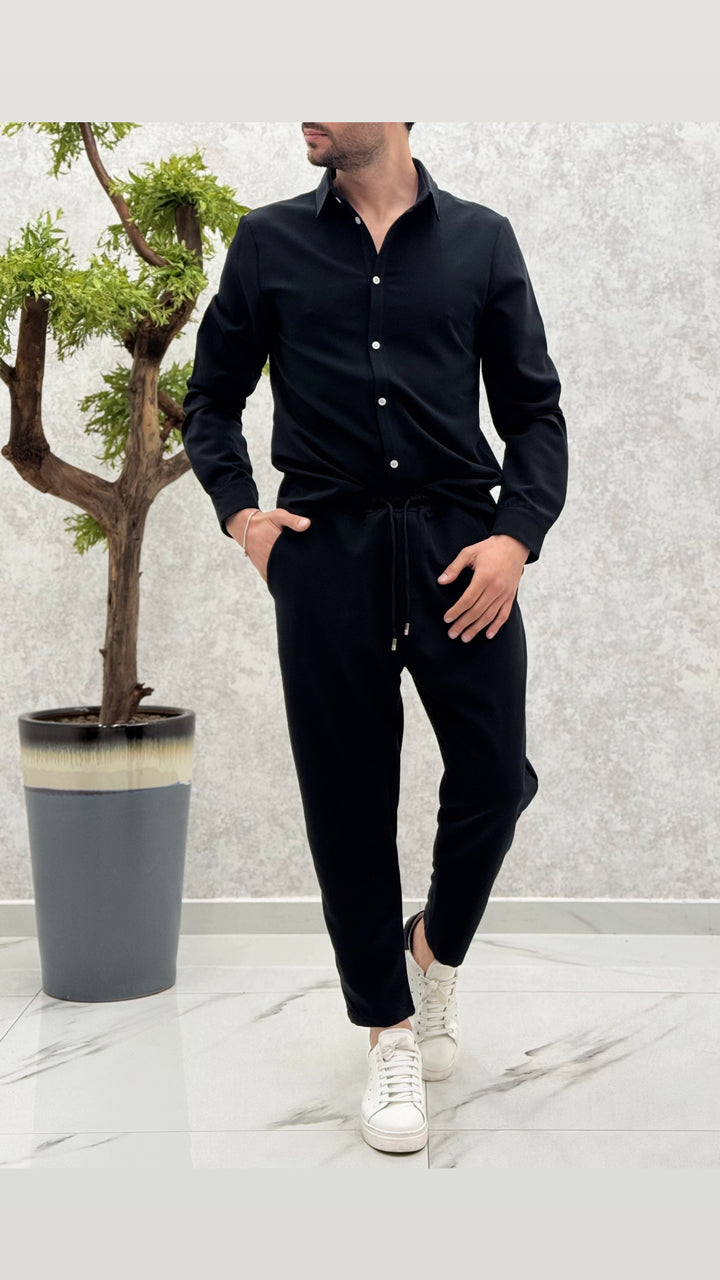 Coordinato composto da camicia con bottoni a contrasto, pantalaccio con elastico e laccetti. Vestibilità regolare, il modello 1,76 per 73kg indossa M