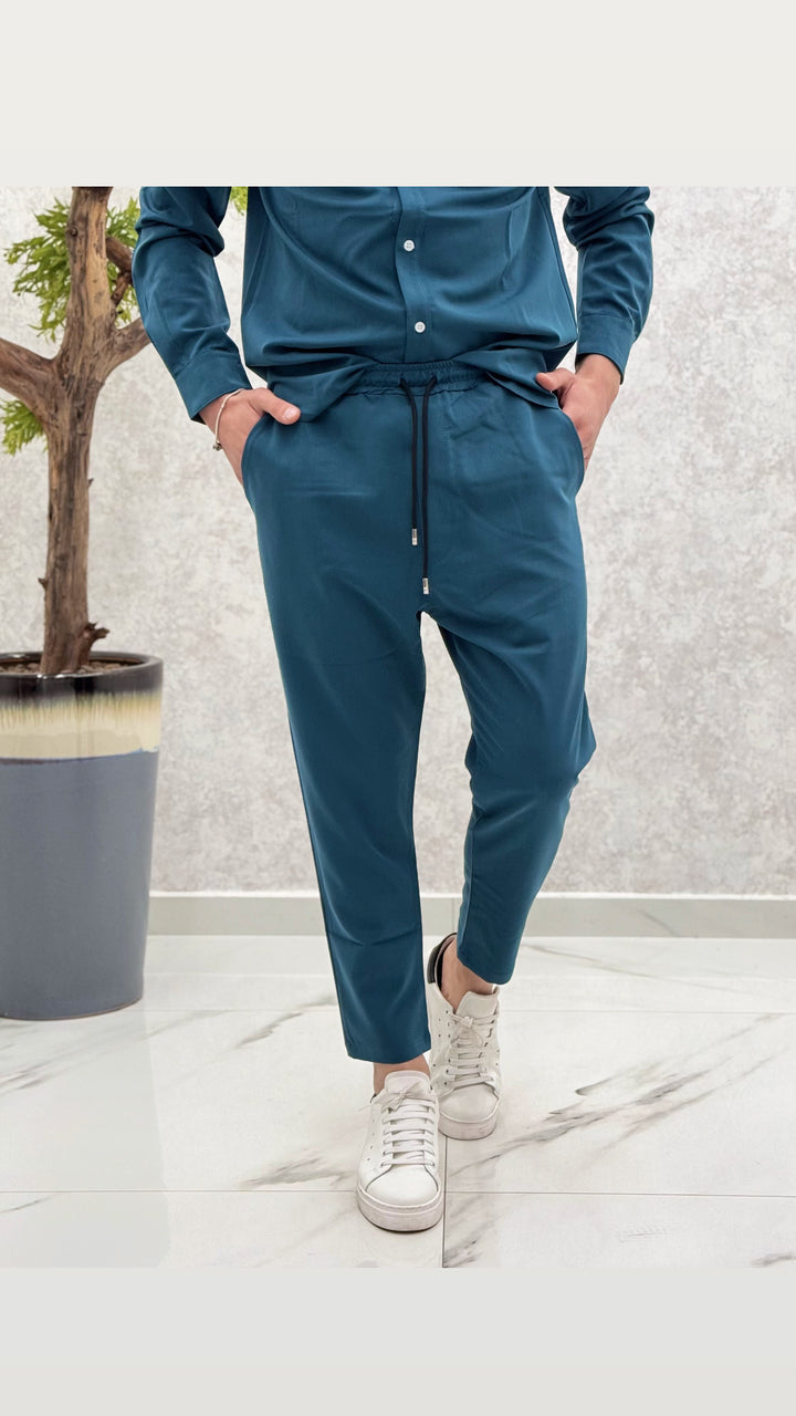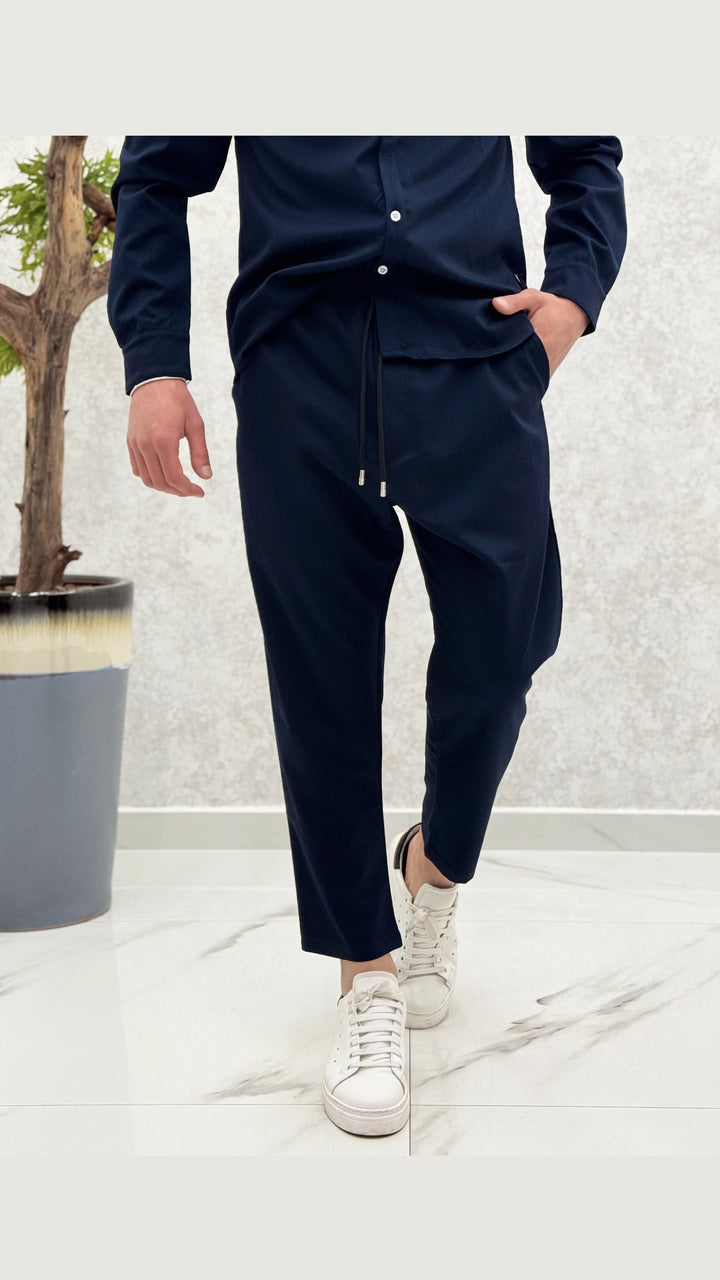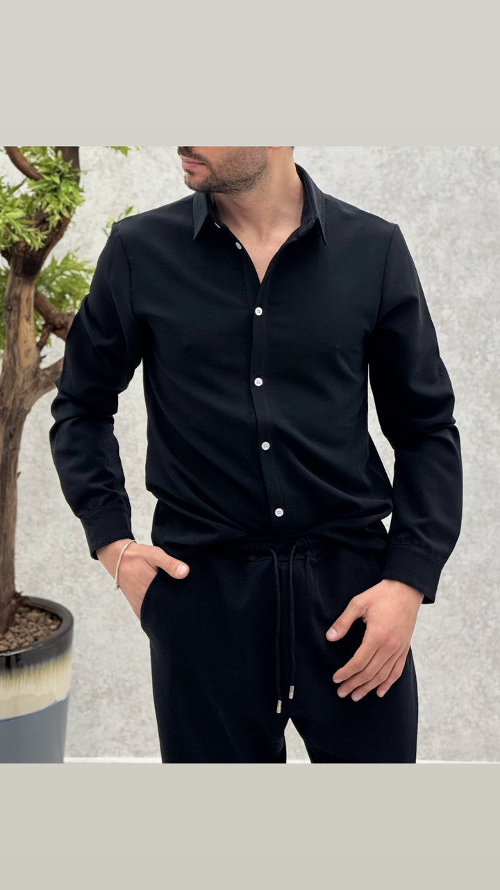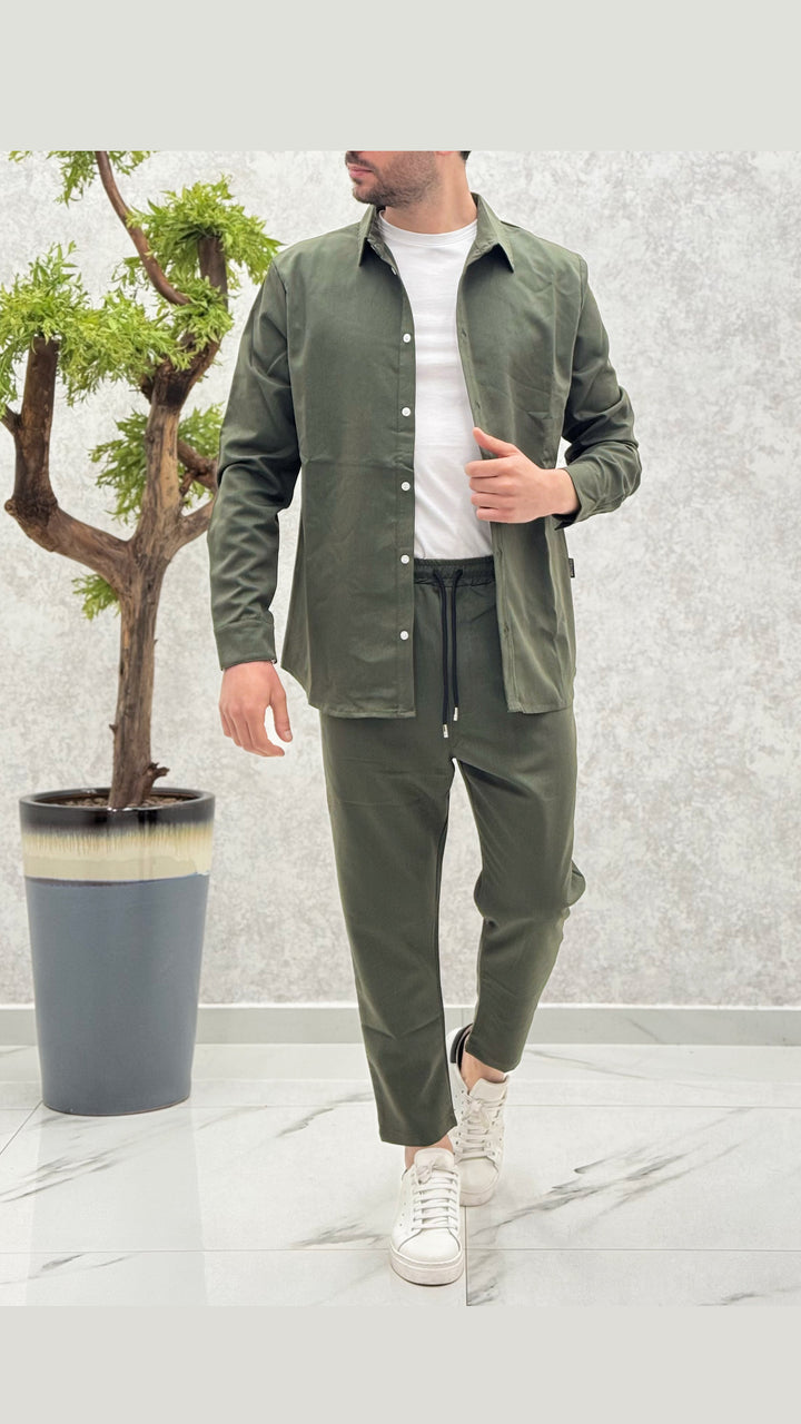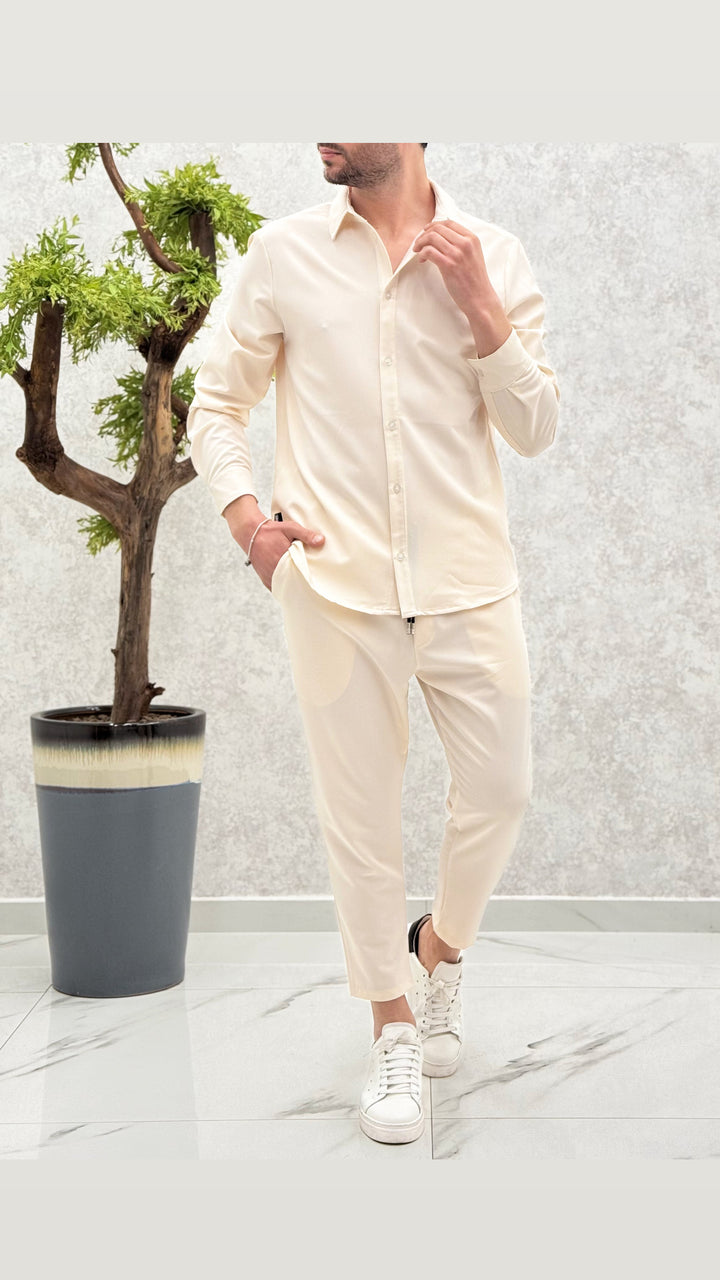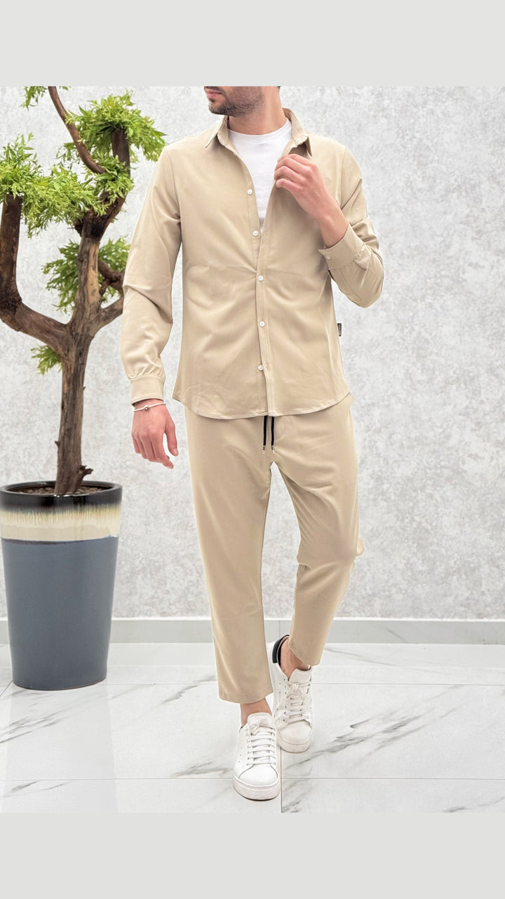 Coordinato composto da camicia con bottoni a contrasto, pantalaccio con elastico e laccetti. Vestibilità regolare, il modello 1,76 per 73kg indossa M