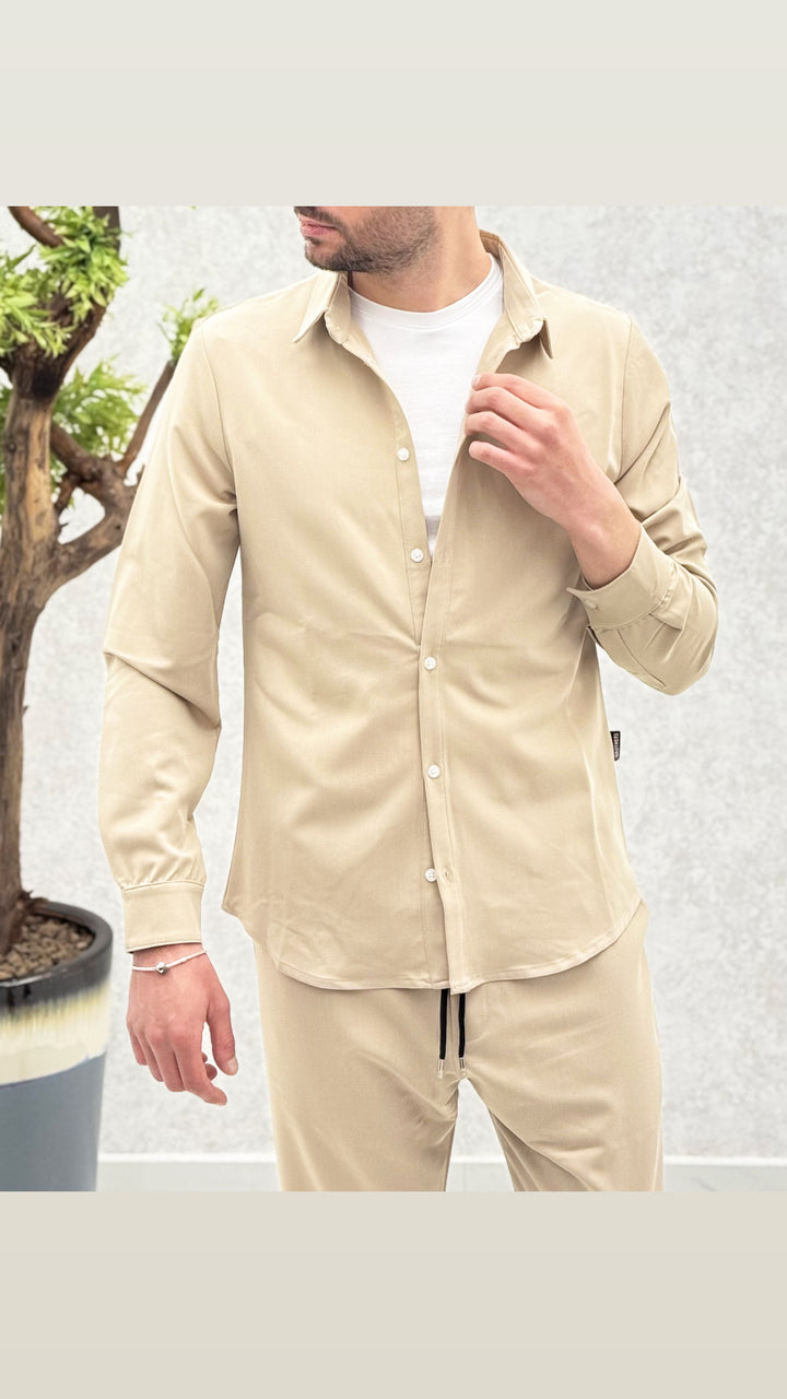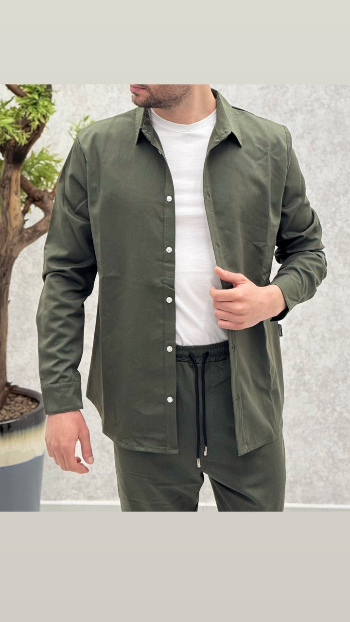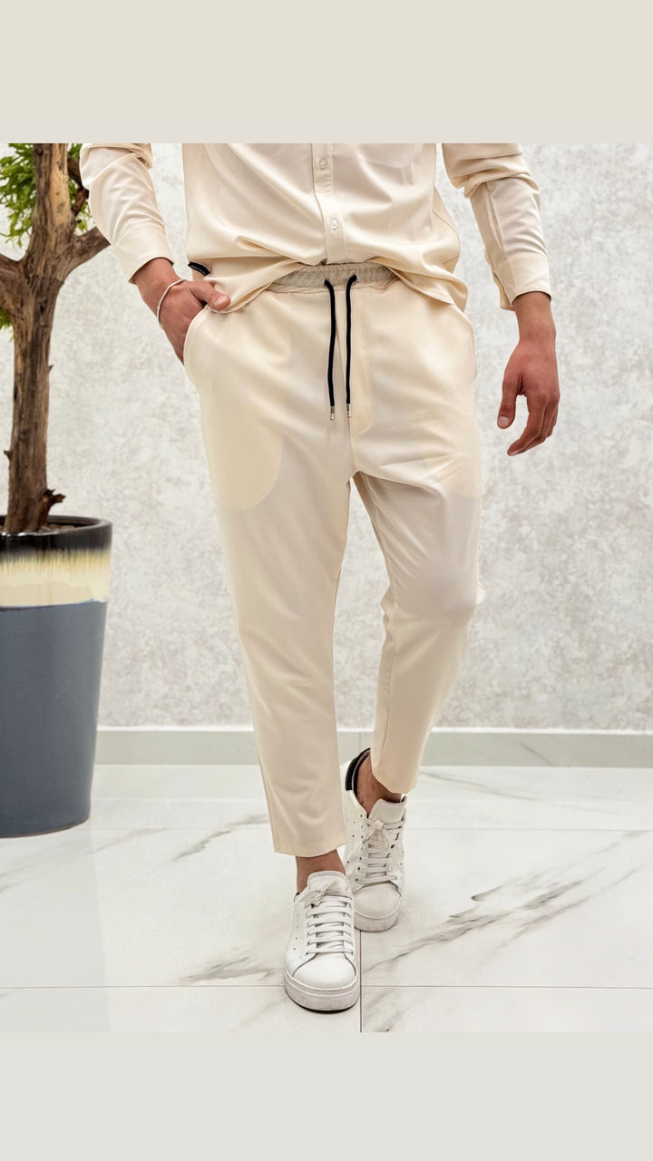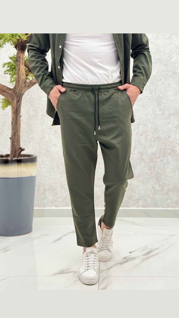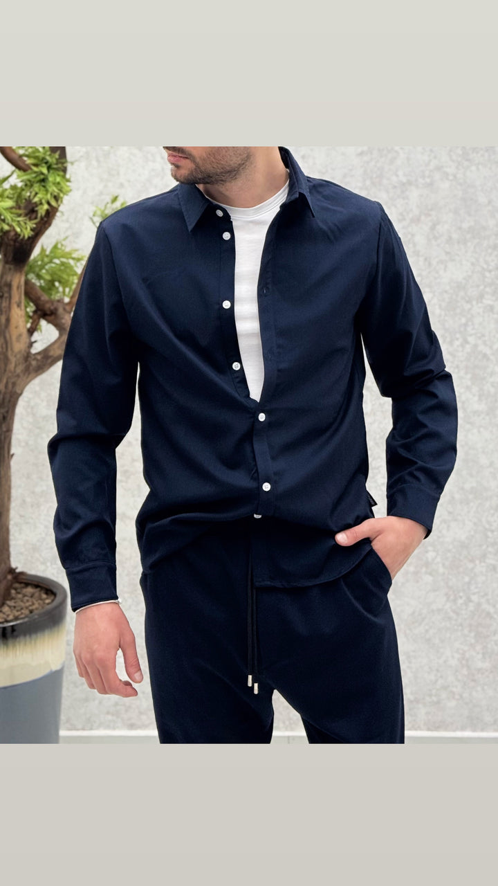 Coordinato composto da camicia con bottoni a contrasto, pantalaccio con elastico e laccetti. Vestibilità regolare, il modello 1,76 per 73kg indossa M