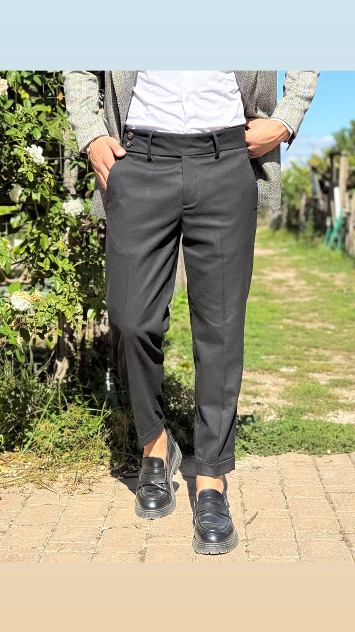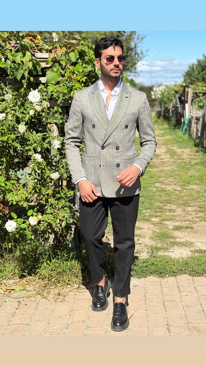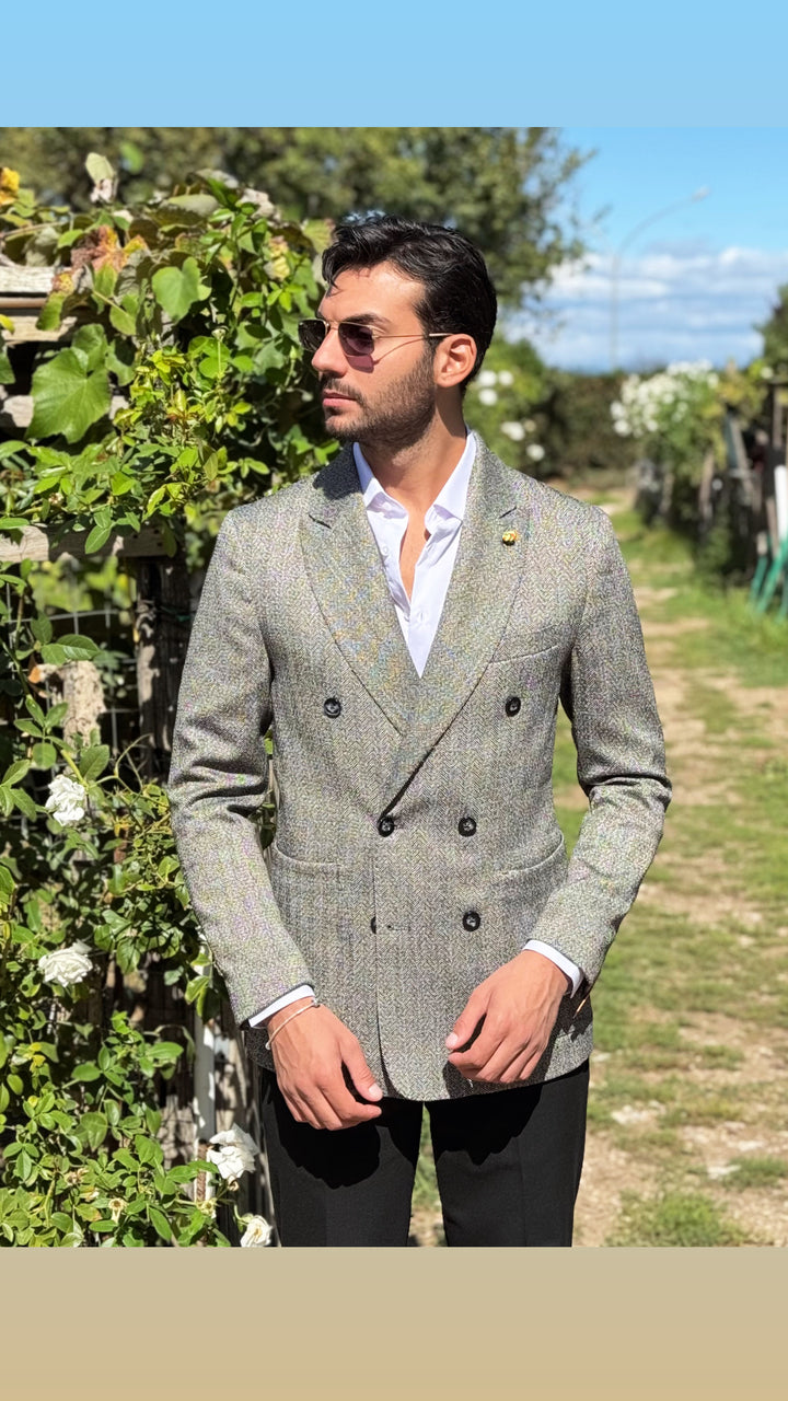 Abito spezzato con giacca doppiopetto, trama spigata, tasca a toppa, con la sua vestibilità regolare abbinata al suo pantalone vita alta Neto, con bottone laterale e risvoltino sul fondo. Il modello 1,76 per 73kg indossa 46