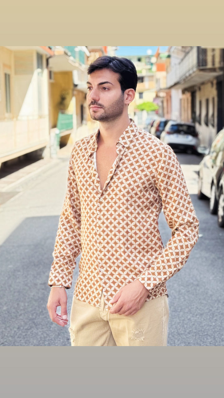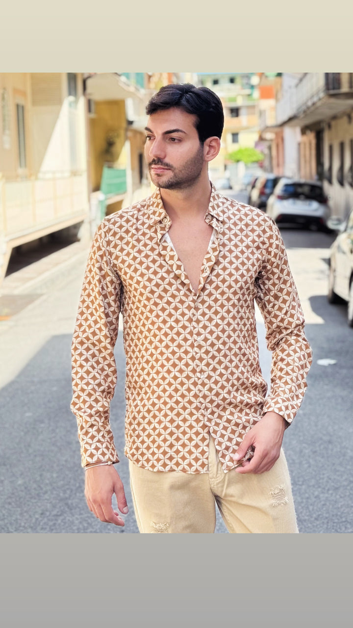 Camicia sartoriale a fantasia , tessuto in viscosa e cotone, bottone in madre perla. vestibilità morbida. Il modello 1,76 per 73kg indossa S