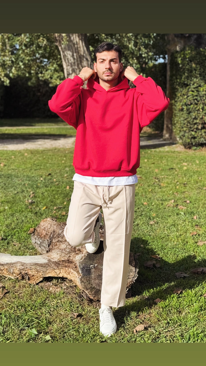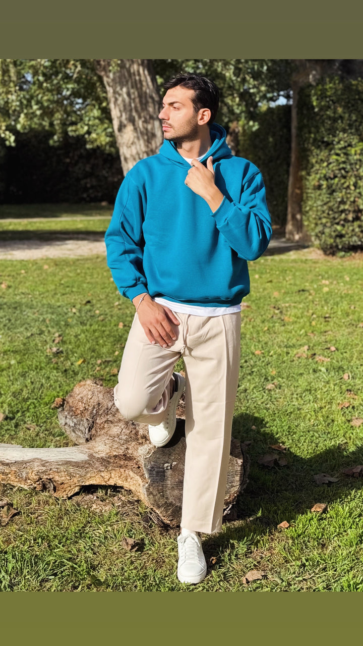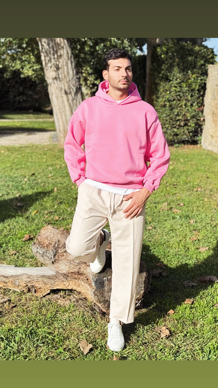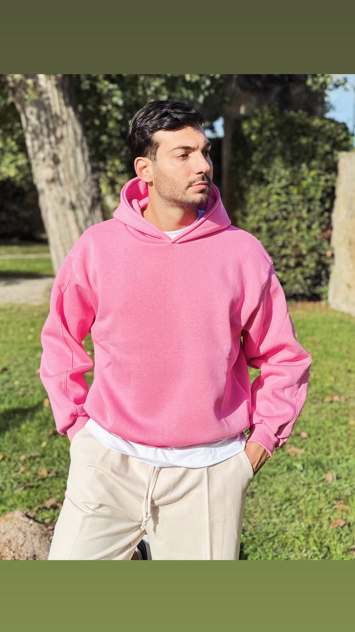 Felpa basic con cappuccio con dettaglio su di esso, disponibile in diverse colorazioni. Vestibilità slim, il modello 1.76 per 73kg indossa M