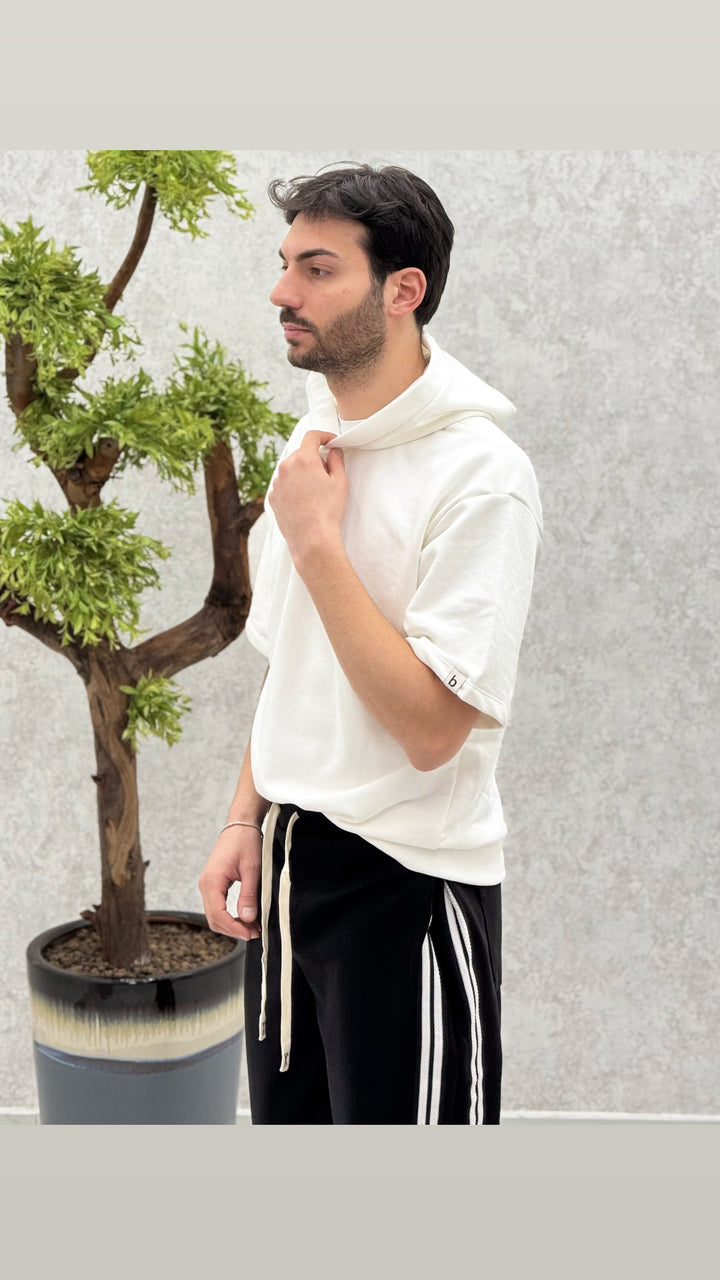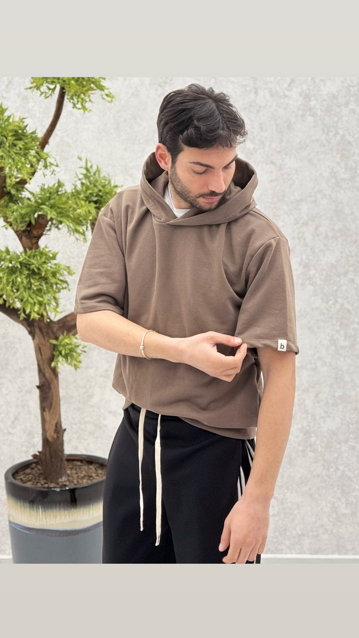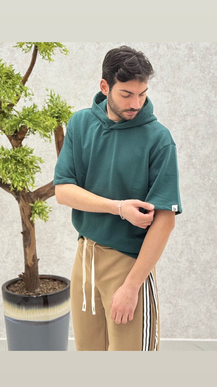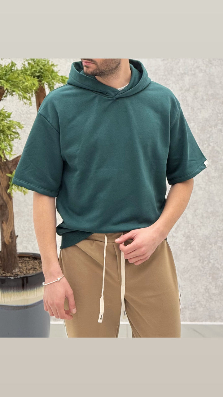 Felpa basic mezza manica con cappuccio, vestibilità comoda. Il modello 1,76 per 73kg indossa S