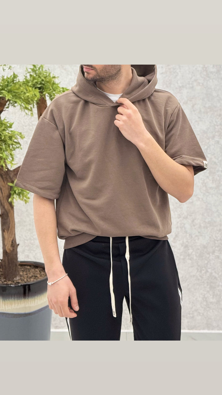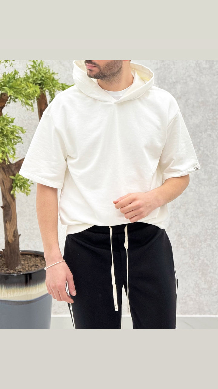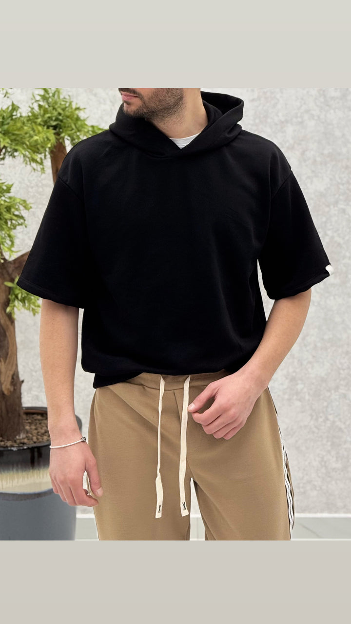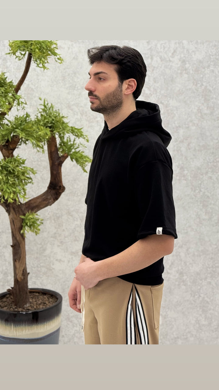 Felpa basic mezza manica con cappuccio, vestibilità comoda. Il modello 1,76 per 73kg indossa S