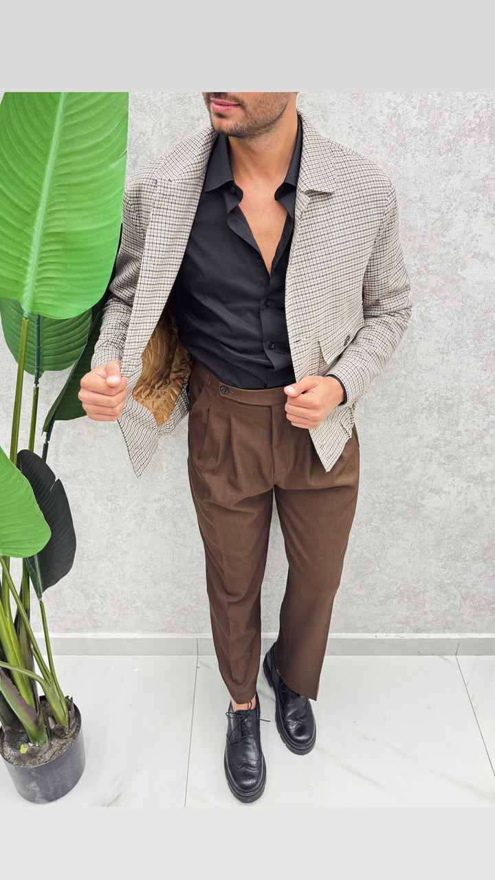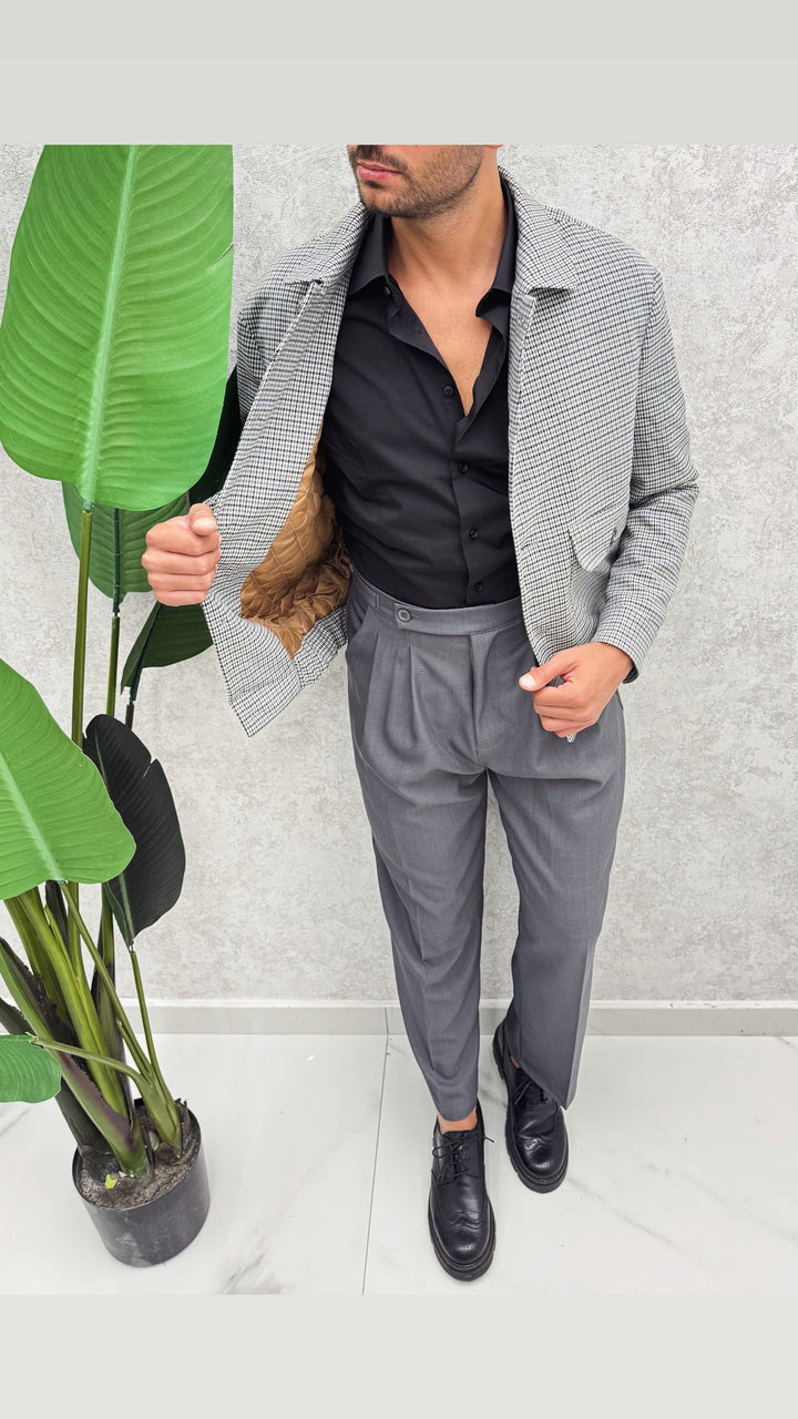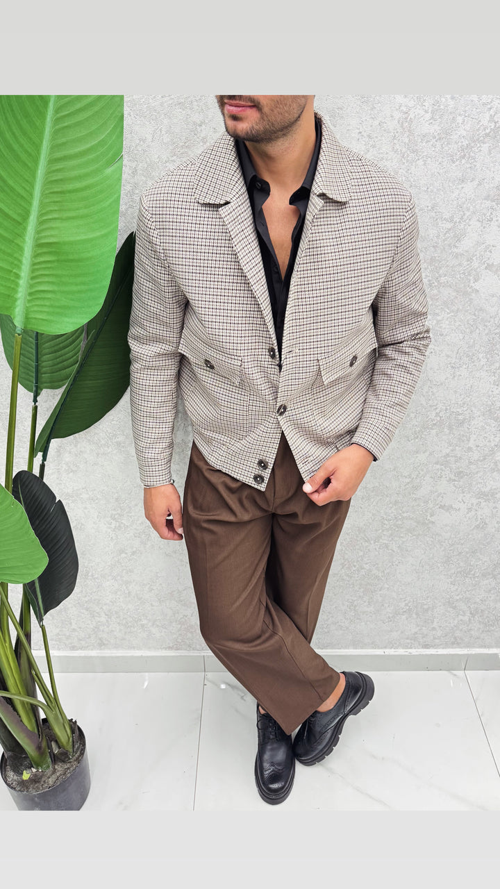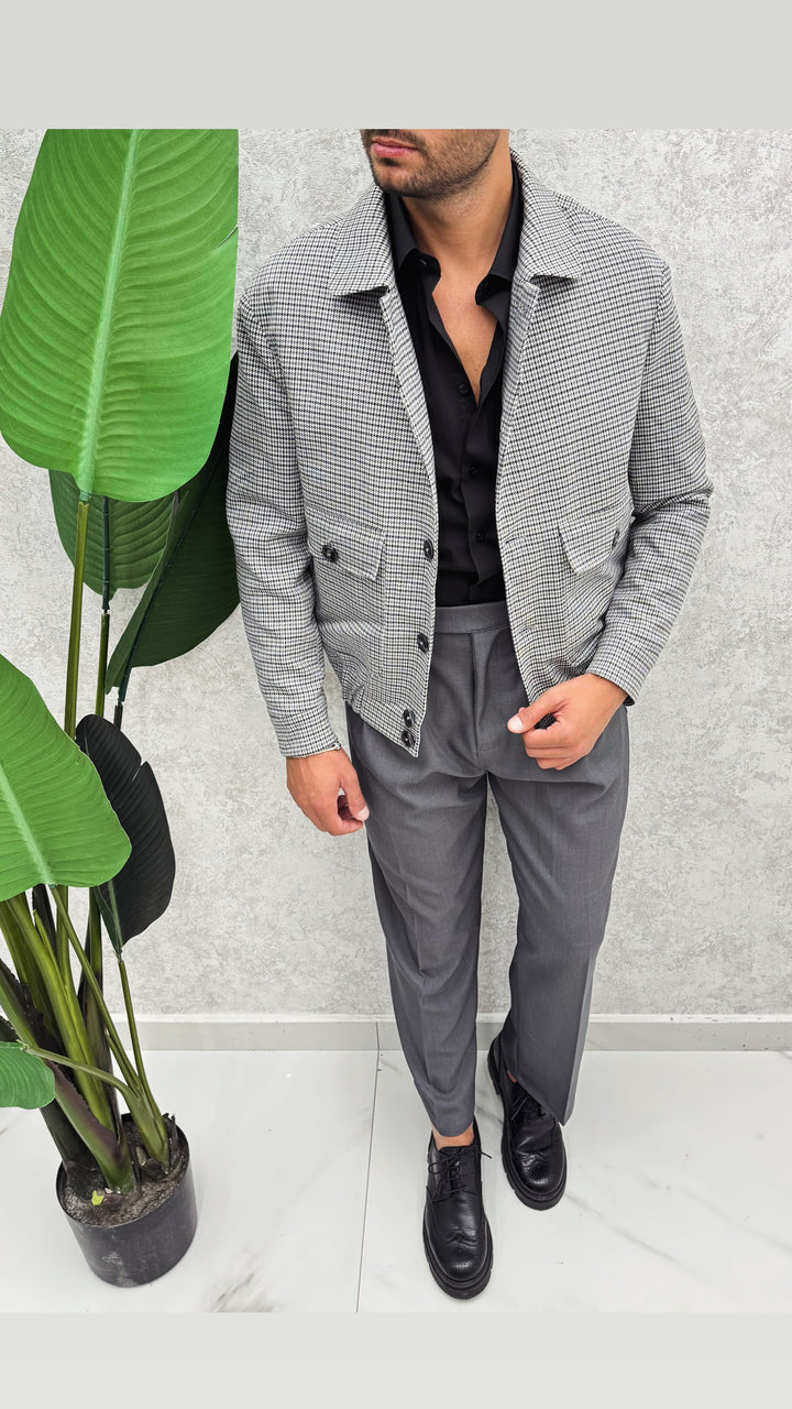 Giubbino a fantasia con collo a camicia, bottoni a contrasto, tasconi con pattina e bottone, molla nascosta sul fondo. Vestibilità regolare, il modello 1.76 per 73kg indossa 46