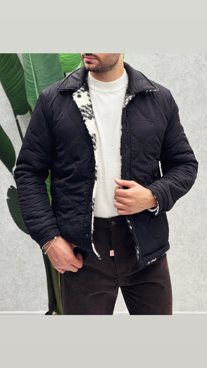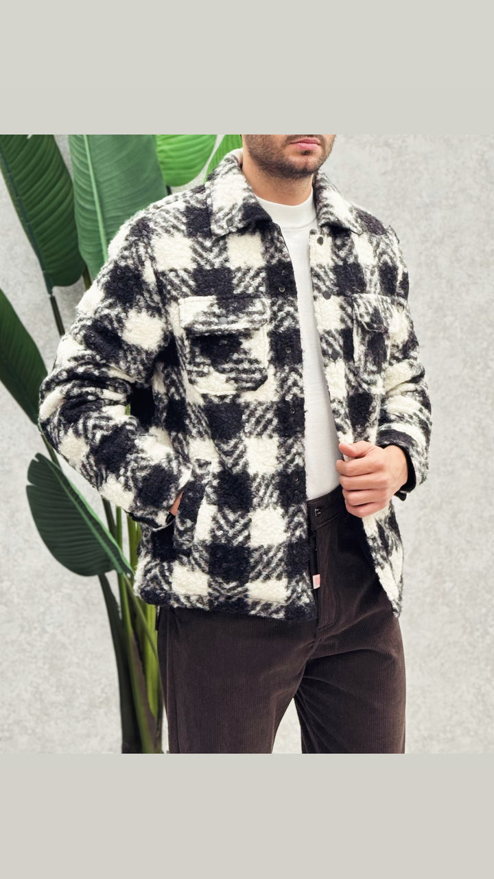 Giubbino modello riversibile, lato bianco è in tessuto lana cotta con fantasia a quadri mentre il lato nero tessuto bomberino. Vestibilità slim, il modello 1.76 per 73kg indossa M