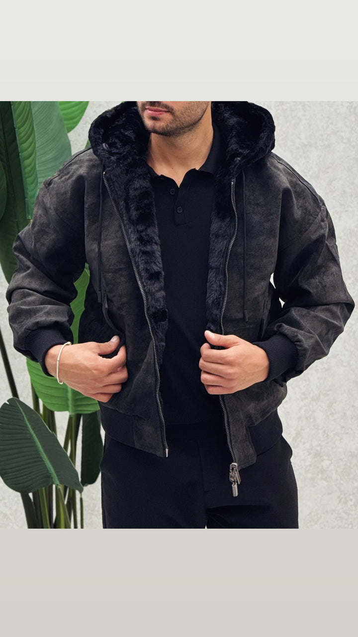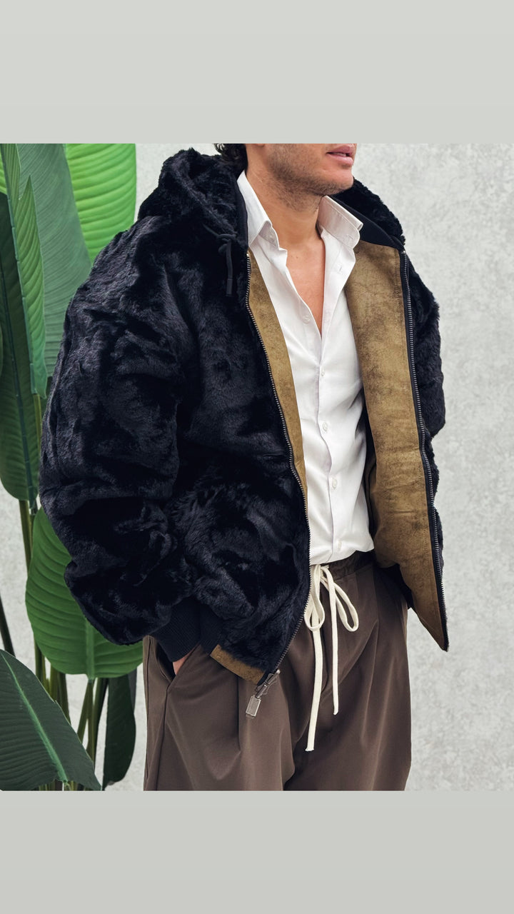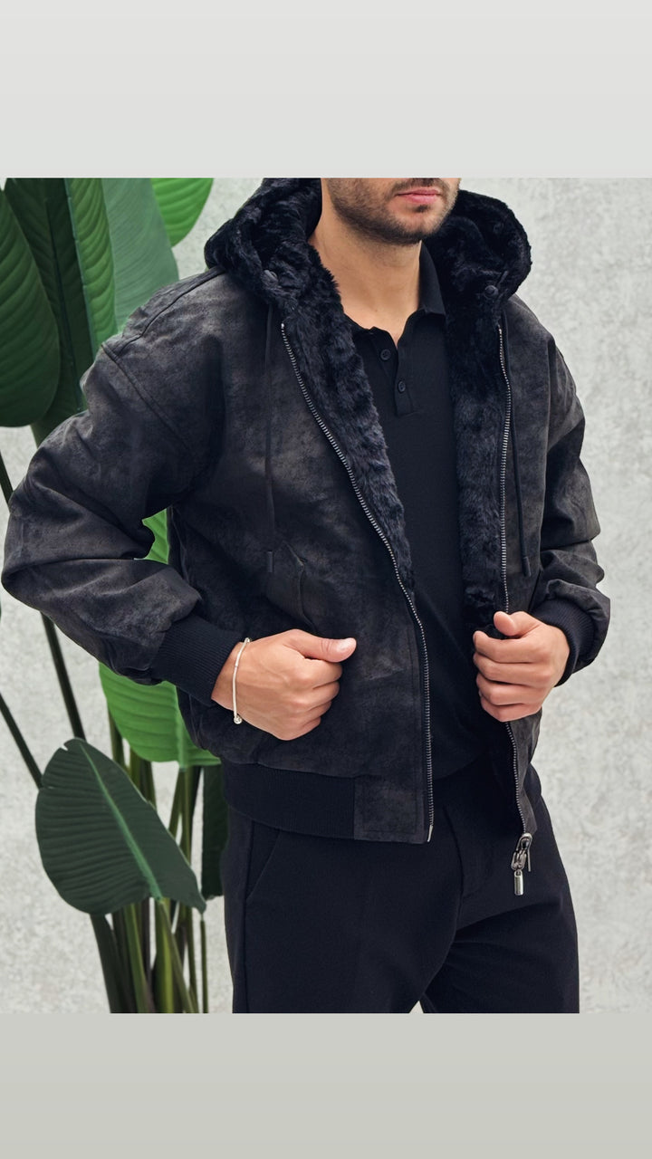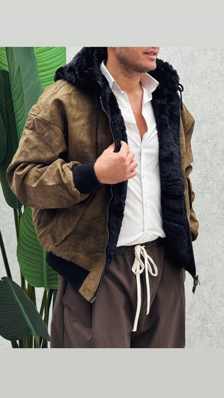 Giubbino effetto pelle modello double face con cappuccio e pelliccia interna, chiusura con zip. Vestibilità slim, giubbino caldo e chic per i vostri outfit. Il modello 1,76 per 73kg indossa L
