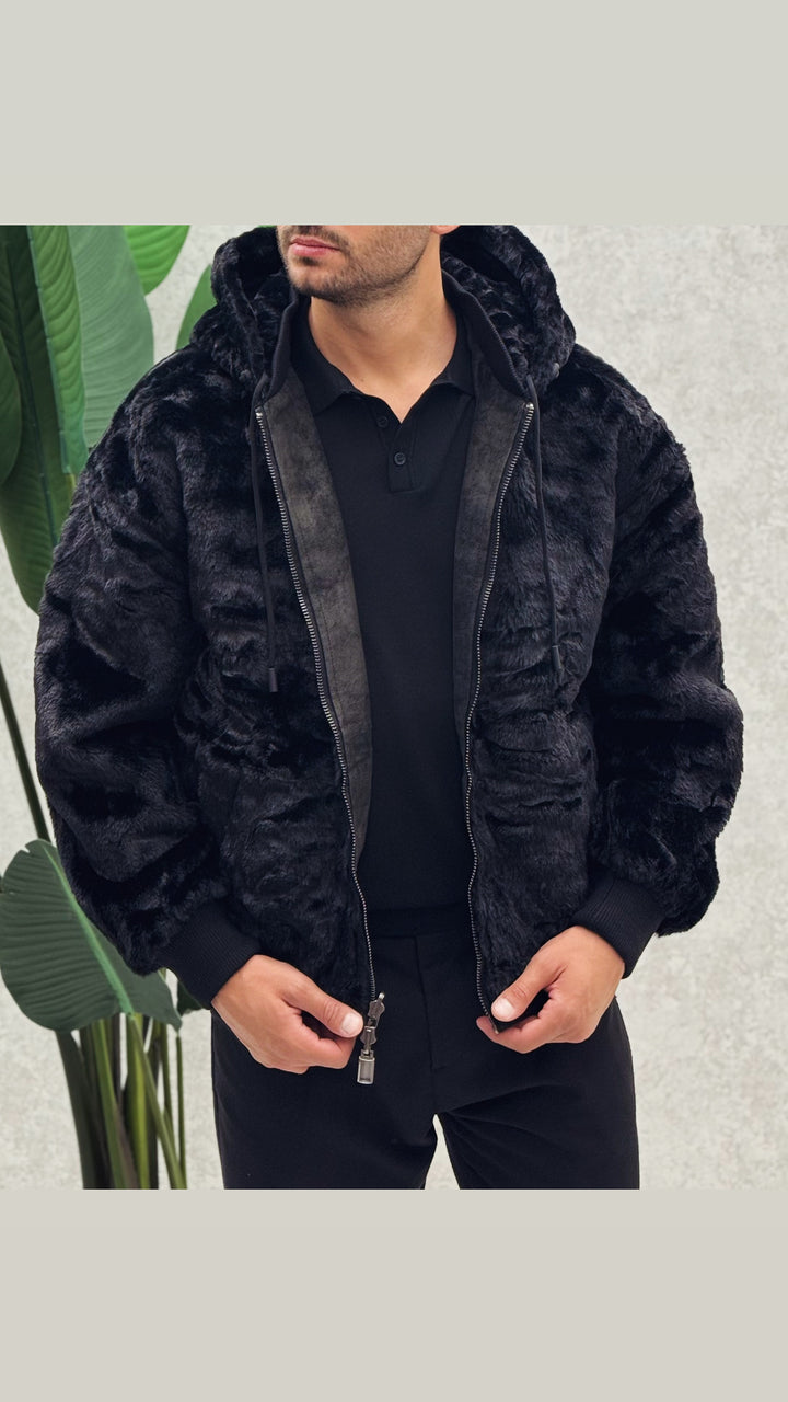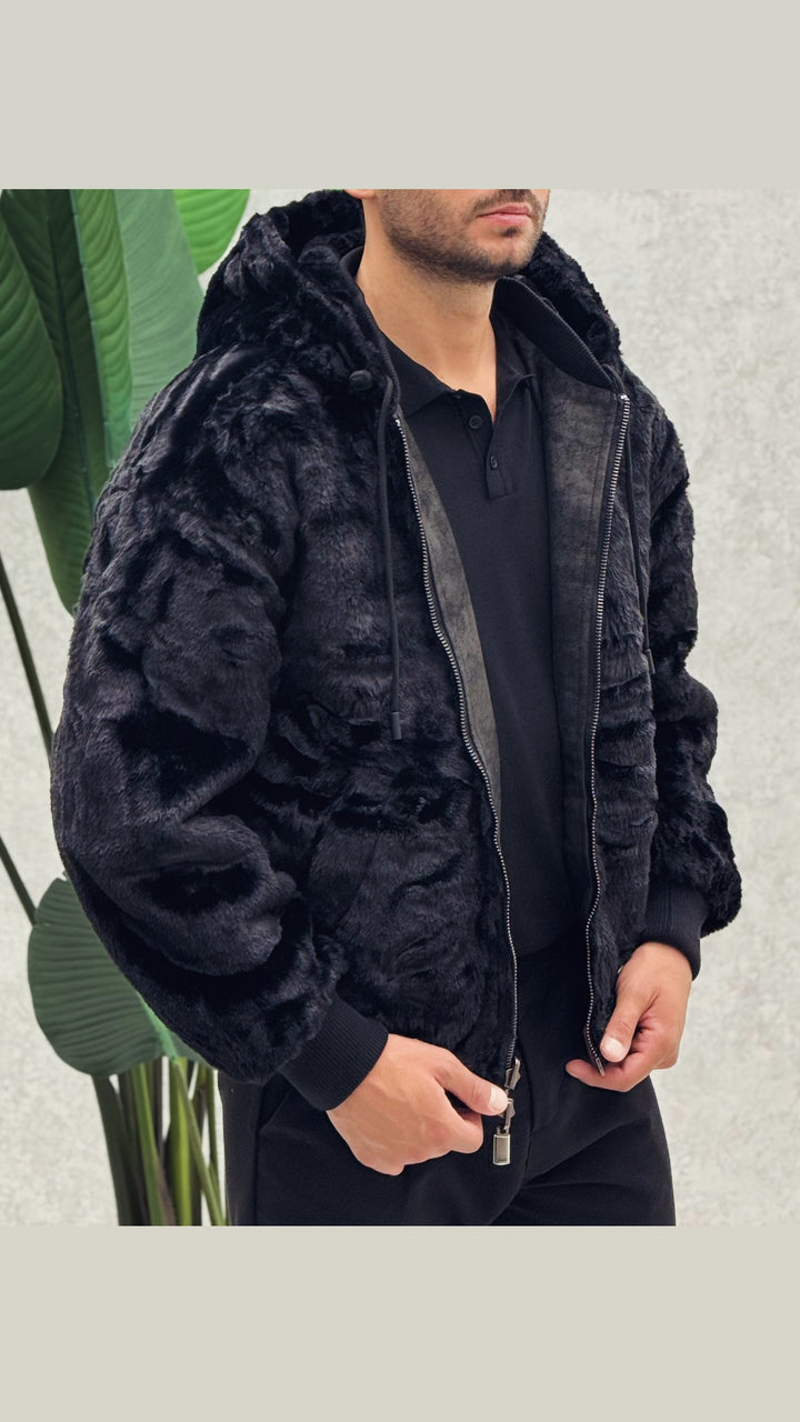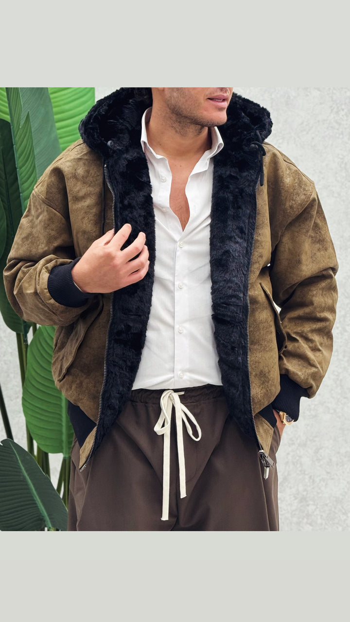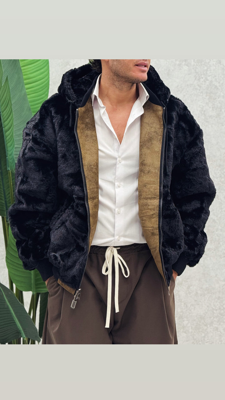 Giubbino effetto pelle modello double face con cappuccio e pelliccia interna, chiusura con zip. Vestibilità slim, giubbino caldo e chic per i vostri outfit. Il modello 1,76 per 73kg indossa L