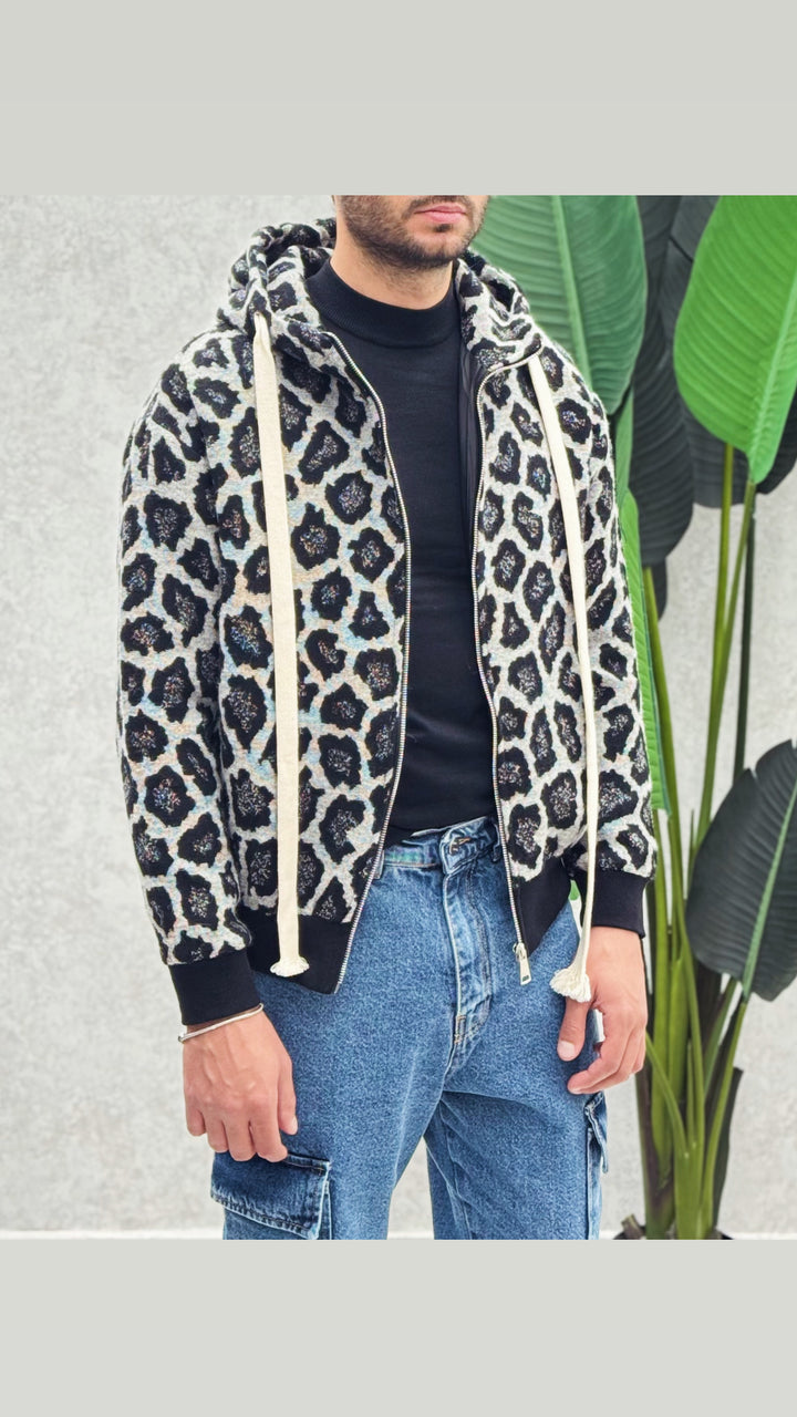Jacket con cappuccio in tessuto panno con fantasia maculata, chiusura con zip in metallo. vestibilità regolare, il modello 1,76 per 73kg indossa M