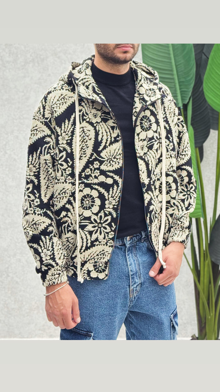 Jacket con cappuccio in tessuto panno sfoderato con fantasia floreale, chiusura con zip in metallo. vestibilità regolare, il modello 1,76 per 73kg indossa M