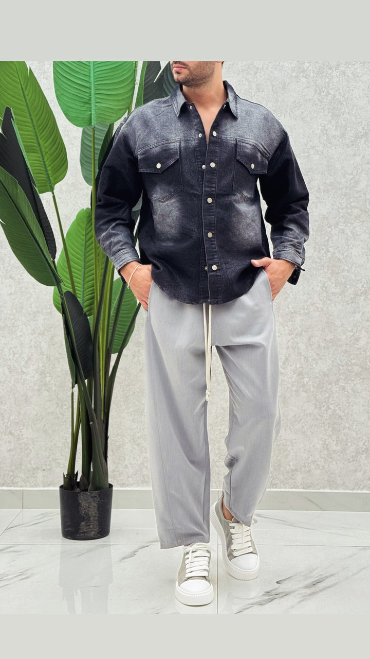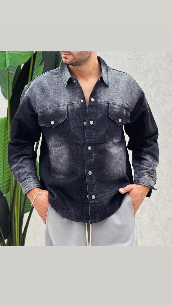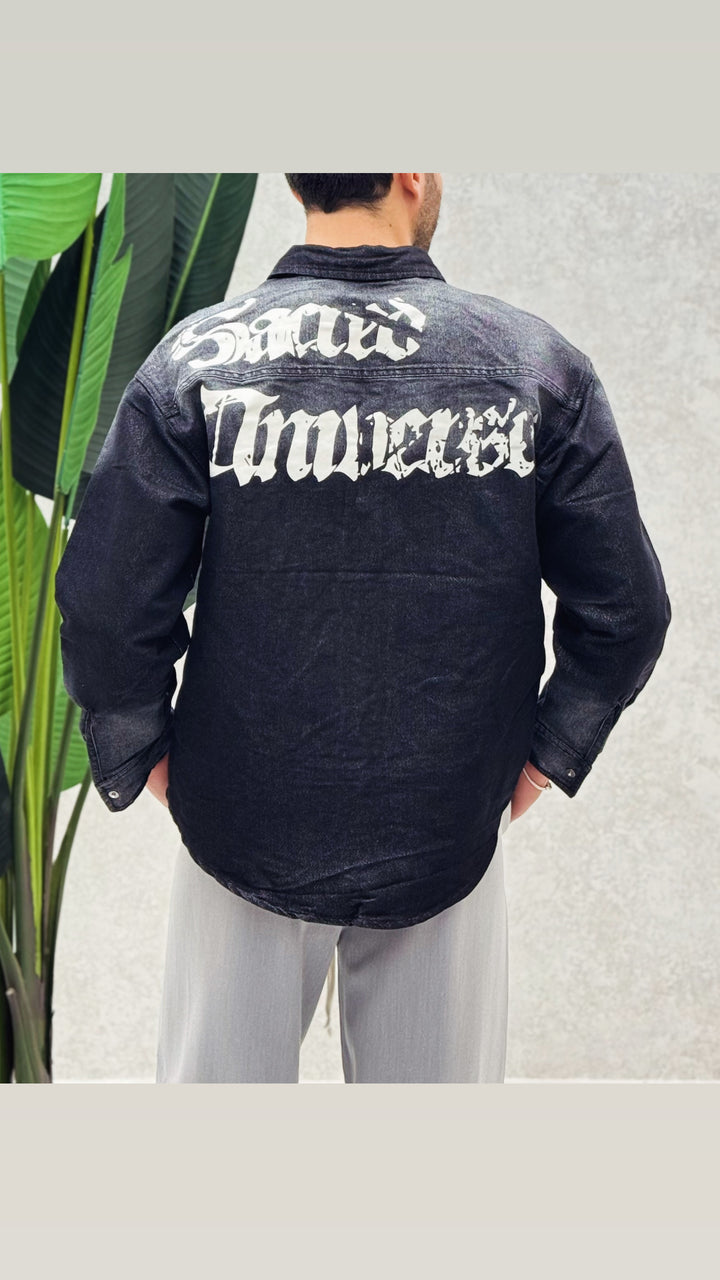 Jacket tessuto jeans con effetto laminato , dettaglio con scritta a pittura sul retro, bottini in metallo a ciappa e tasche con pattina sul davanti. Vestibilità semi over, il modello 1,76 per 73kg indossa S