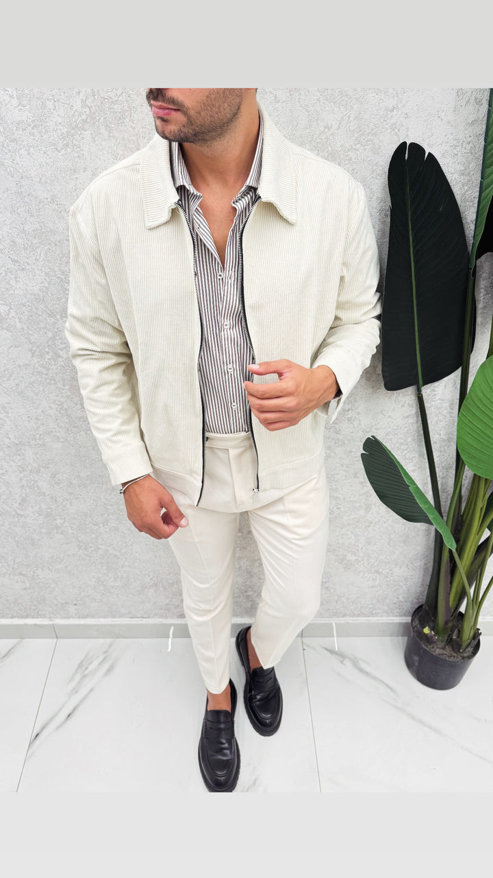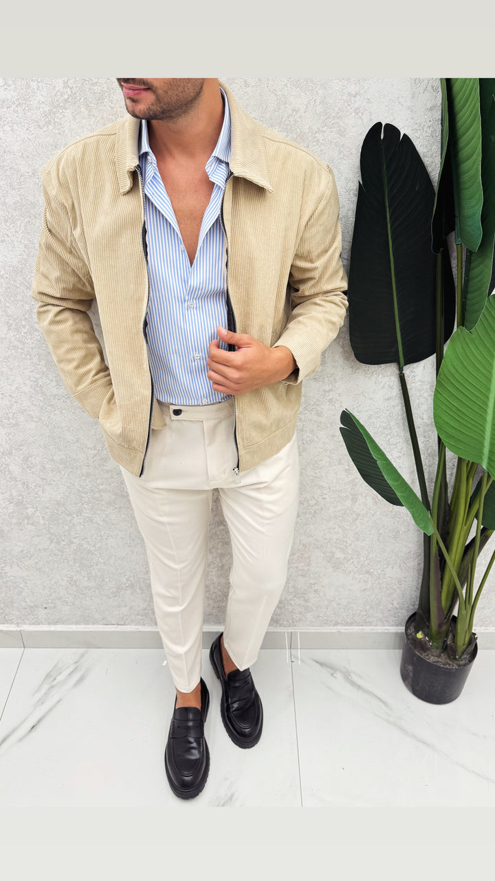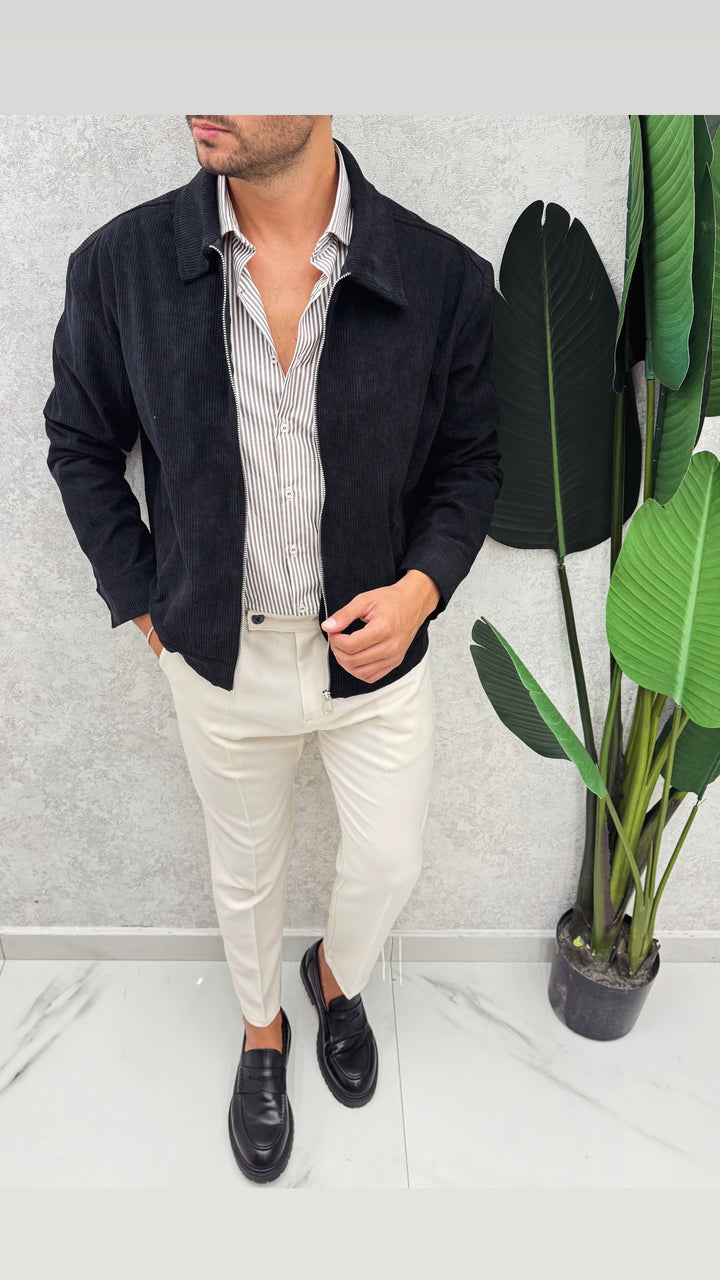 jacket Milano in tessuto costine velluto con zip centrale e collo camice, super versatile per ogni completo. Il modello in foto 1,76 x 73 e indossa S vestibilità comoda