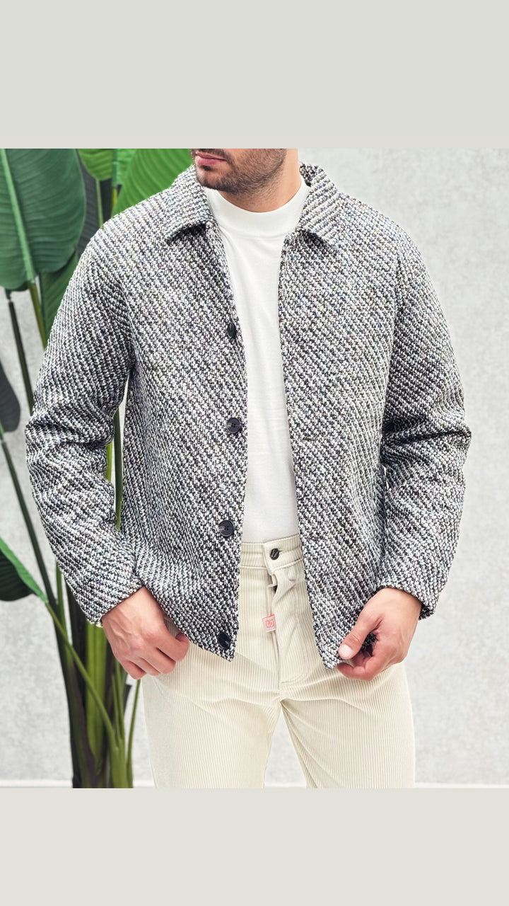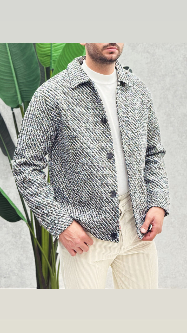Jacket a fantasia puntellata sale e pepe, vestibilità regolare. Il modello 1.76 per 73kg indossa M