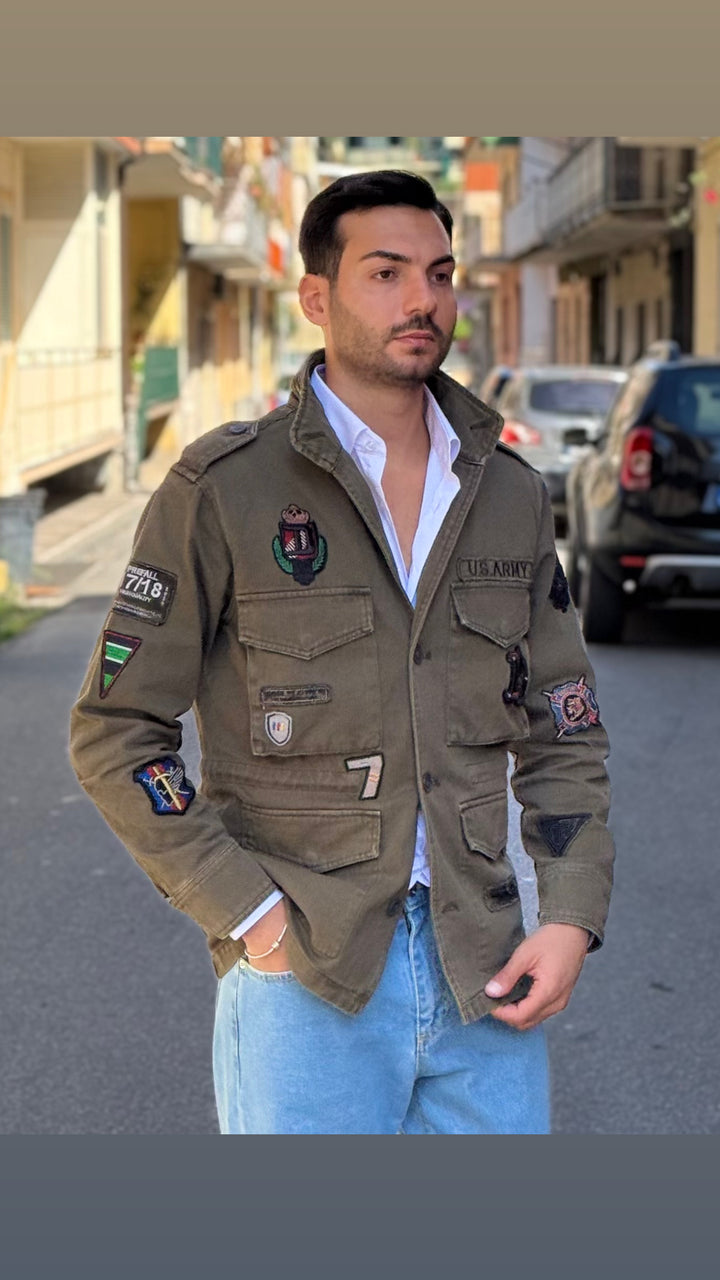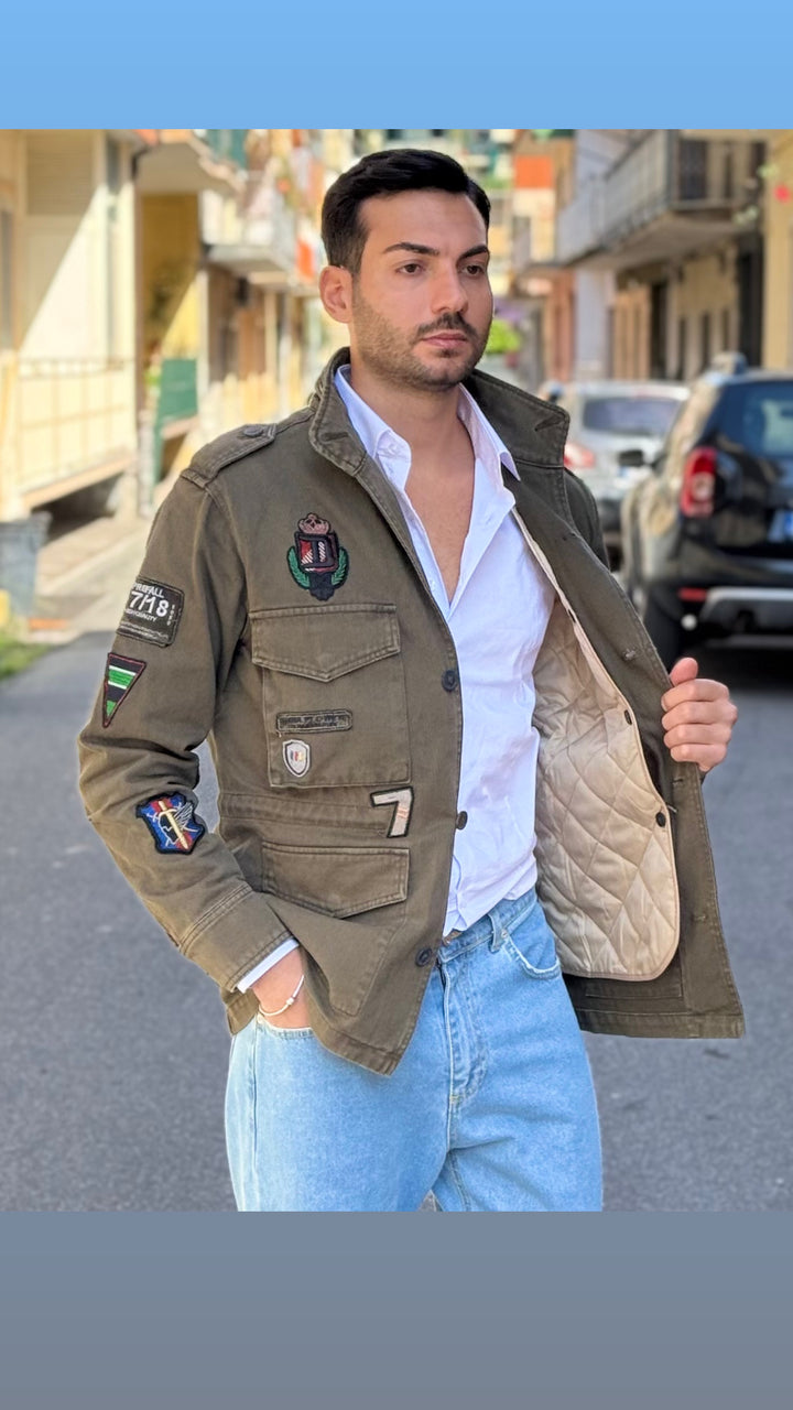 Jacket premium in tessuto jeans con imbottitura a piumino removibile all'interno, tasconi sul davanti, chiusura con bottoni a contrasto, zip sul colletto, patchwork su gran parte del jacket. Vestibilità regolare, il modello 1.76 per 73kg indossa M