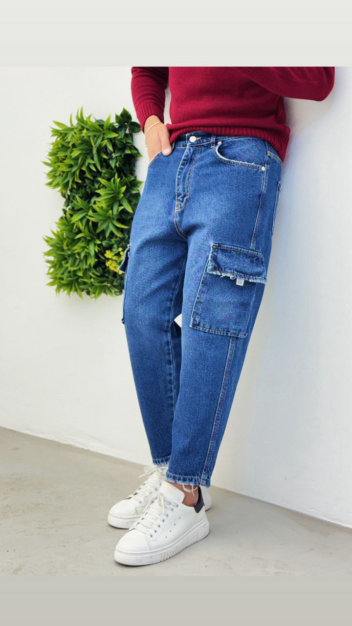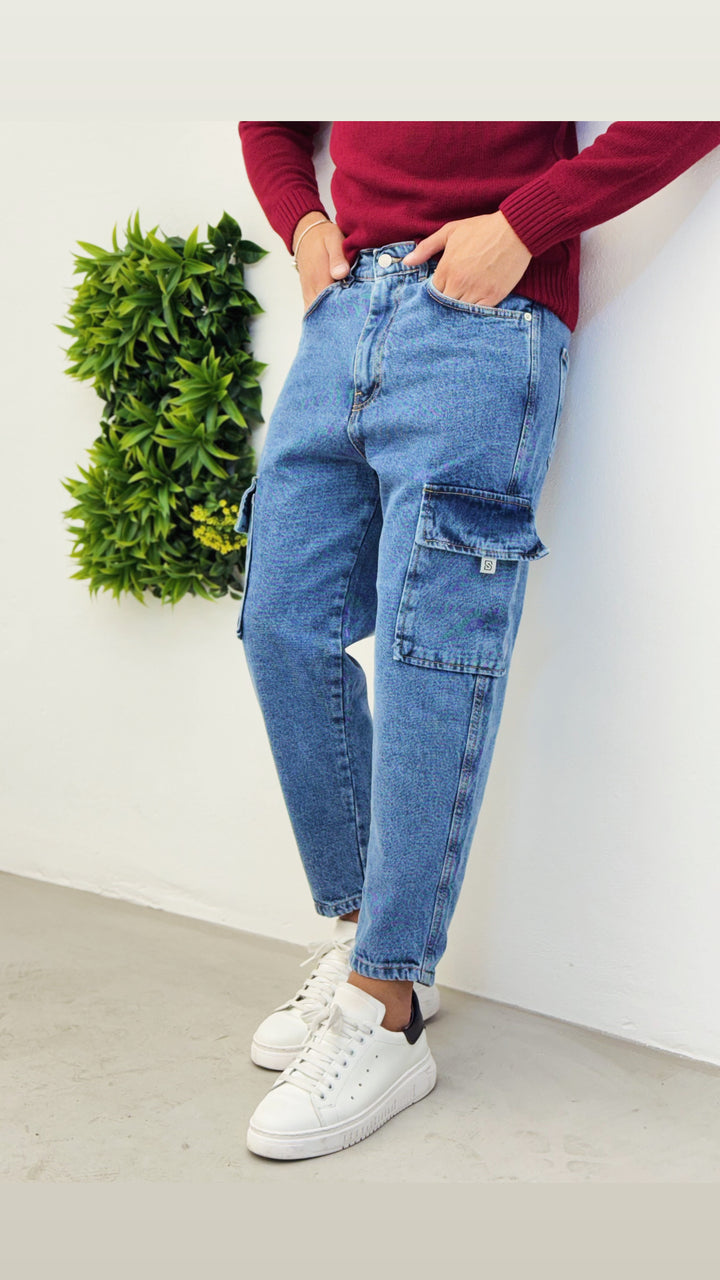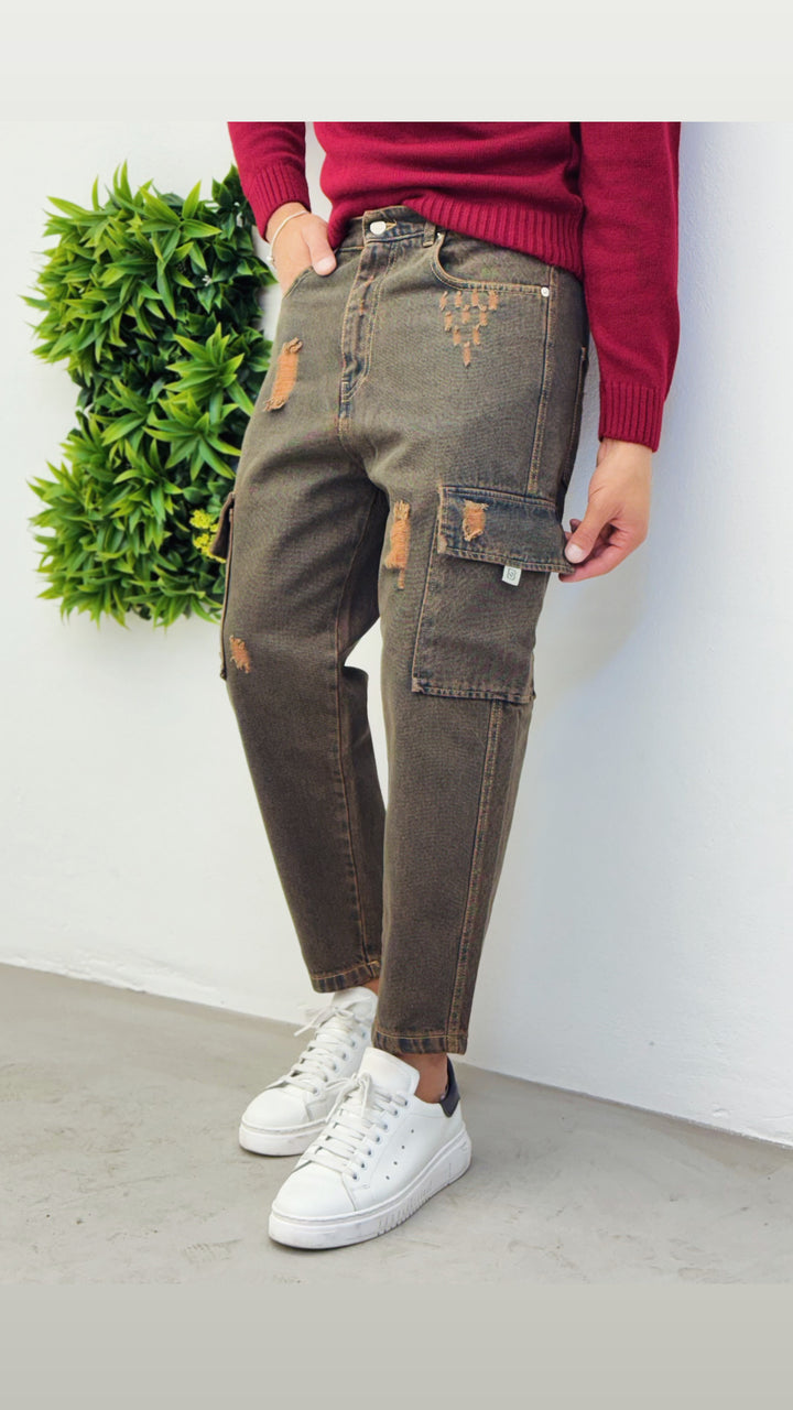 Jeans modello cargo con tasconi laterali con piccole abrasioni, dettaglio con lettera su un lato. Vestibilità slim, il modello 1,76 per 73kg indossa 46