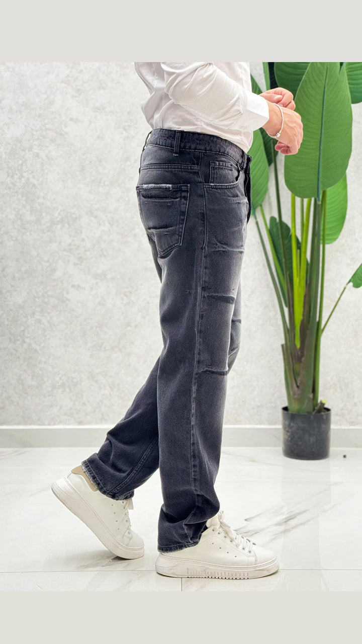 Jeans fondo largo con sfumature a contrasto, vestibilità slim, il modello 1,76 per 73kg indossa 46