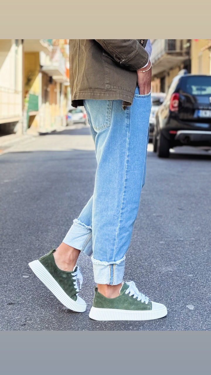 Jeans basic con abrasioni su tasche, risvolto fisso sul fondo, cuciture a rilievo a contrasto. Vestibilità slim, il modello1,76 per 73kg indossa 46