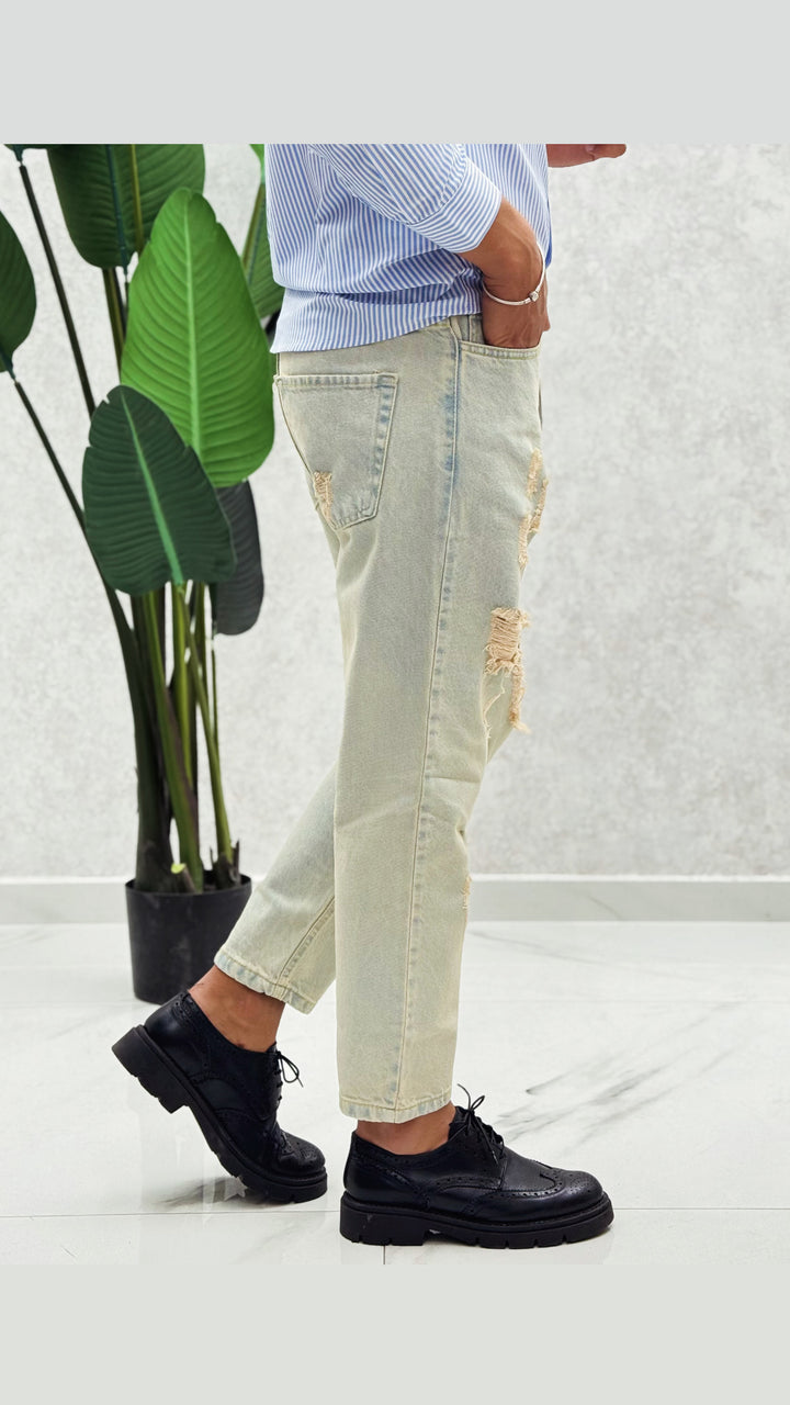 Jeans in colorazione chiara con strappi e usure a contrasto sabbiate, vestibilità slim. il modello 1.76 per 73kg indossa 46
