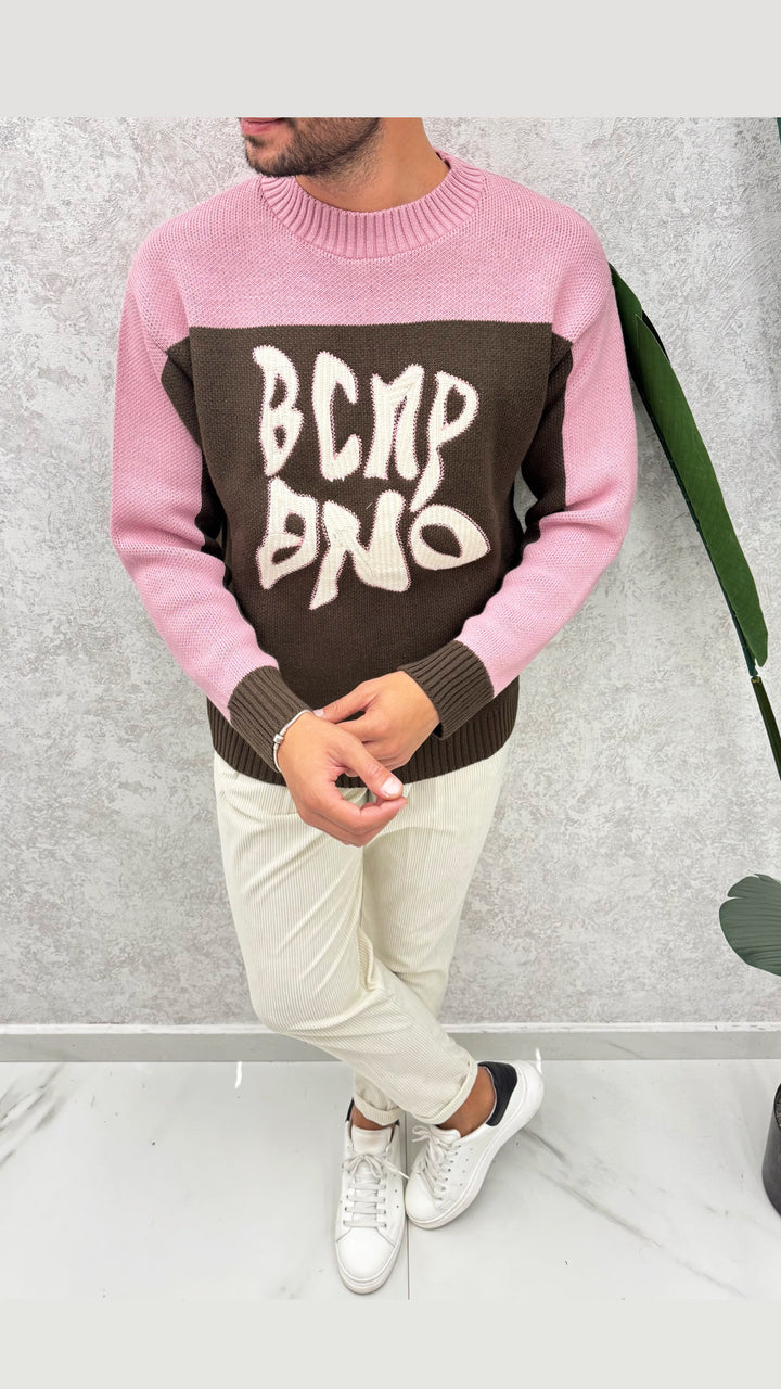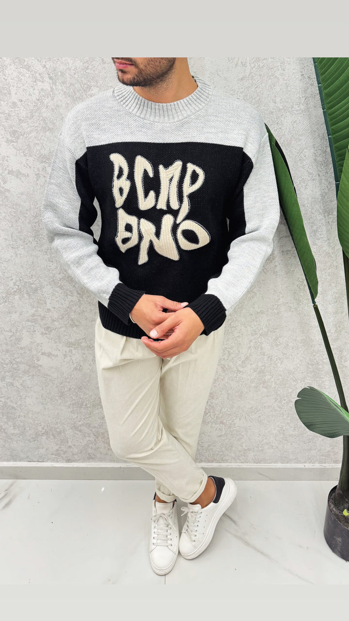 Maglione a giro collo con colori e scritta a contrasto. Vestibilità regolare, il modello 1.76 per 73kg indossa M
