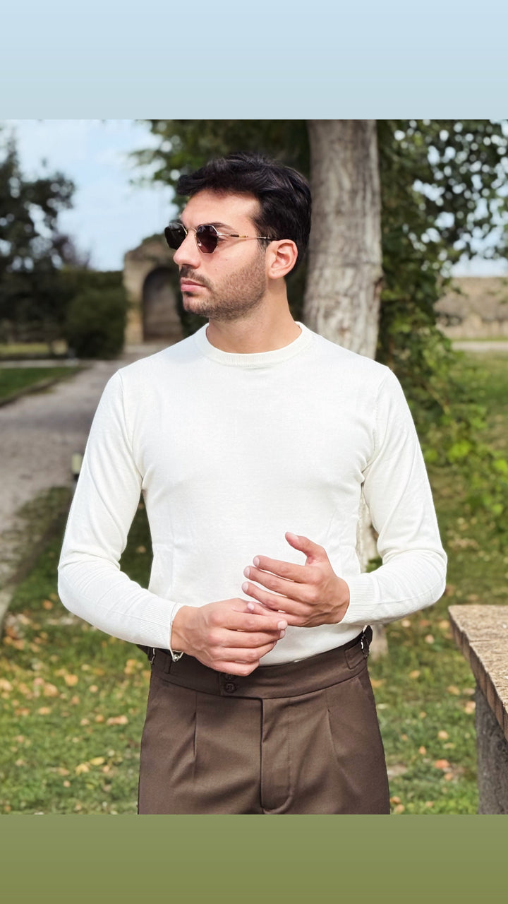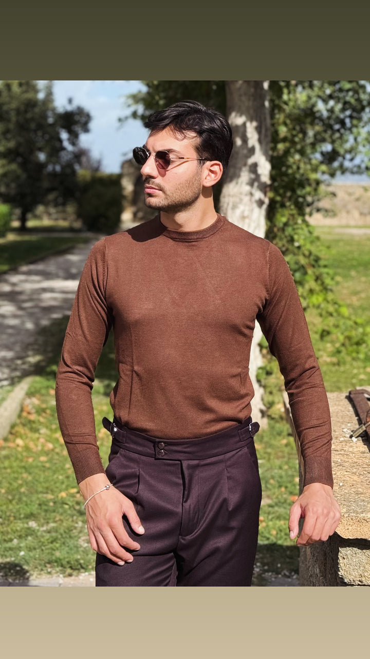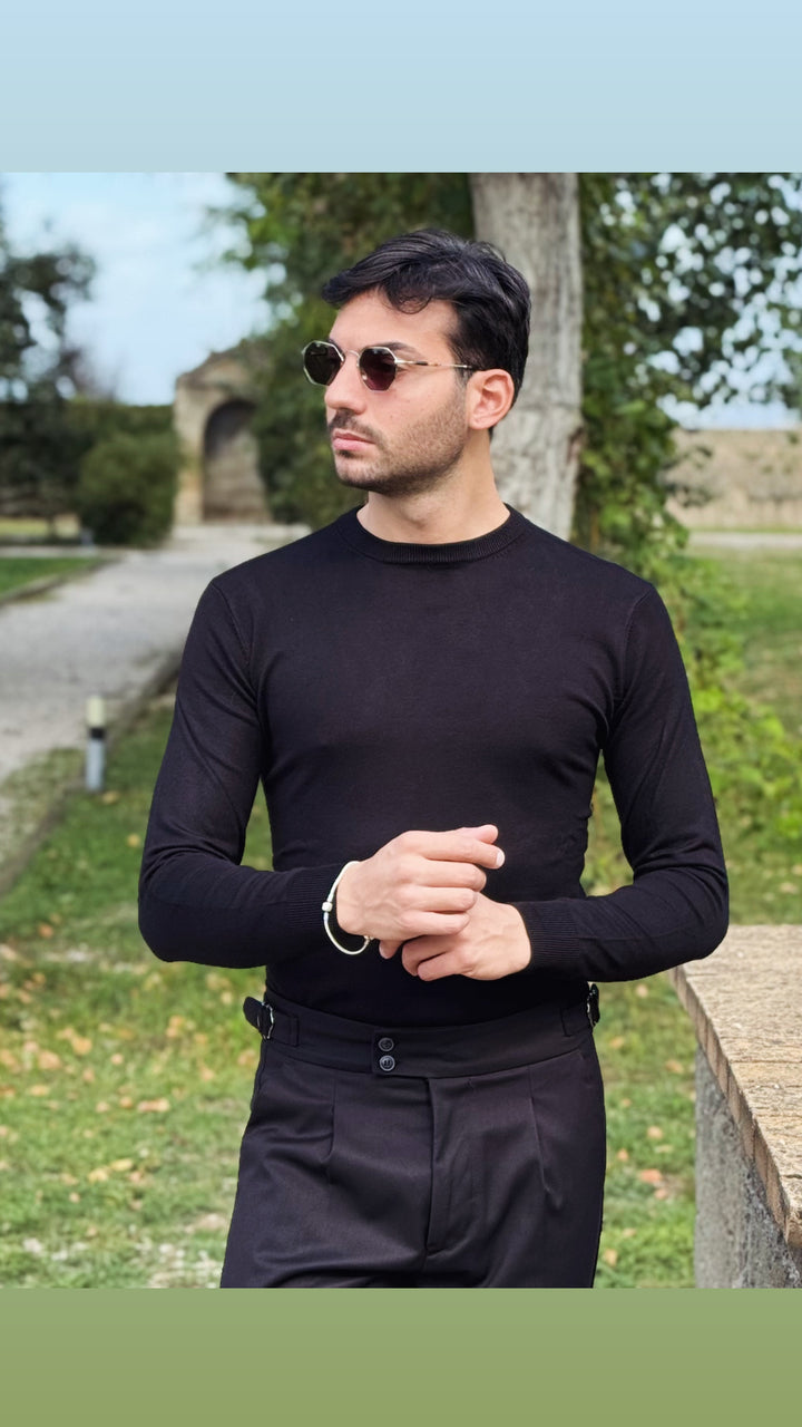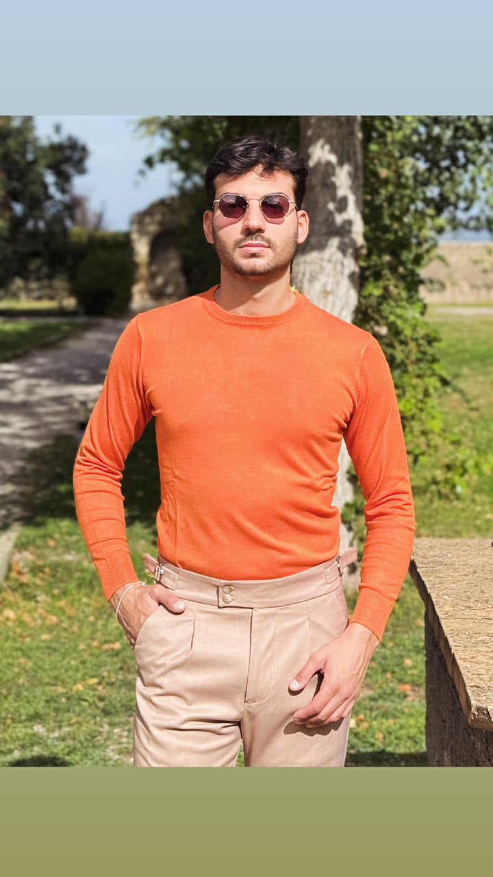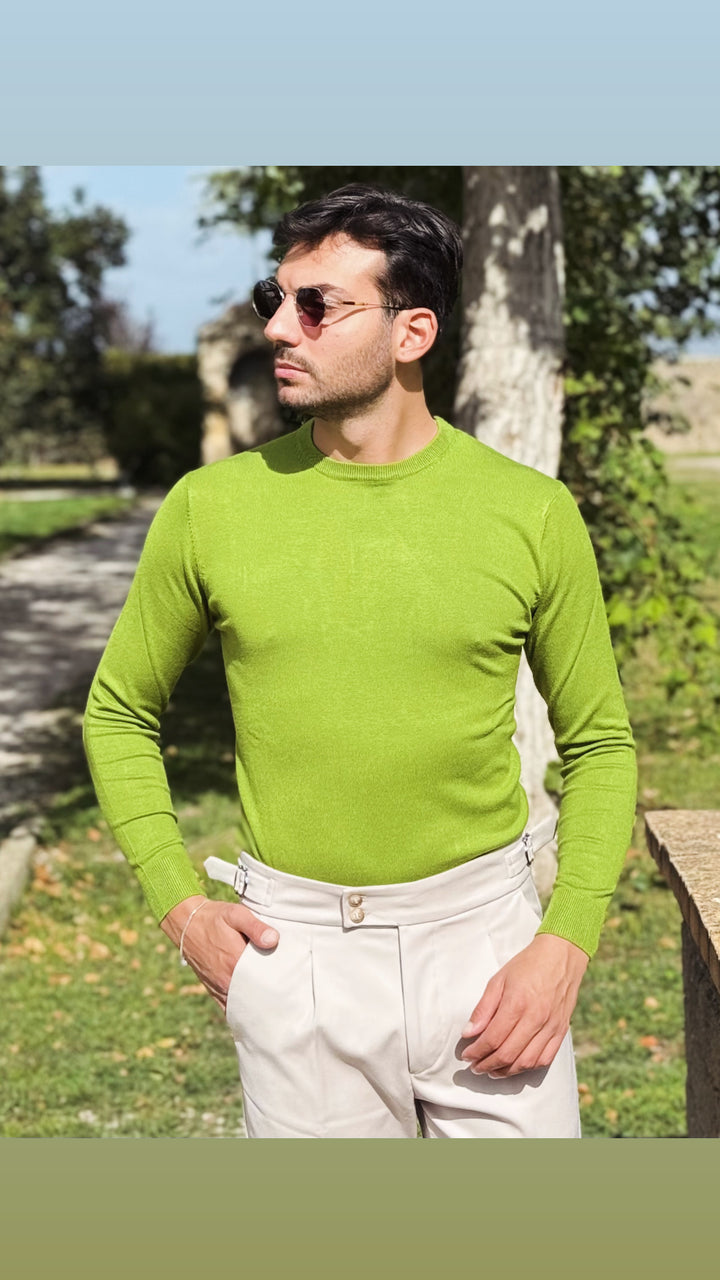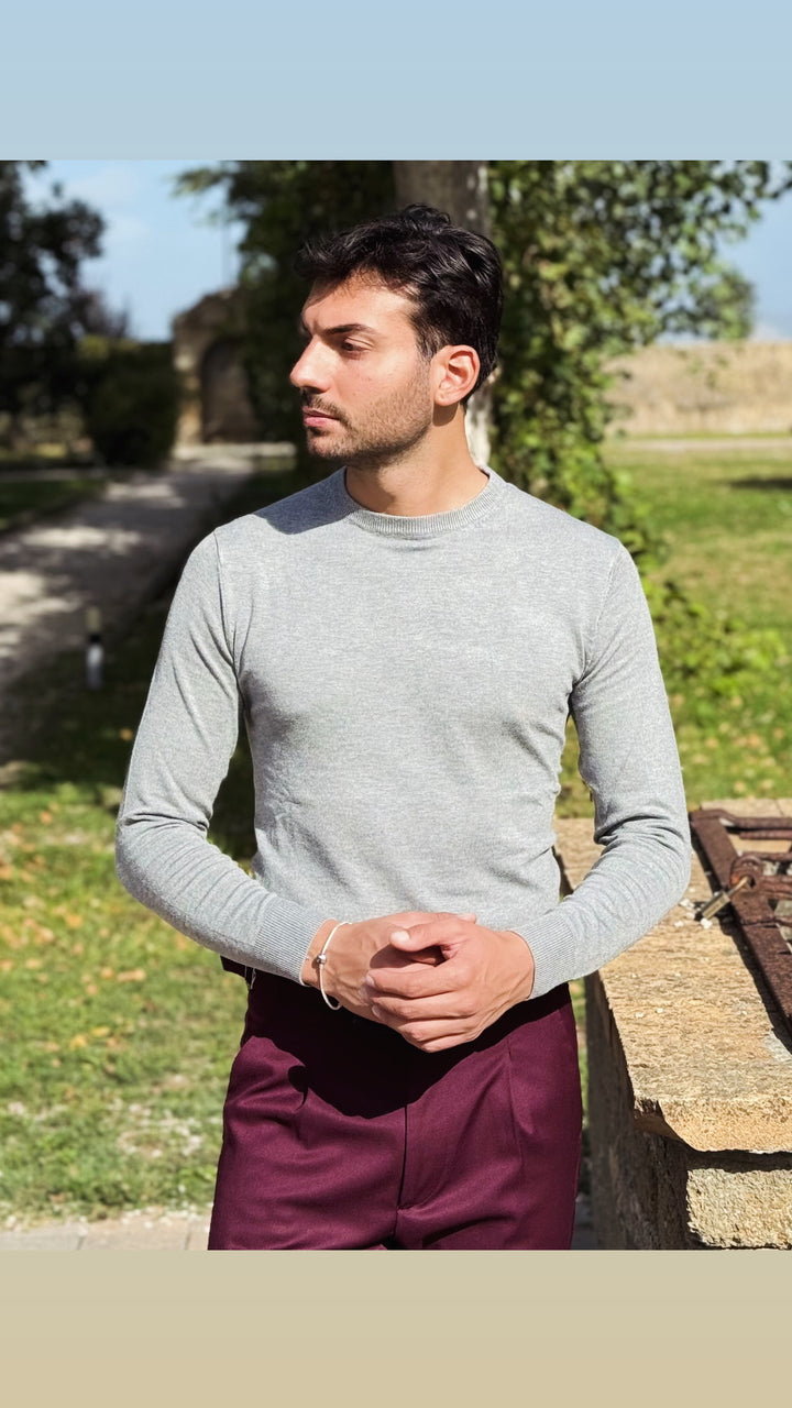 Maglione girocollo in lana rasata, disponibile in diverse colorazioni, vestibilità slim. Il modello 1,76 per 73kg indossa M
