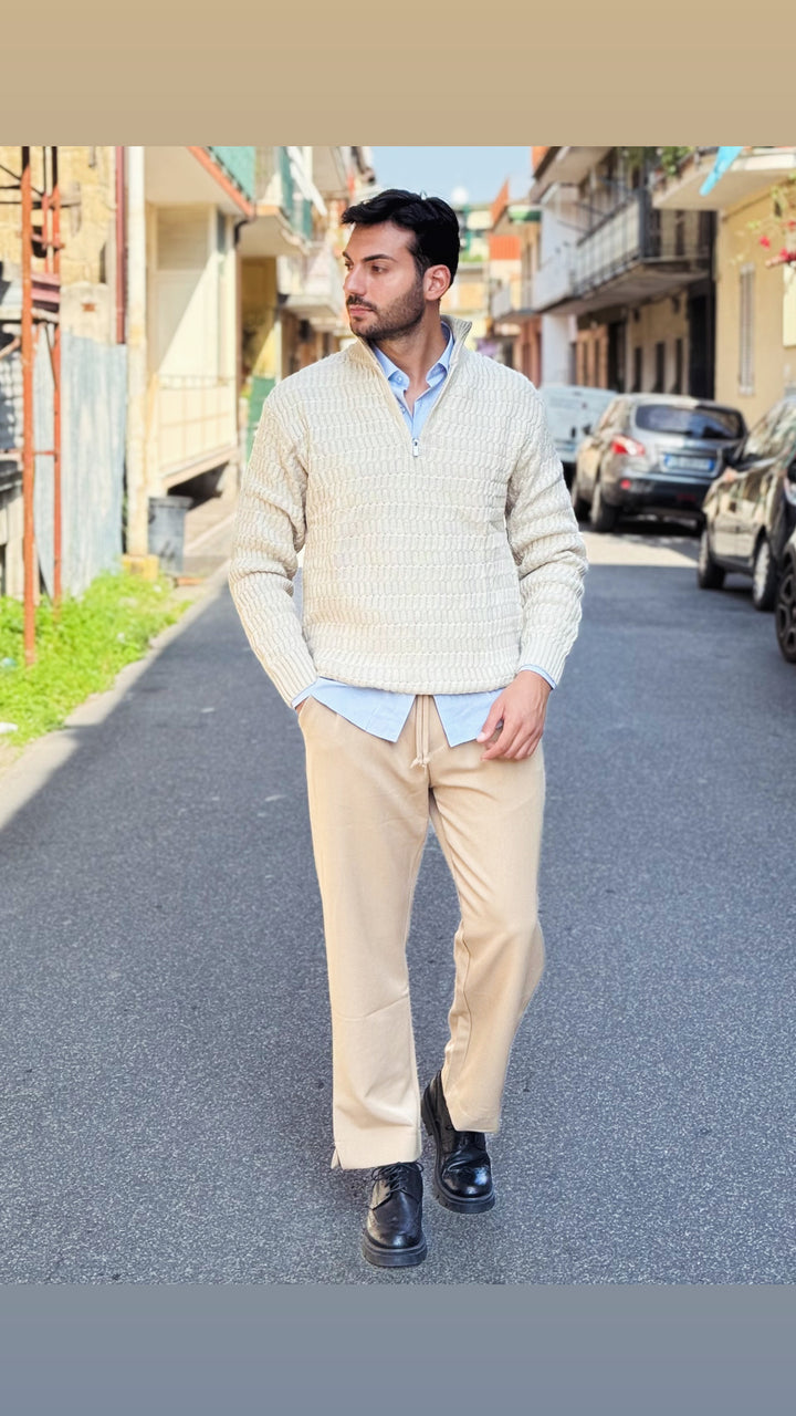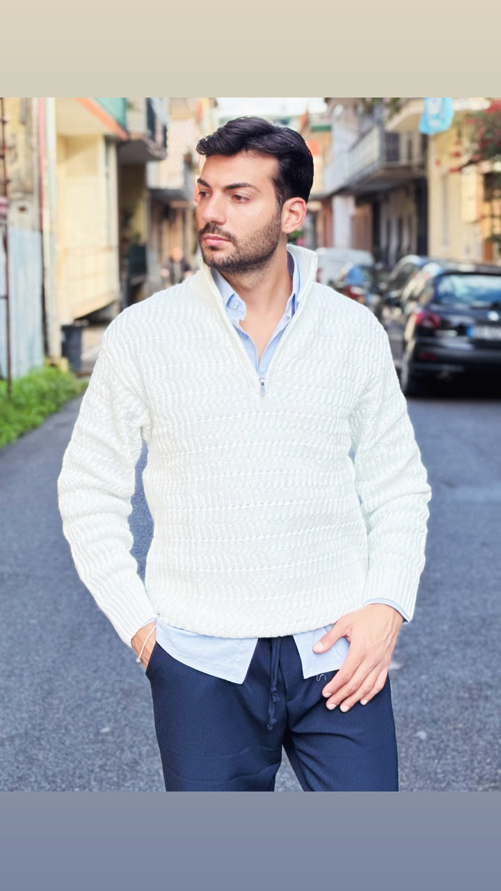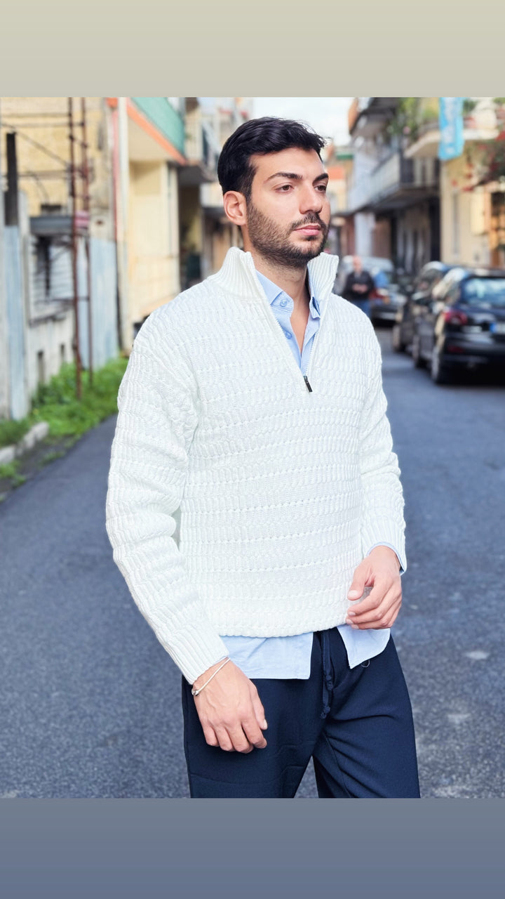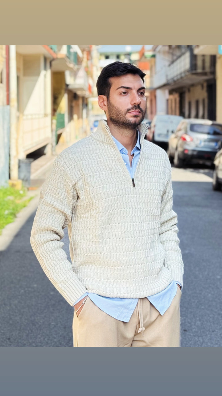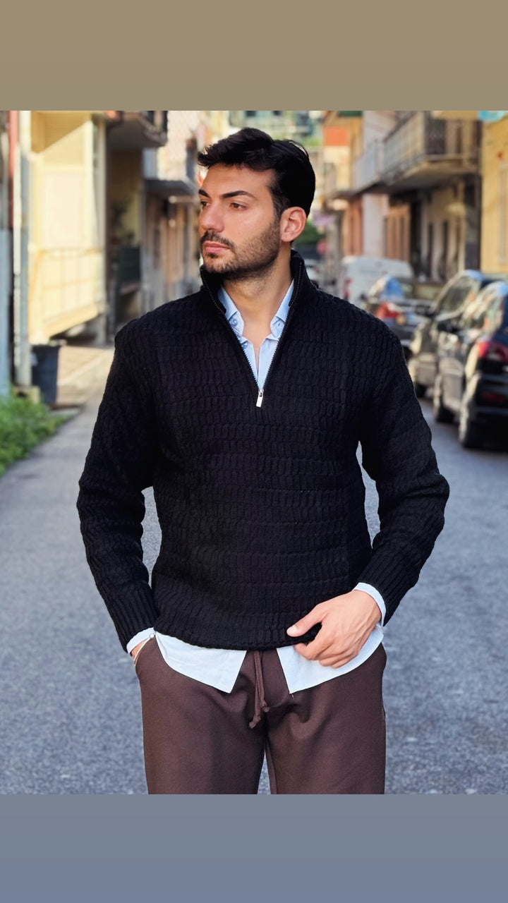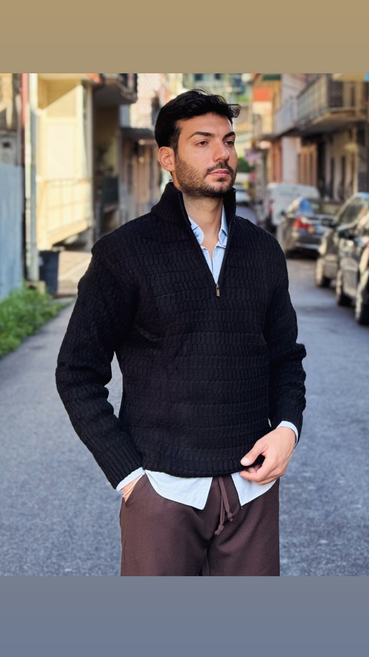 Maglione a collo alto con mezza zip in metallo, tramatura ad intreccio, in un tessuto caldo per questo inverno. Vestibilità slim, il modello 1.76 per 73kg indossa M