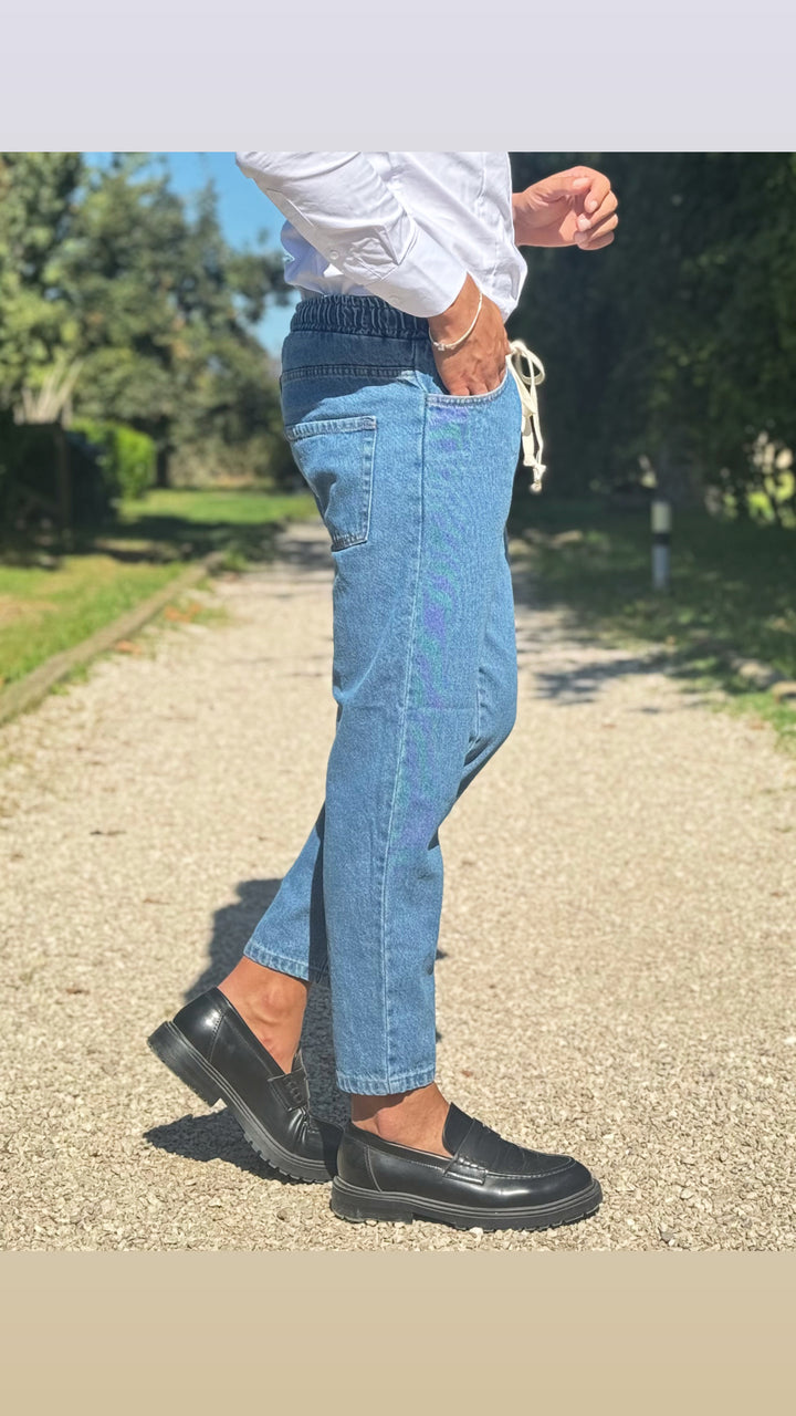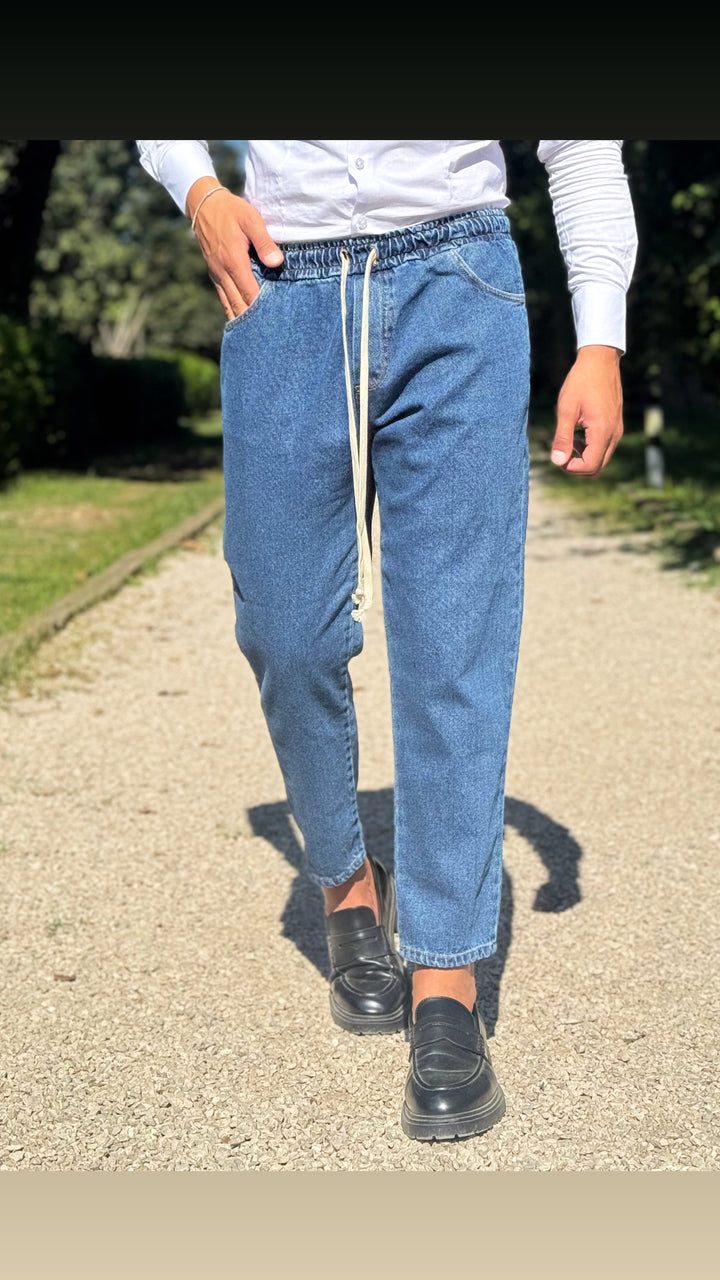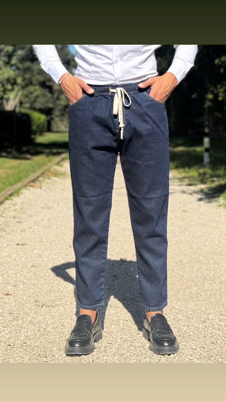 Pantalaccio in tessuto jeans con elastico e laccetti in vita. Vestibilità regolare, il modello 1,76 per 73kg indossa M